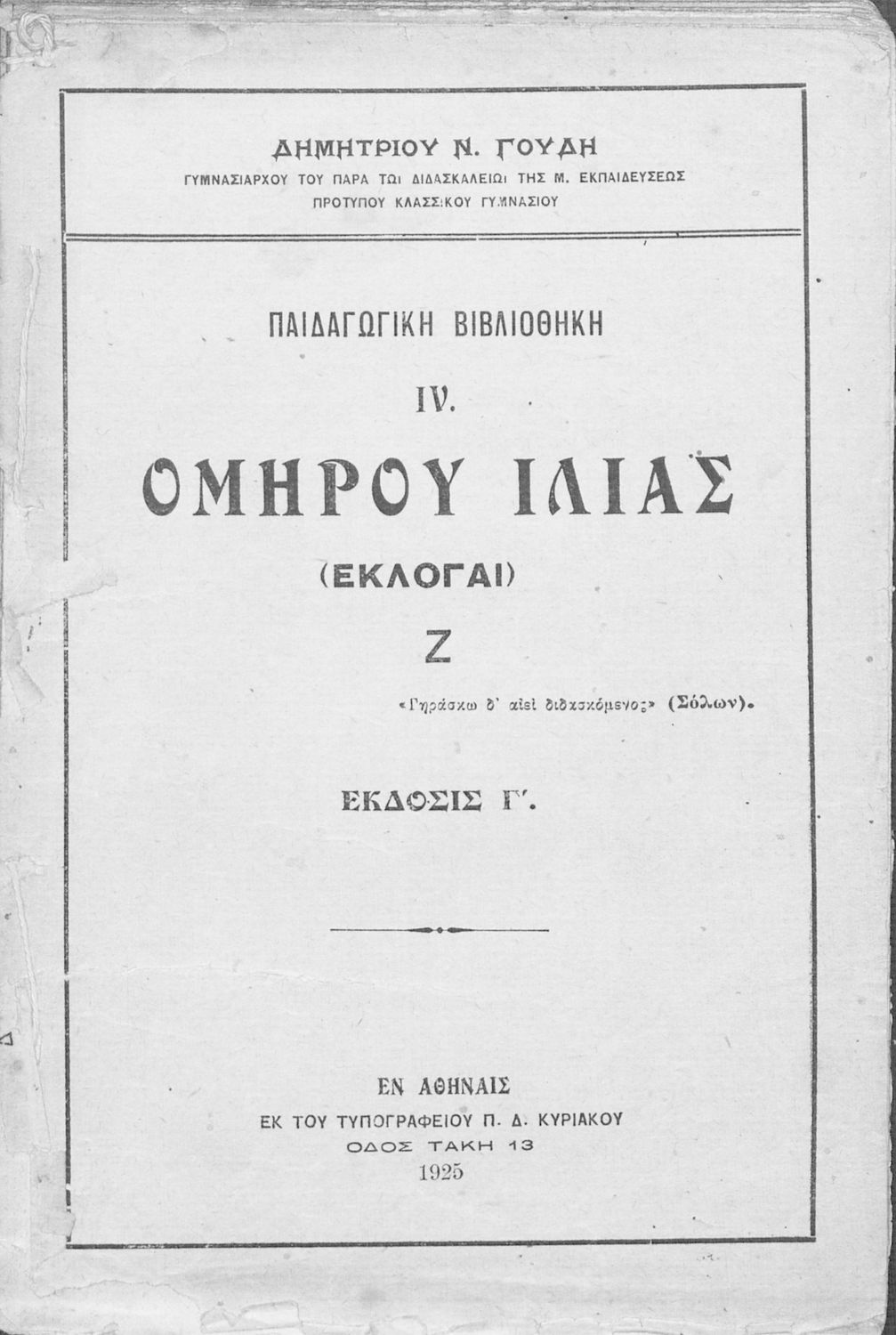 Κωδικός αναγνώρισης: 02-01789 Τίτλος: Ομήρου Ιλιάς (εκλογαί) Ζ΄ Συγγραφέας: Όμηρος, Δημήτριος Ν. Γουδής (σχόλια) Μέγεθος και υπόστρωμα: Μαθητικό βοήθημα, μαλακό εξώφυλλο, 112 σελίδες. Εικόνες (ασπρόμαυρες), σκίτσα (ασπρόμαυρα), χάρτες (ασπρόμαυροι). |