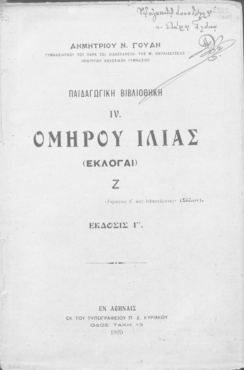 Εντοπισμός πρωτοτύπου: Ελληνικό Λογοτεχνικό και Ιστορικό Αρχείο Κωδικός βιβλιοθήκης: 1925 ΟΜΗ |