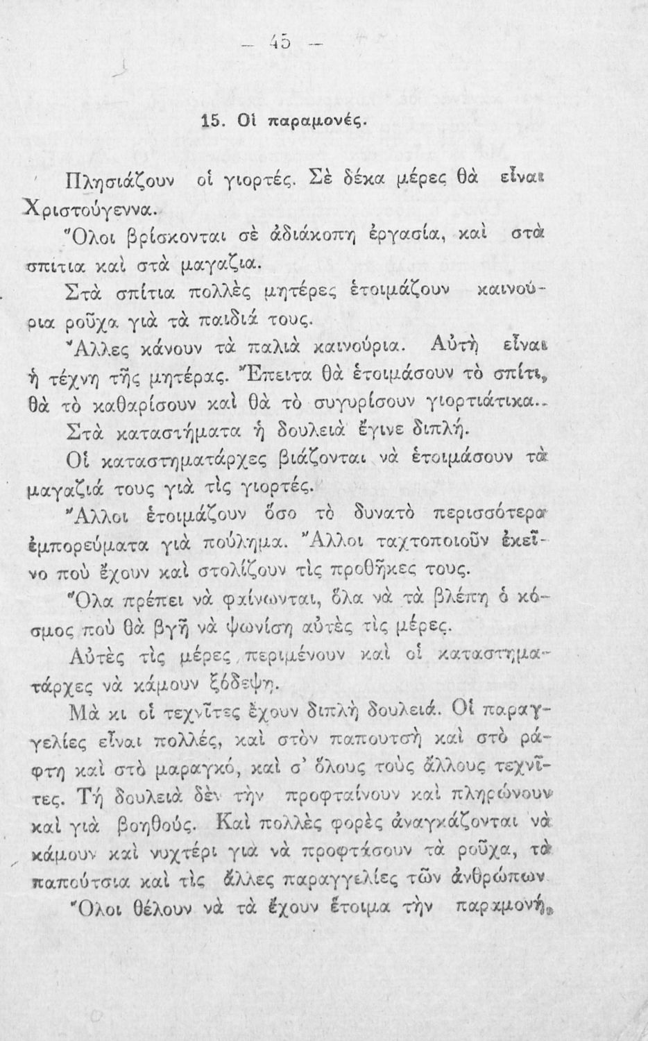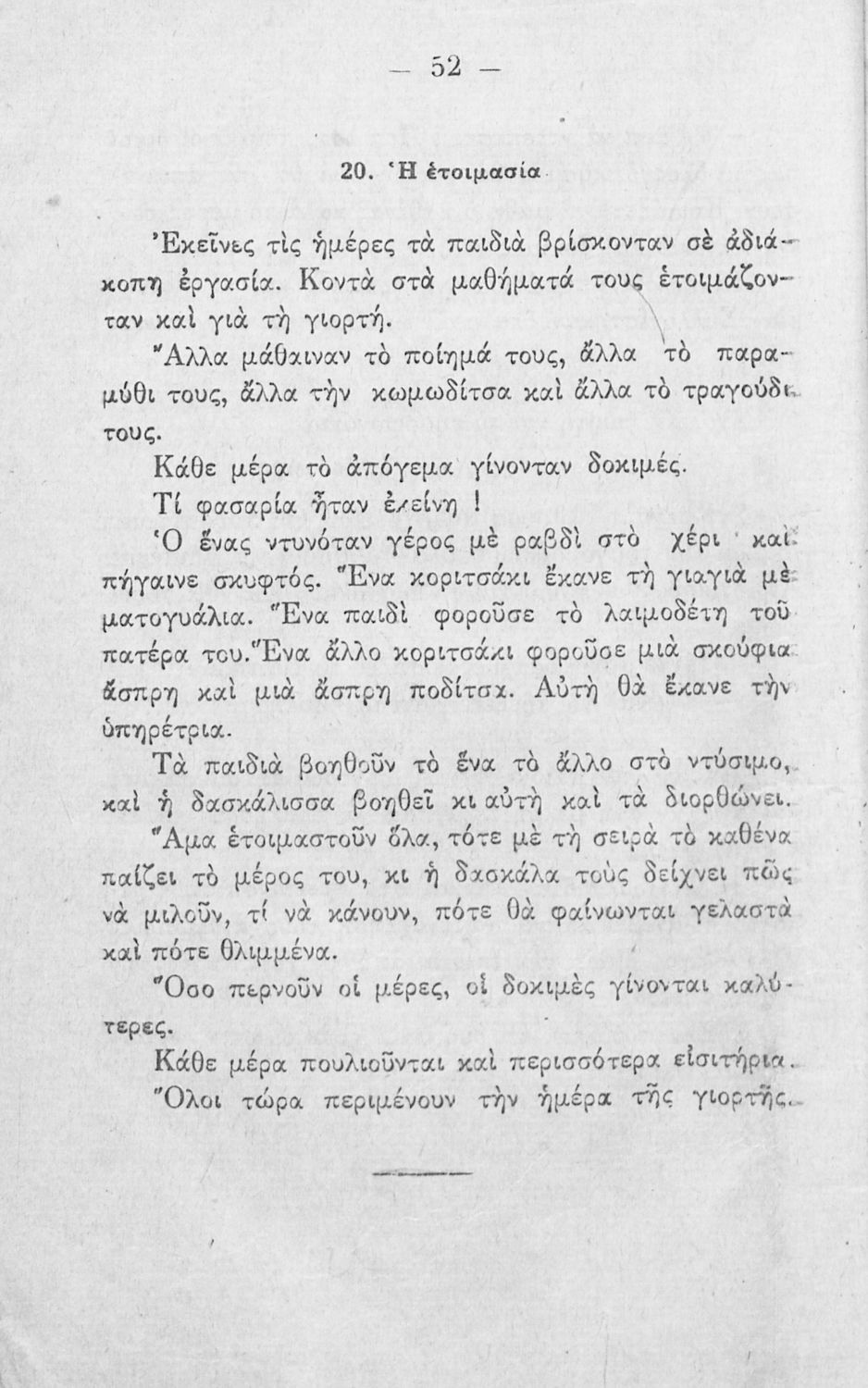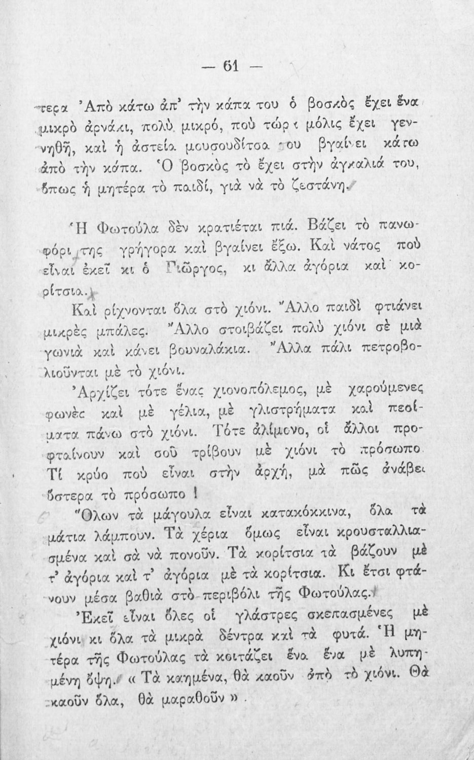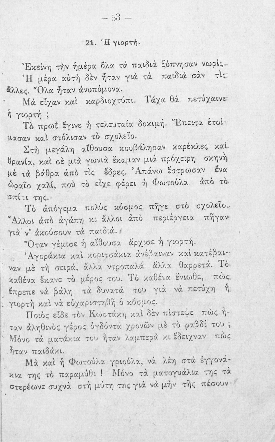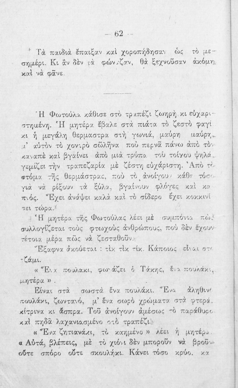 Αναγνωστικό Β' Δημοτικού που περιλαμβάνει μικρά διηγήματα και ποιήματα με περιεχόμενο από την οικογενειακή και κοινωνική ζωή, την ελληνική φύση, την ελληνική ιστορία και μυθολογία και την υγιεινή.