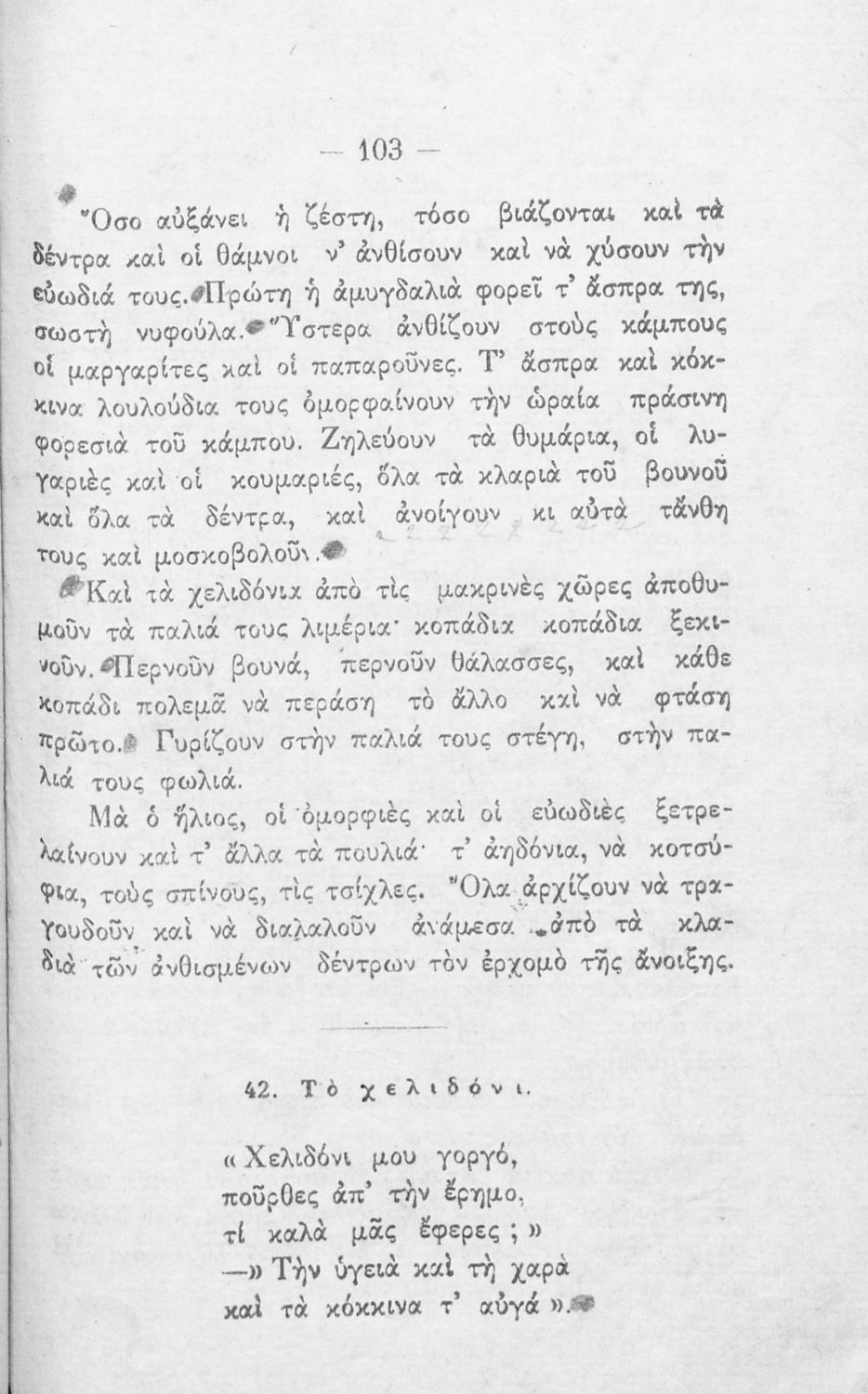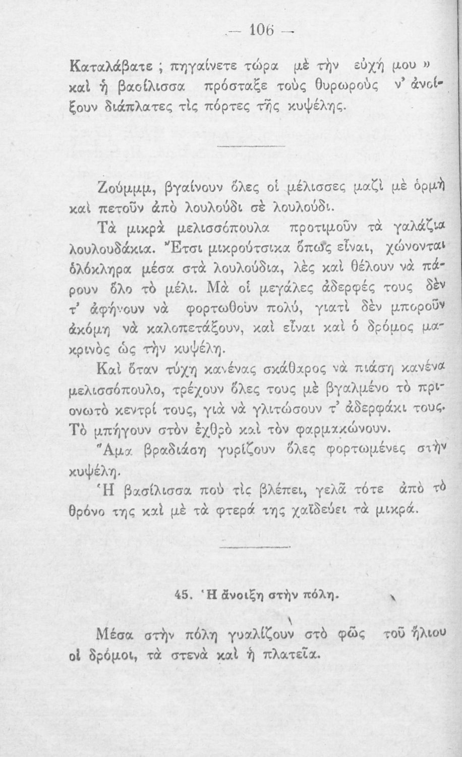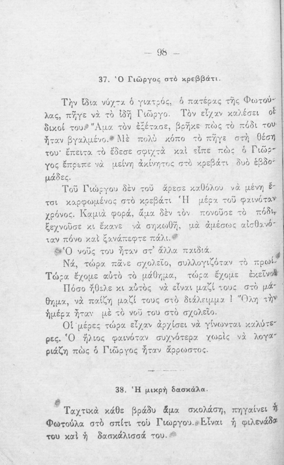 Αναγνωστικό Β' Δημοτικού που περιλαμβάνει μικρά διηγήματα και ποιήματα με περιεχόμενο από την οικογενειακή και κοινωνική ζωή, την ελληνική φύση, την ελληνική ιστορία και μυθολογία και την υγιεινή.