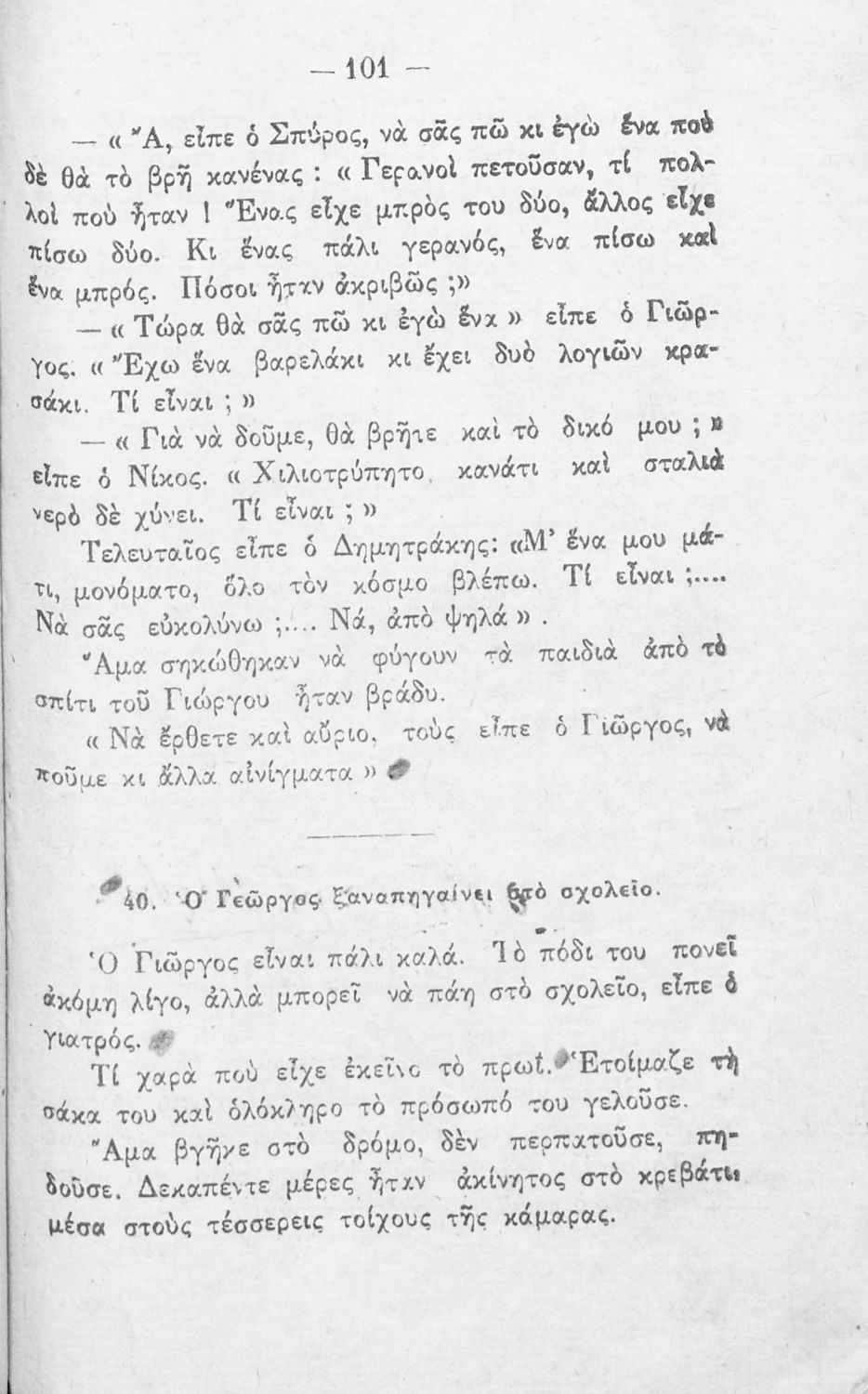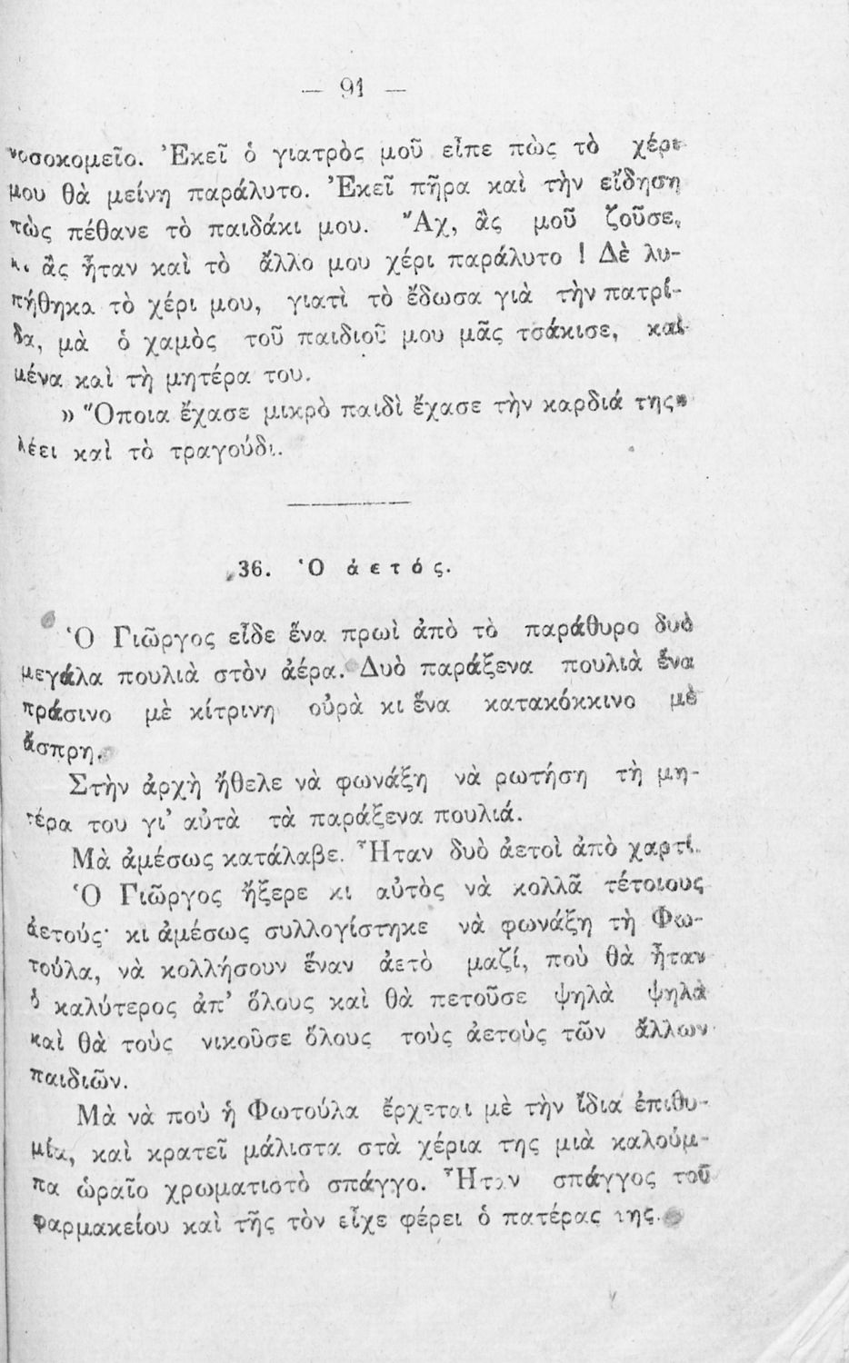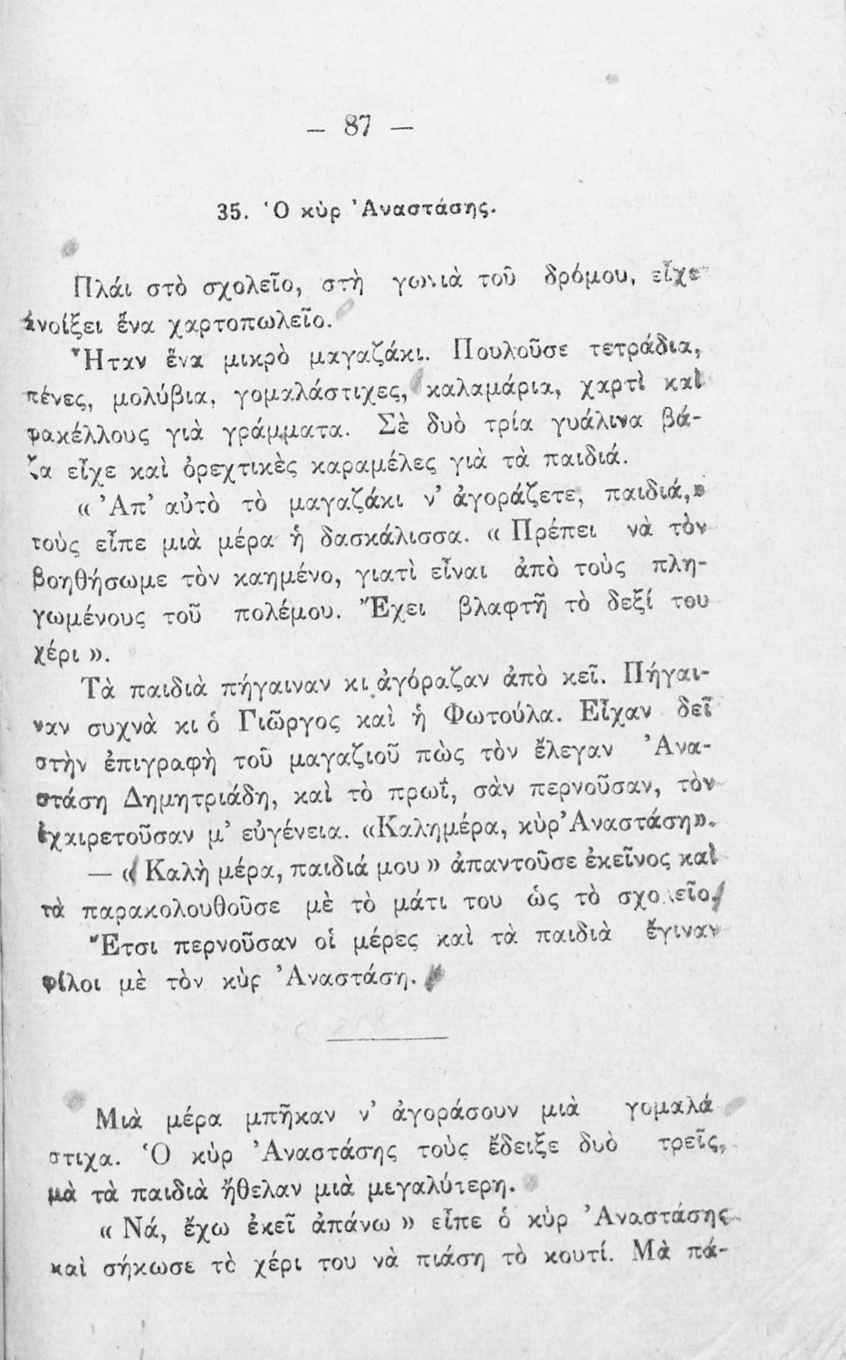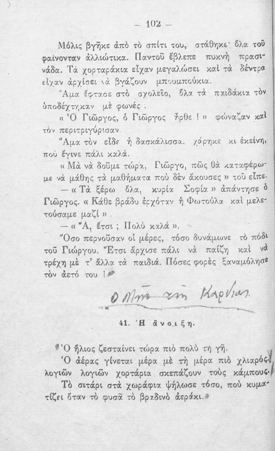 Αναγνωστικό Β' Δημοτικού που περιλαμβάνει μικρά διηγήματα και ποιήματα με περιεχόμενο από την οικογενειακή και κοινωνική ζωή, την ελληνική φύση, την ελληνική ιστορία και μυθολογία και την υγιεινή.