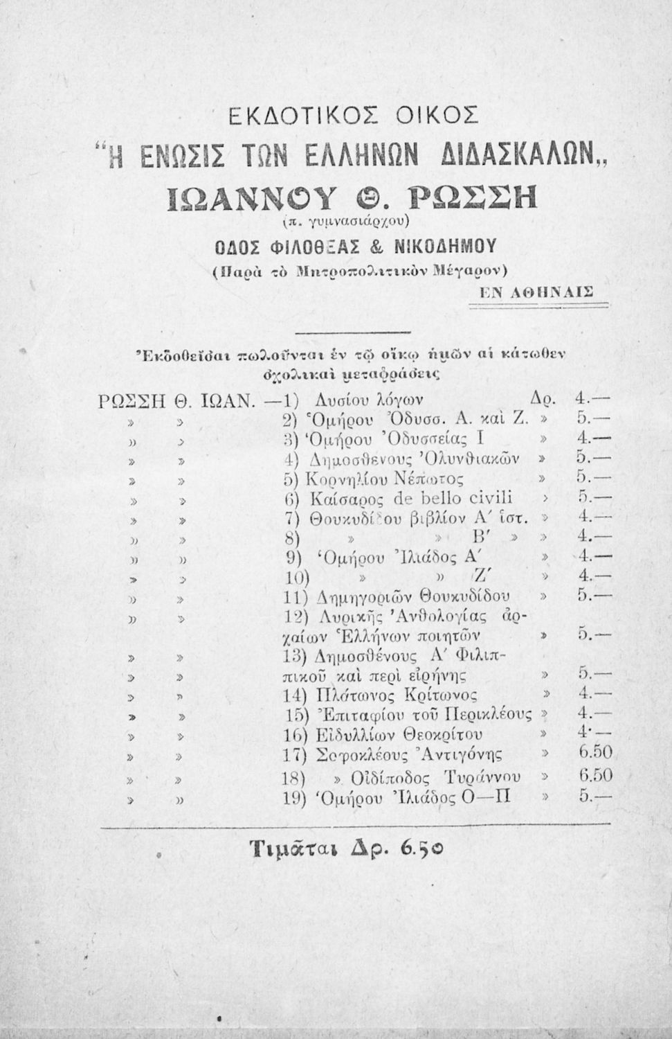 Εκδότης: Ιωάννης Θ. Ρώσσης Έτος έκδοσης: 1925 Τόπος έκδοσης: Αθήνα |