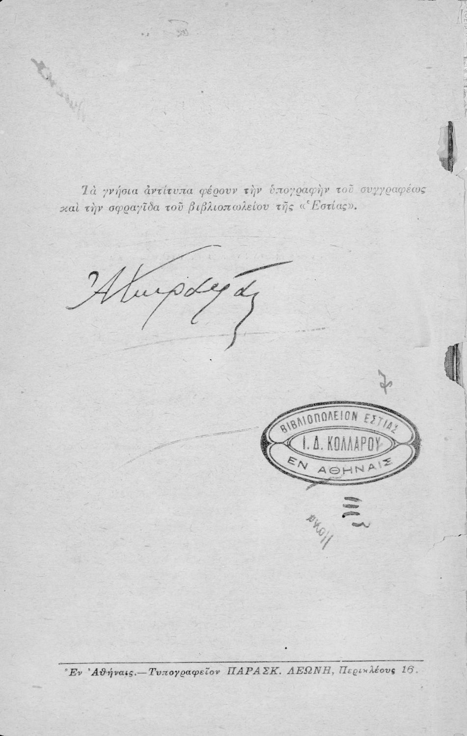 Εκδότης: Ιωάννης Δ. Κολλάρος και ΣΙΑ, Βιβλιοπωλείο της "Εστίας"