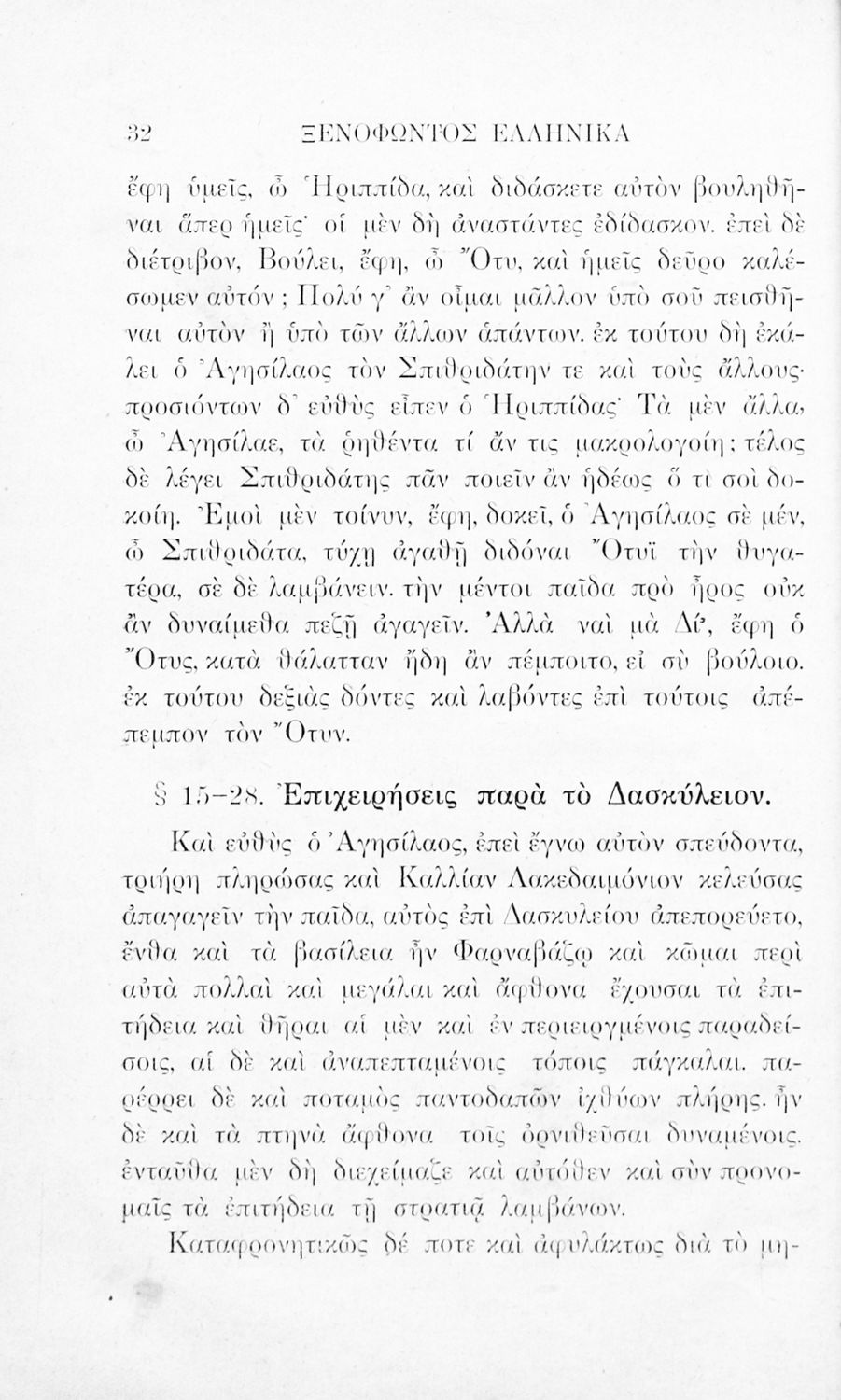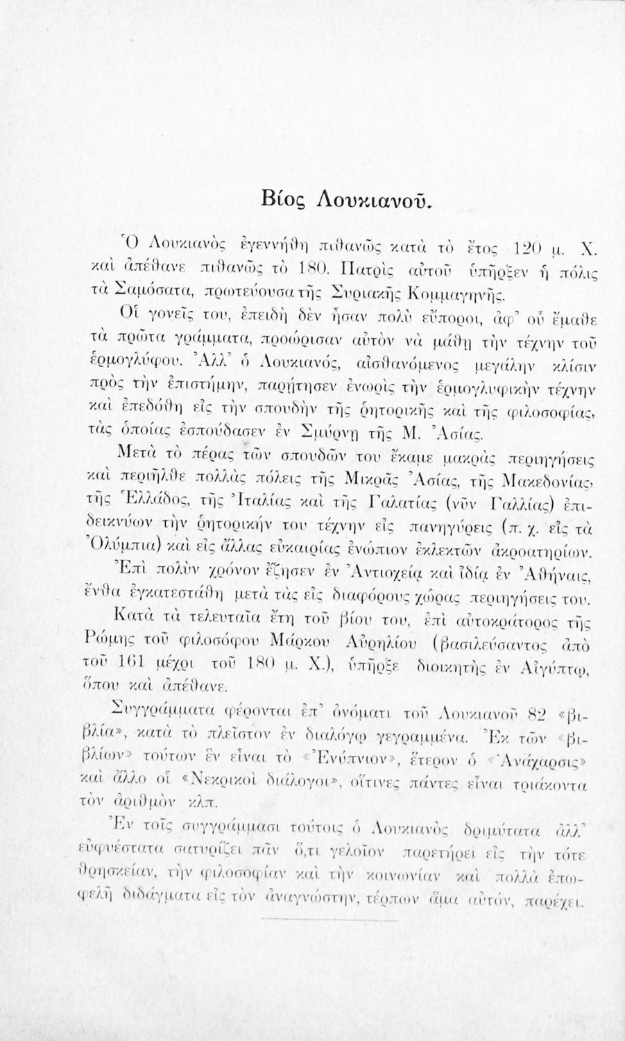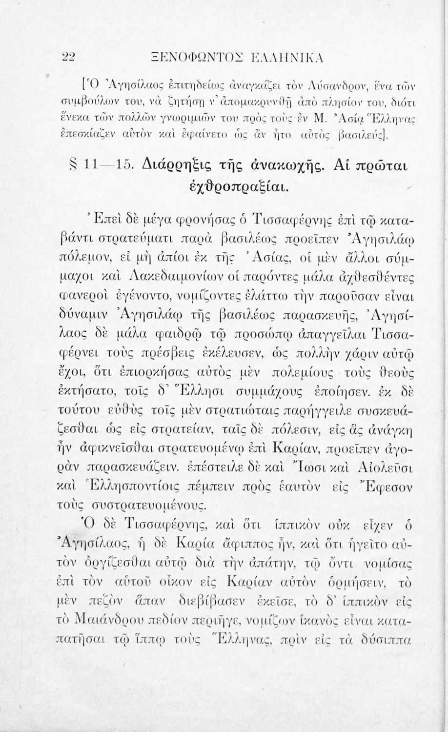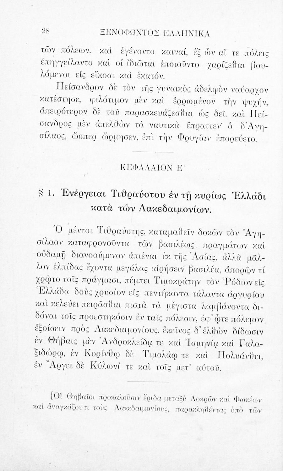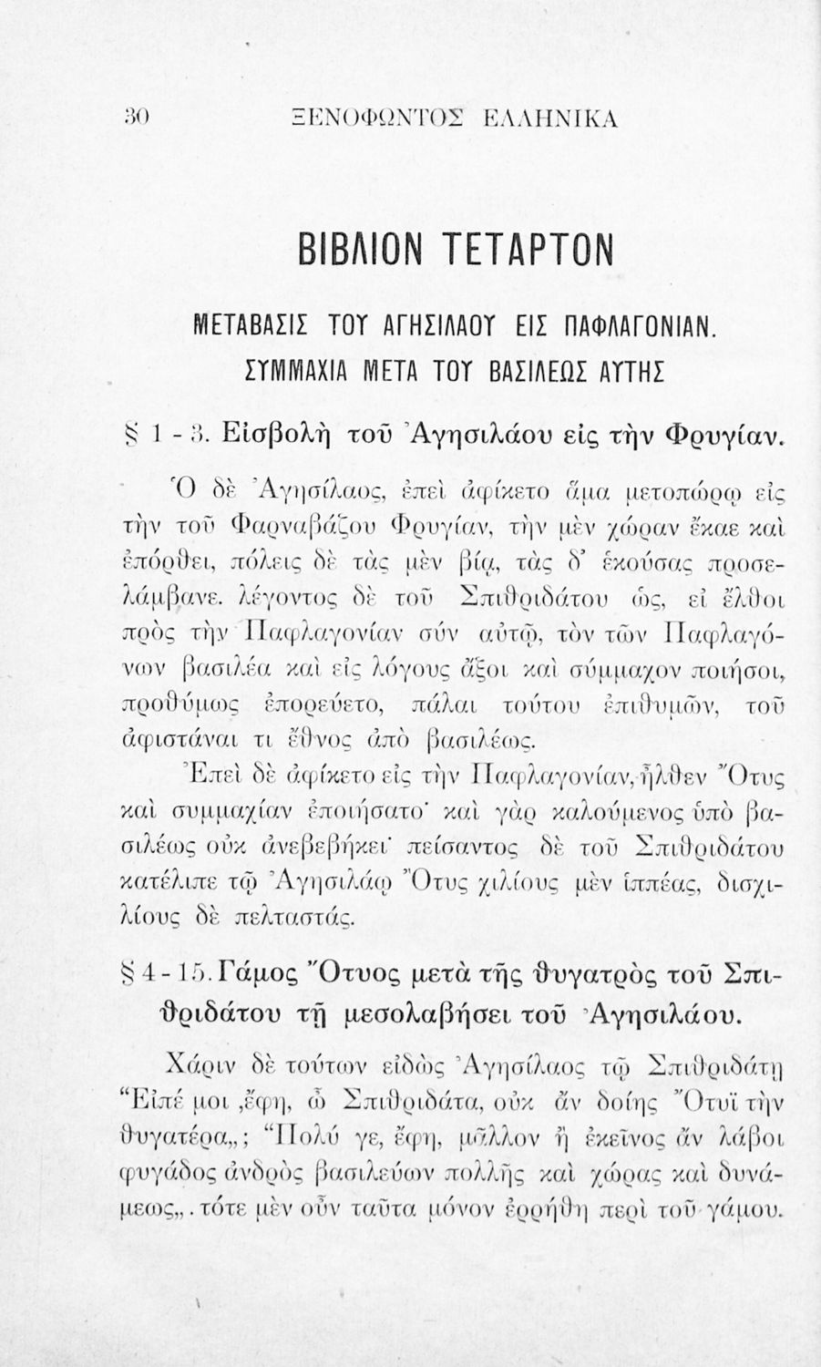 Σχολικό εγχειρίδιο Αρχαίων Ελληνικών που περιλαμβάνει αποσπάσματα από το έργο του Ξενοφώντα Ελληνικά και τα έργα του Λουκιανού Ενύπνιον και Ανάχαρσις, βιογραφικά σημειώματα των συγγραφέων, ερμηνευτικές και πραγματολογικές σημειώσεις.