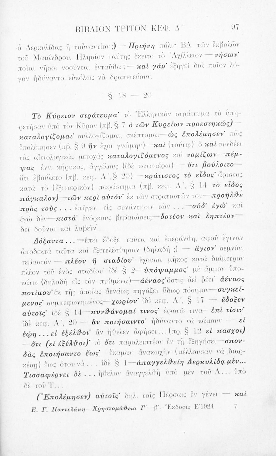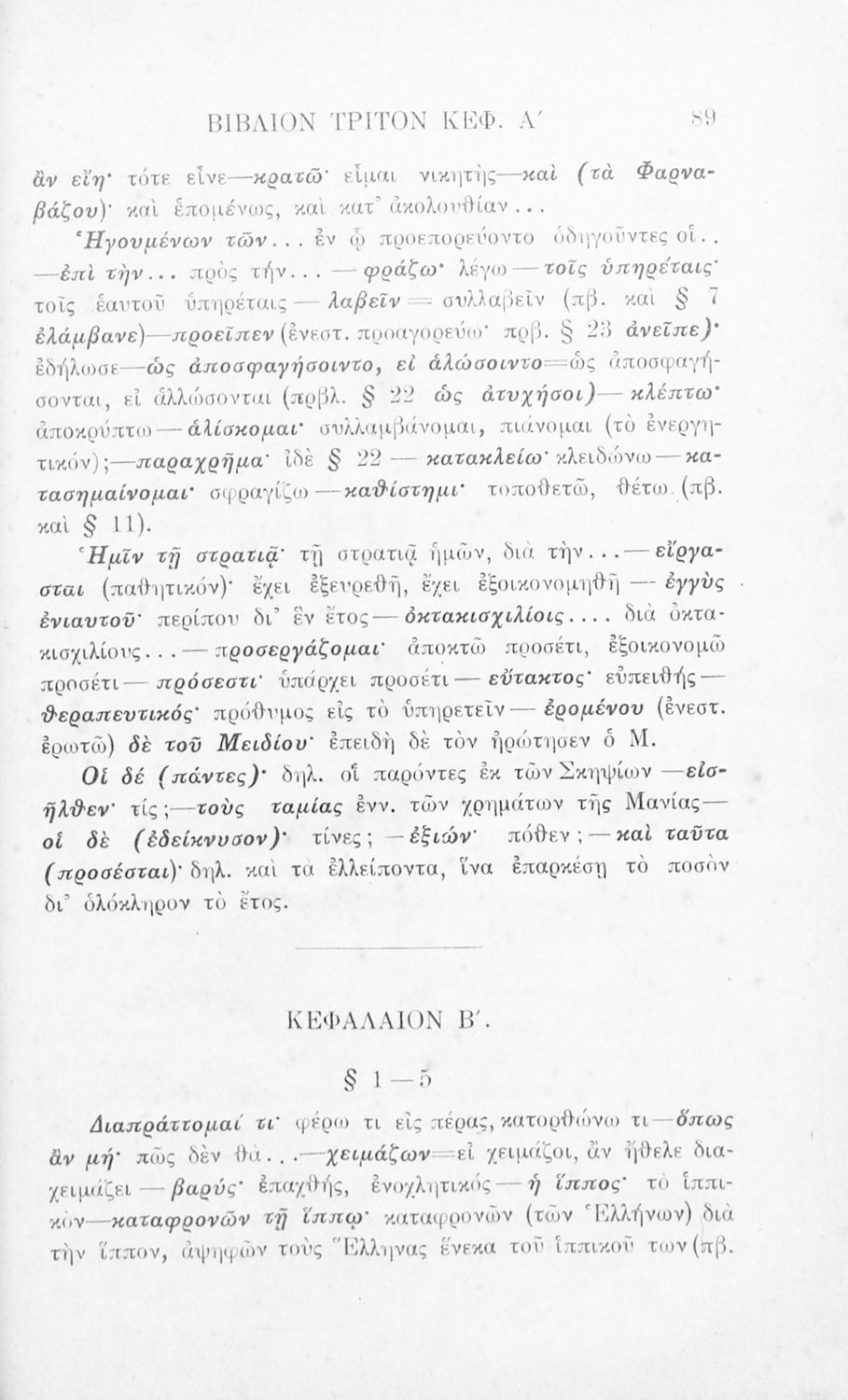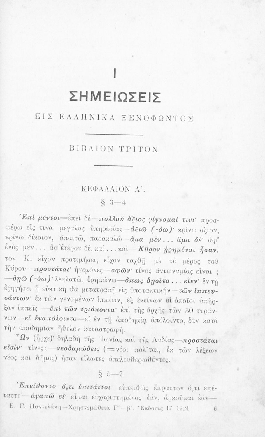 Σχολικό εγχειρίδιο Αρχαίων Ελληνικών που περιλαμβάνει αποσπάσματα από το έργο του Ξενοφώντα Ελληνικά και τα έργα του Λουκιανού Ενύπνιον και Ανάχαρσις, βιογραφικά σημειώματα των συγγραφέων, ερμηνευτικές και πραγματολογικές σημειώσεις.