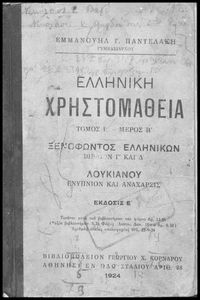 Βαθμίδα εκπαίδευσης: Δευτεροβάθμια Μάθημα: Αρχαία Ελληνικά Γλώσσα: Καθαρεύουσα Παρουσίαση περιεχομένου: Σχολικό εγχειρίδιο Αρχαίων Ελληνικών που περιλαμβάνει αποσπάσματα από το έργο του Ξενοφώντα Ελληνικά και τα έργα του Λουκιανού Ενύπνιον και Ανάχαρσις, βιογραφικά σημειώματα των συγγραφέων, ερμηνευτικές και πραγματολογικές σημειώσεις. |