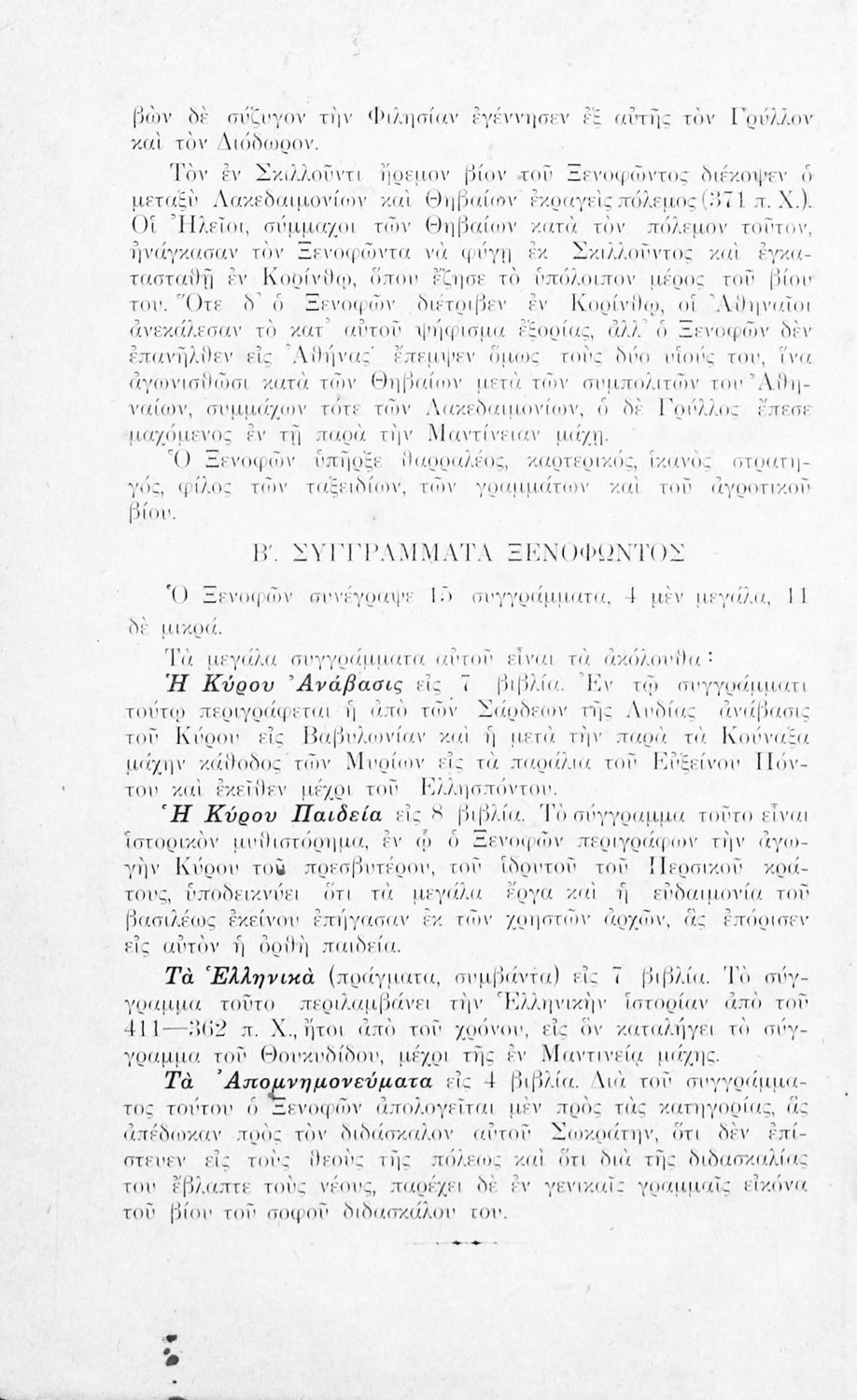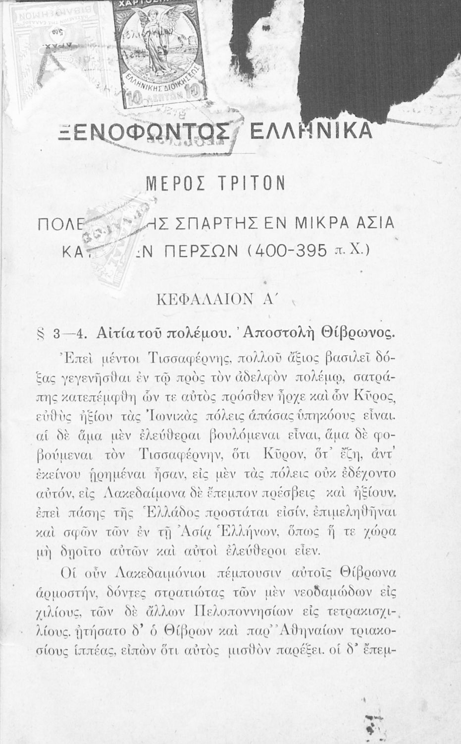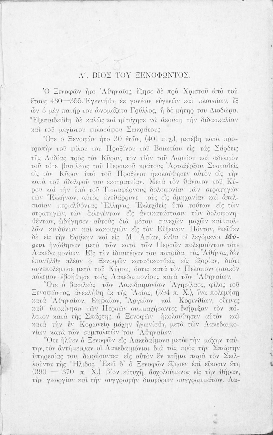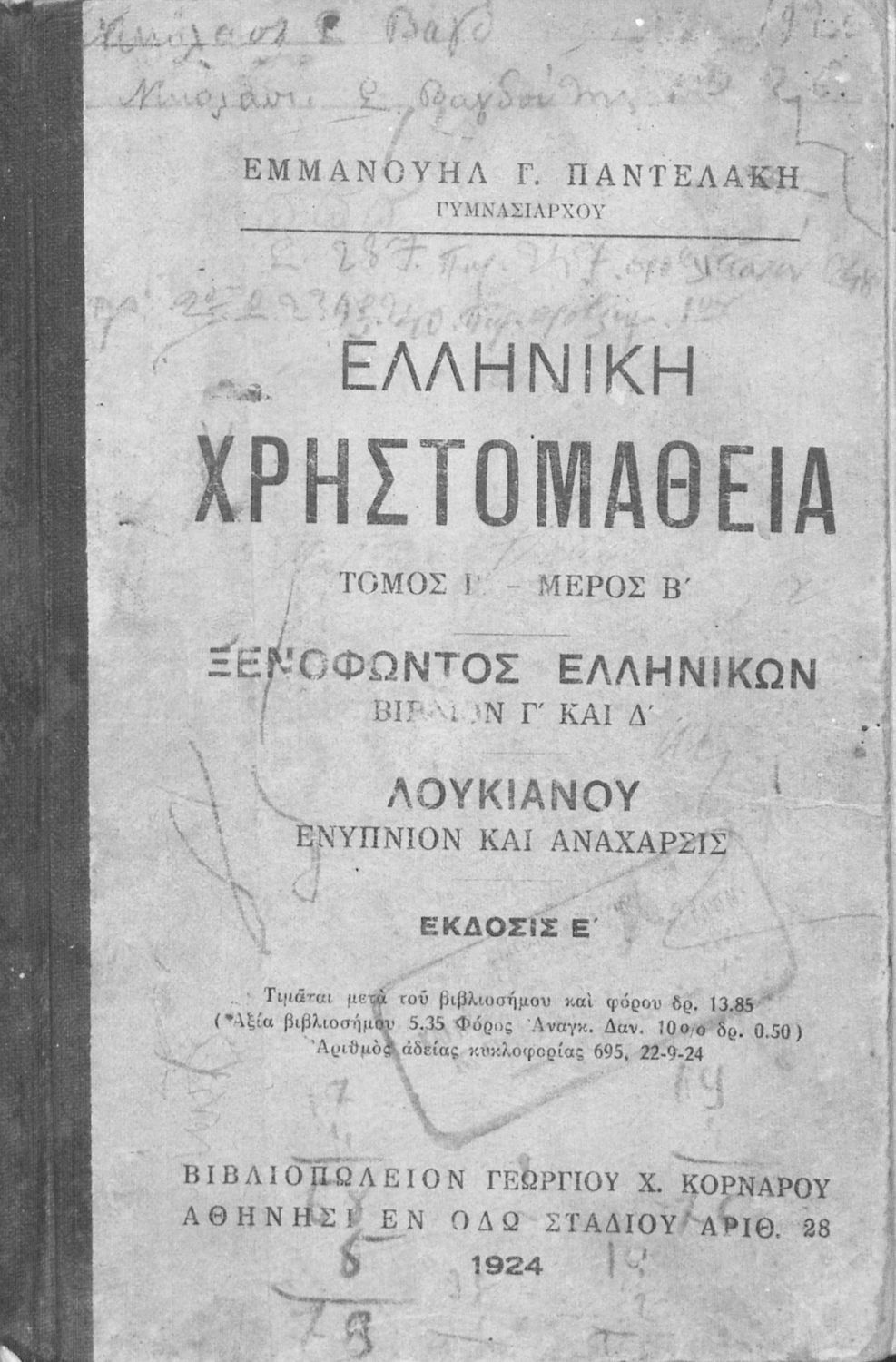 Σχολικό εγχειρίδιο Αρχαίων Ελληνικών που περιλαμβάνει αποσπάσματα από το έργο του Ξενοφώντα Ελληνικά και τα έργα του Λουκιανού Ενύπνιον και Ανάχαρσις, βιογραφικά σημειώματα των συγγραφέων, ερμηνευτικές και πραγματολογικές σημειώσεις.