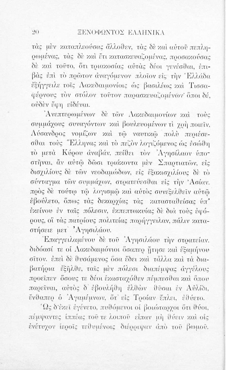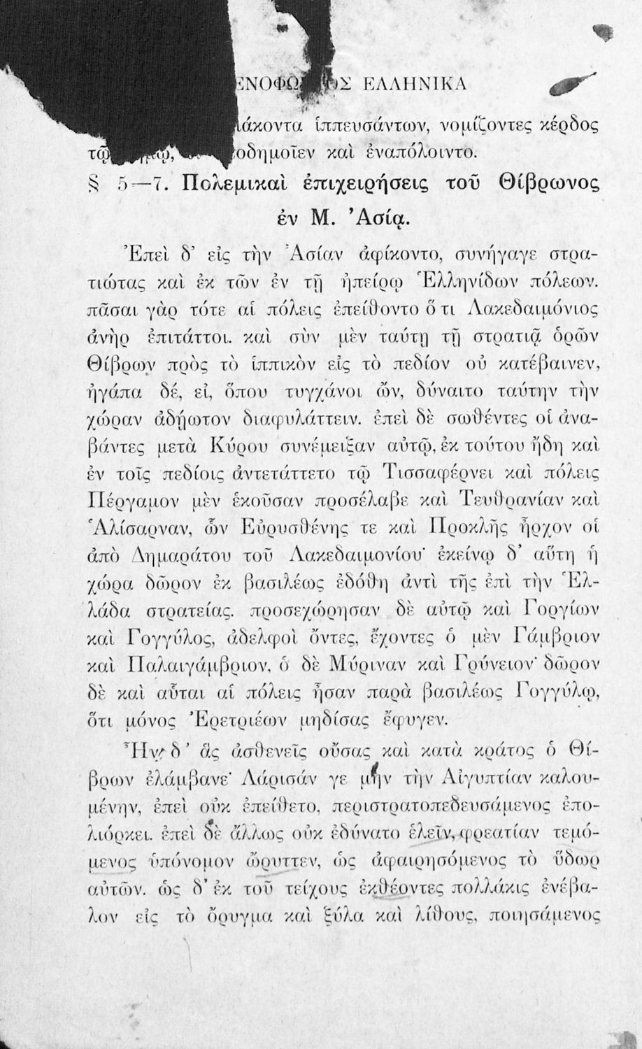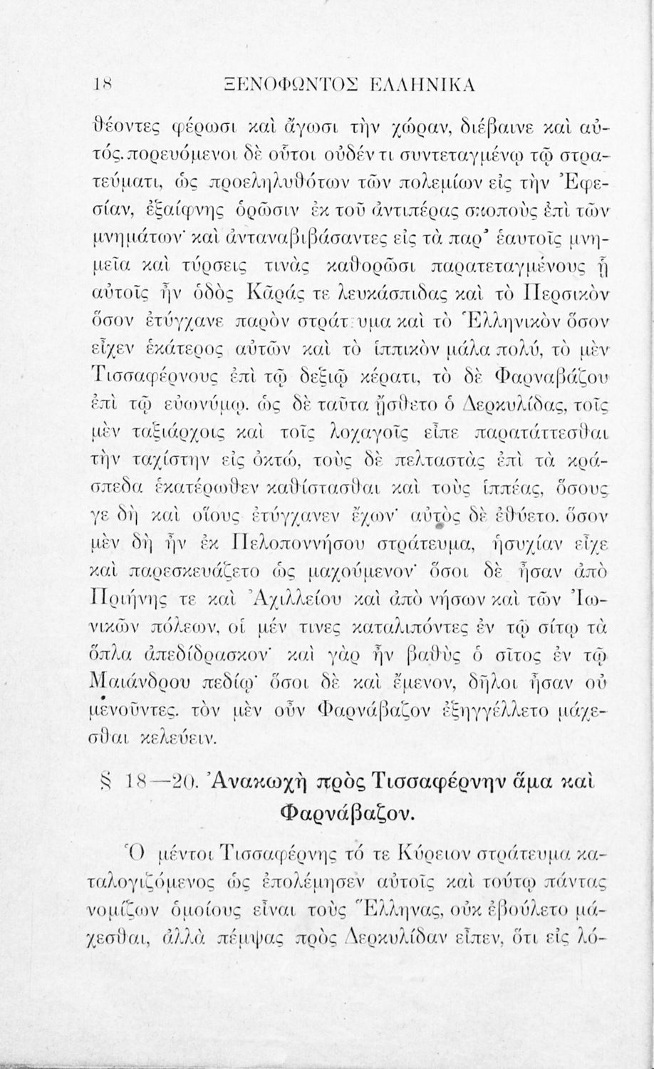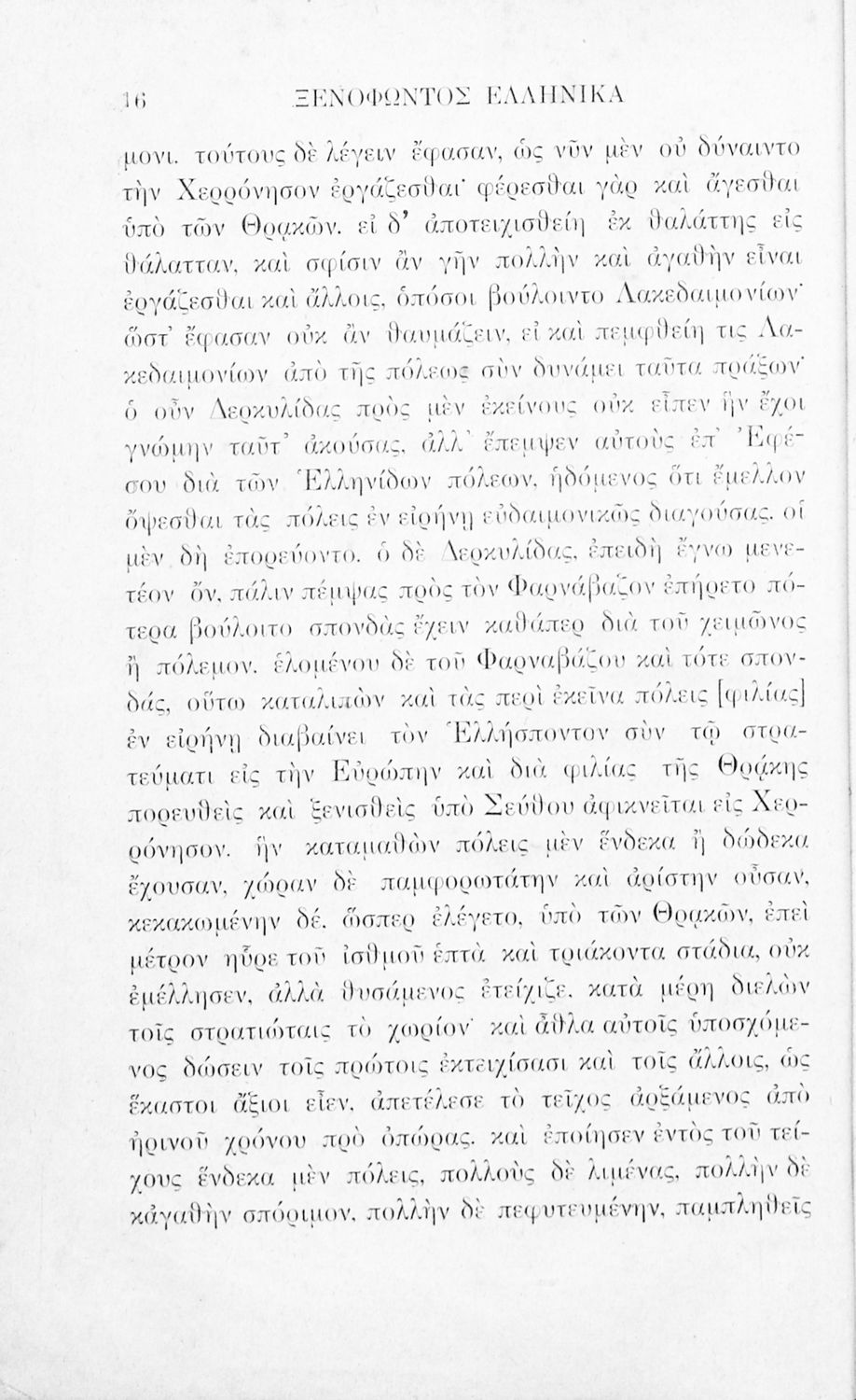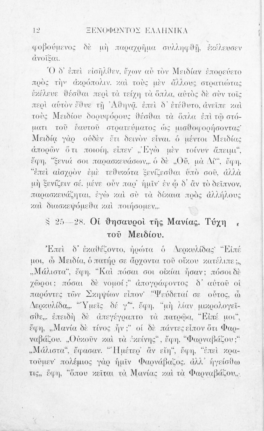 Σχολικό εγχειρίδιο Αρχαίων Ελληνικών που περιλαμβάνει αποσπάσματα από το έργο του Ξενοφώντα Ελληνικά και τα έργα του Λουκιανού Ενύπνιον και Ανάχαρσις, βιογραφικά σημειώματα των συγγραφέων, ερμηνευτικές και πραγματολογικές σημειώσεις.