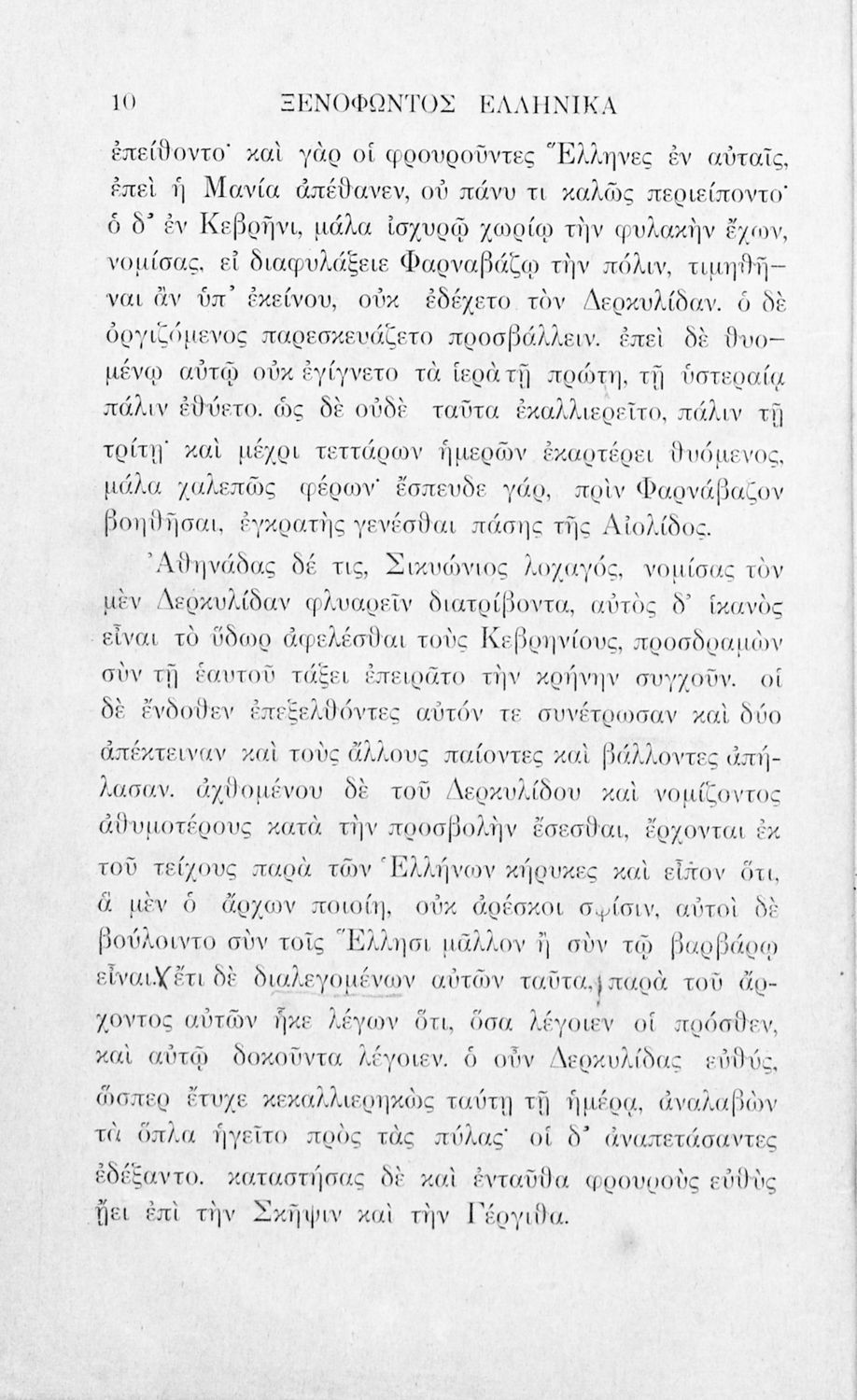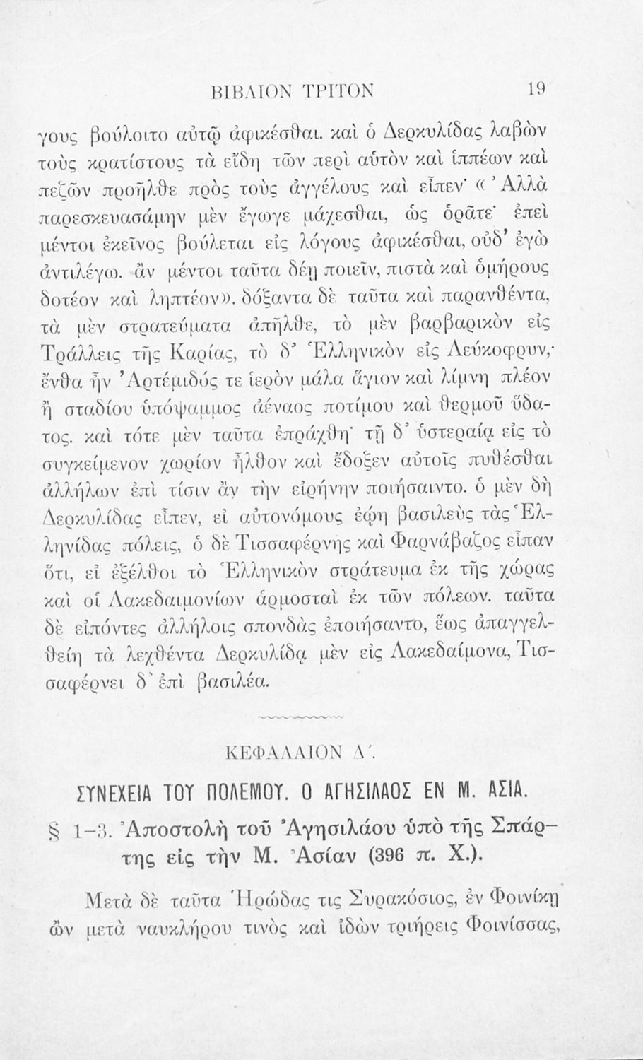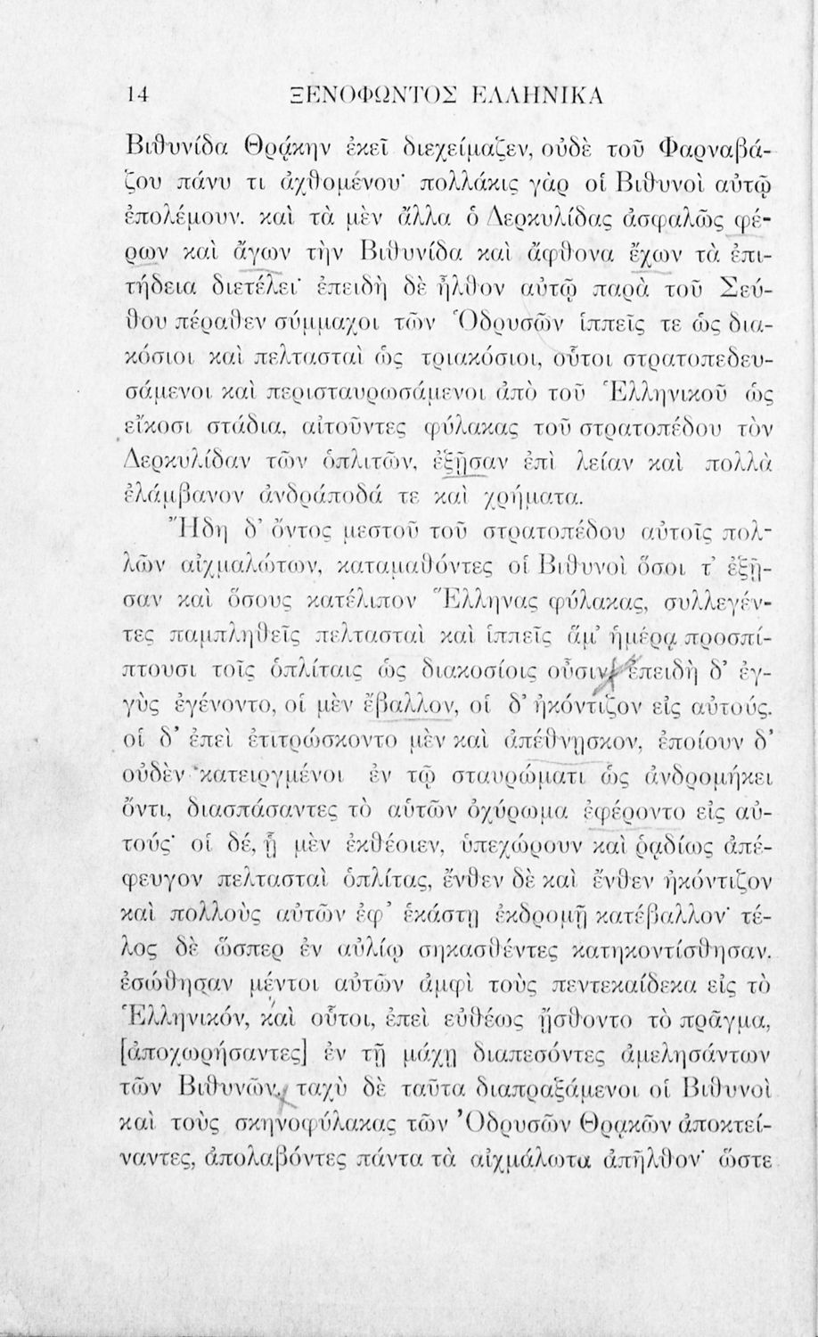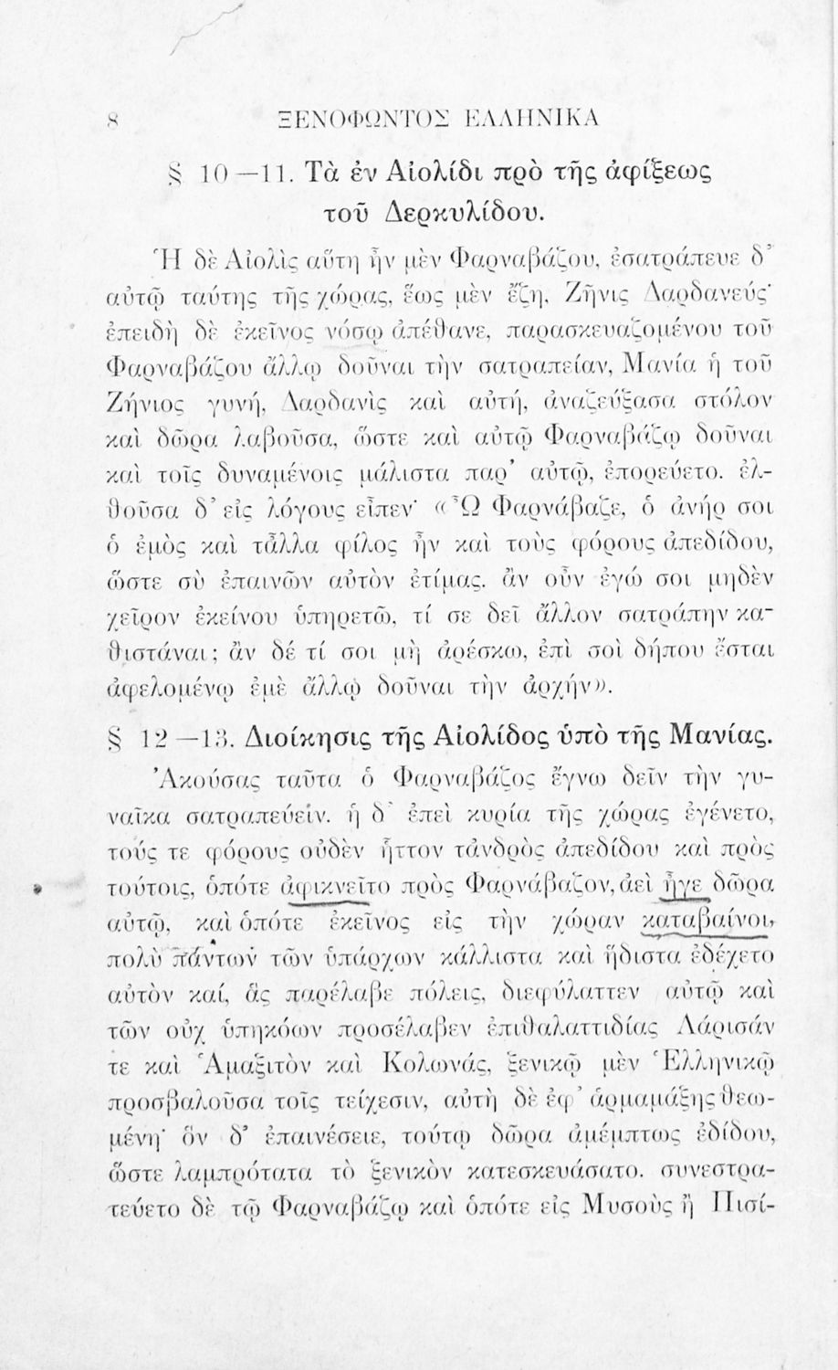 Σχολικό εγχειρίδιο Αρχαίων Ελληνικών που περιλαμβάνει αποσπάσματα από το έργο του Ξενοφώντα Ελληνικά και τα έργα του Λουκιανού Ενύπνιον και Ανάχαρσις, βιογραφικά σημειώματα των συγγραφέων, ερμηνευτικές και πραγματολογικές σημειώσεις.
