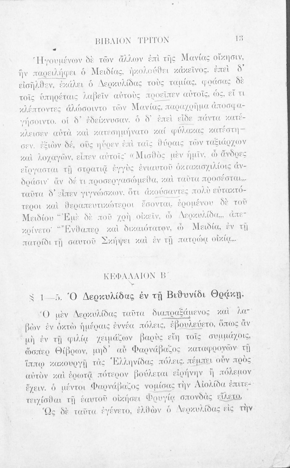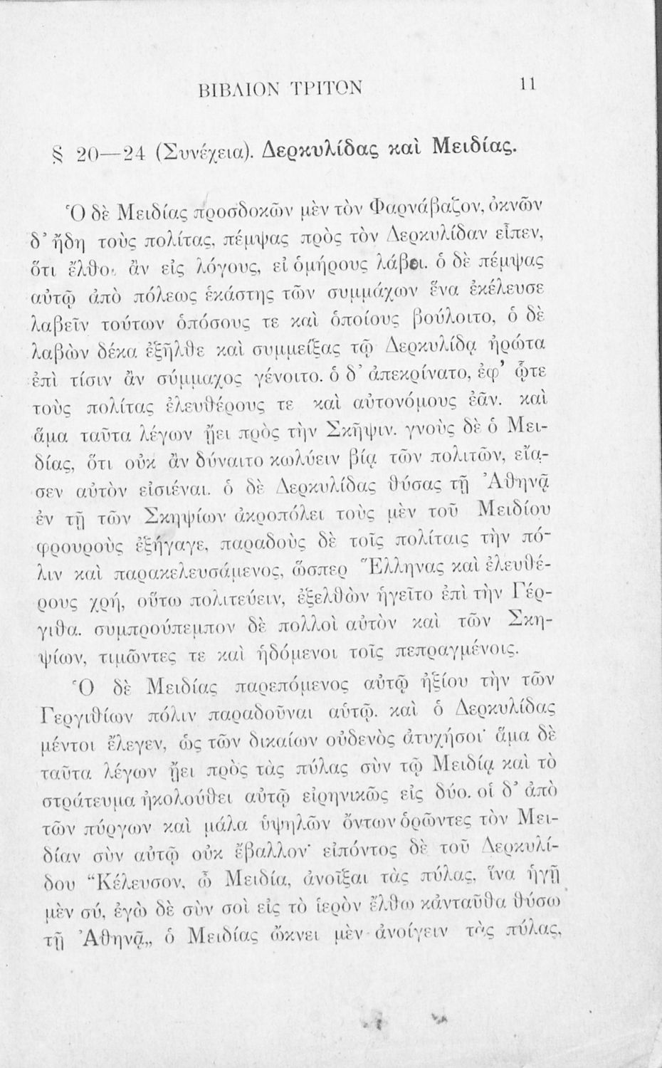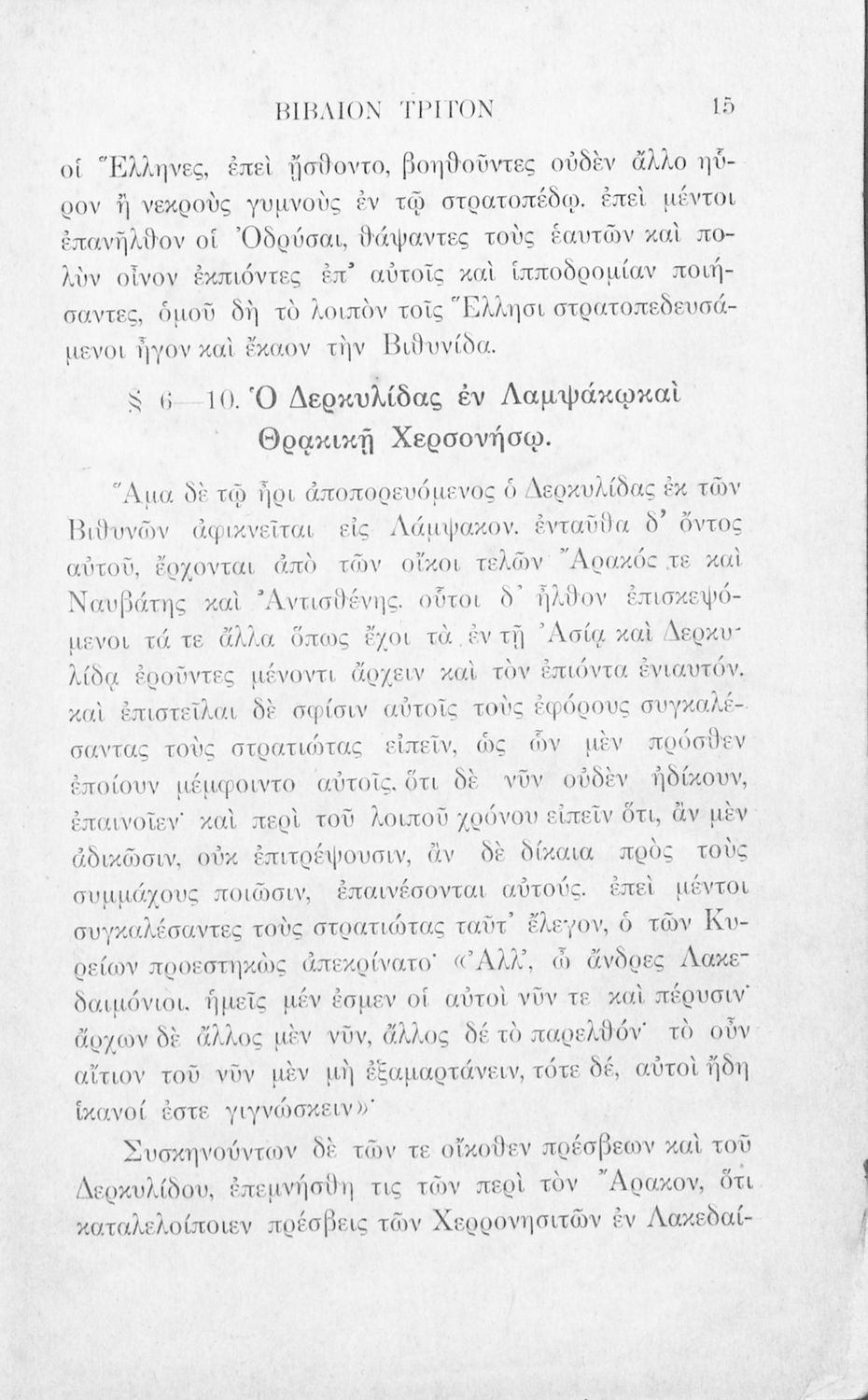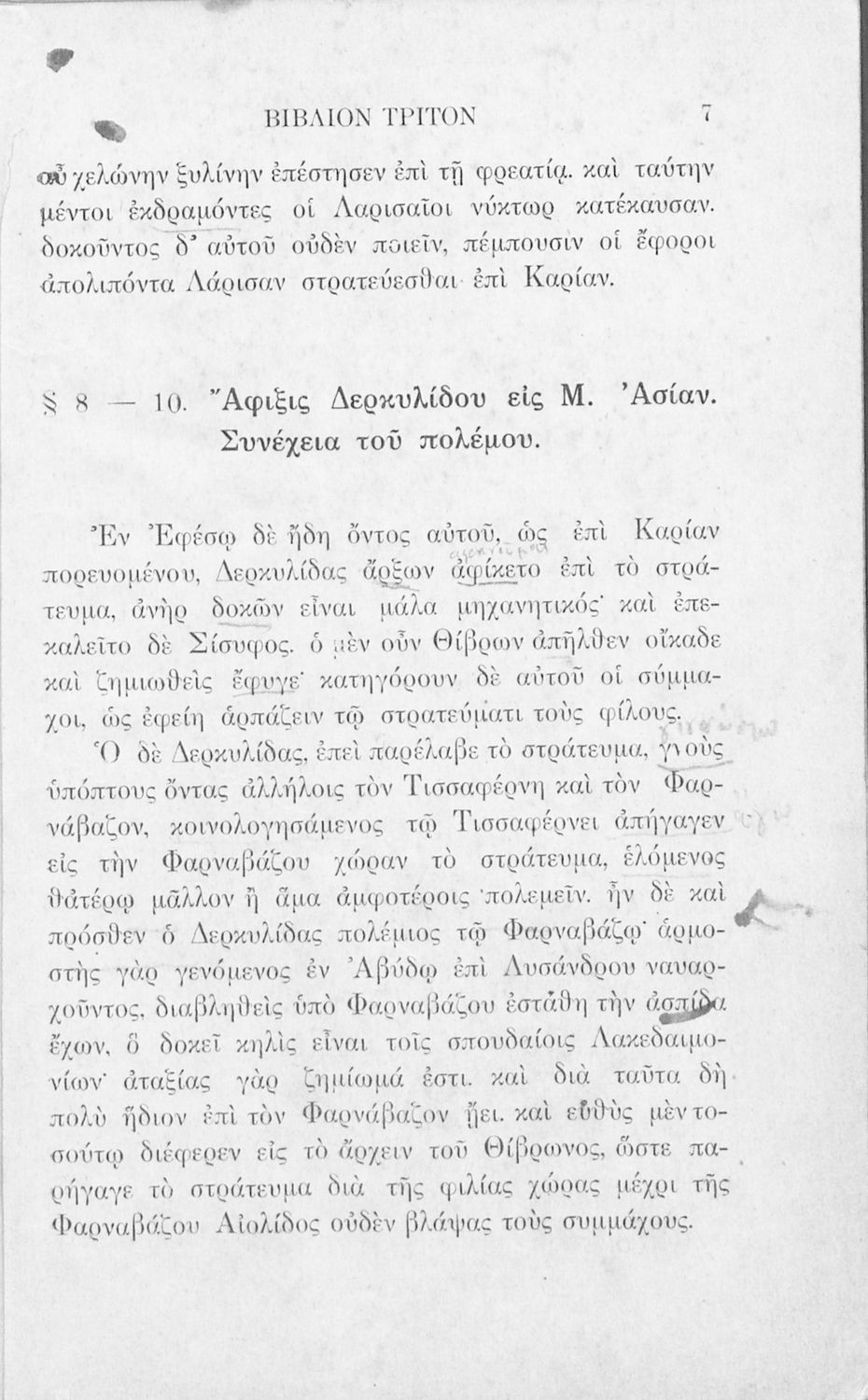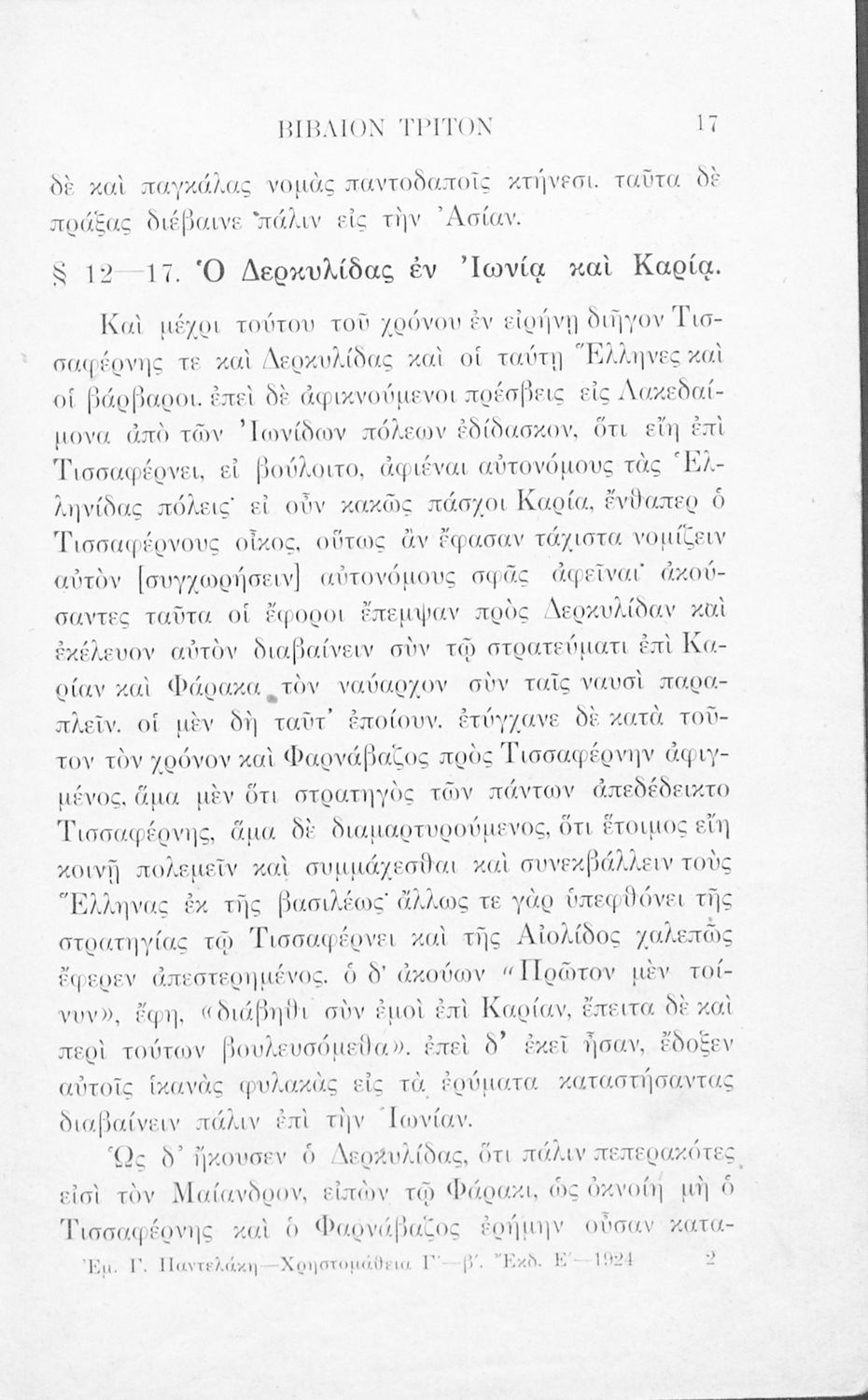 Σχολικό εγχειρίδιο Αρχαίων Ελληνικών που περιλαμβάνει αποσπάσματα από το έργο του Ξενοφώντα Ελληνικά και τα έργα του Λουκιανού Ενύπνιον και Ανάχαρσις, βιογραφικά σημειώματα των συγγραφέων, ερμηνευτικές και πραγματολογικές σημειώσεις.