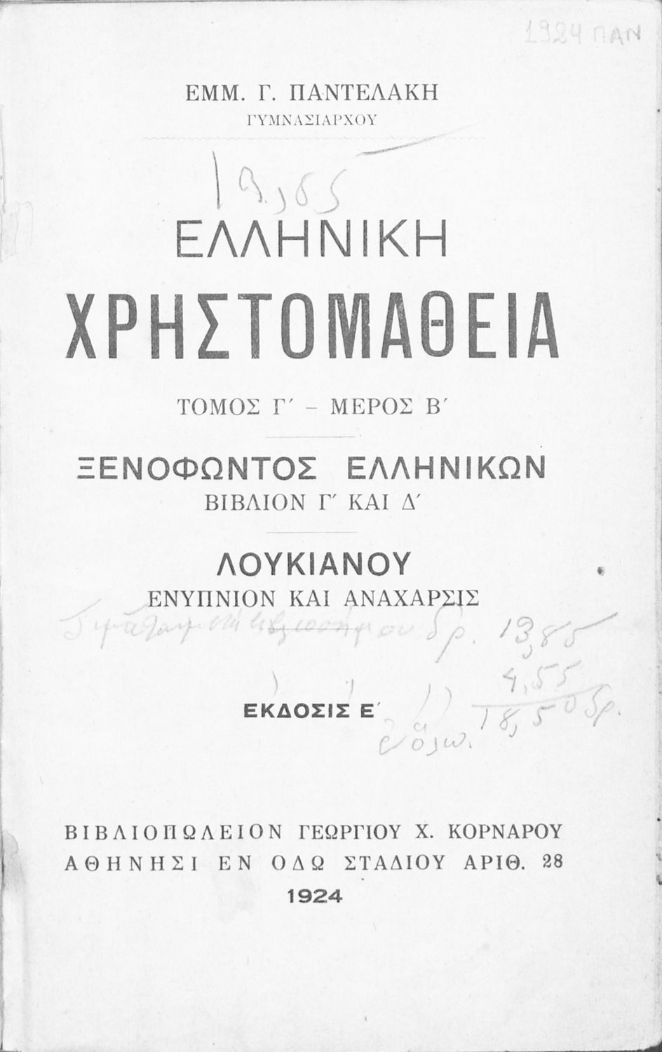 Εντοπισμός πρωτοτύπου: Ελληνικό Λογοτεχνικό και Ιστορικό Αρχείο Κωδικός βιβλιοθήκης: 1924 ΠΑΝ |