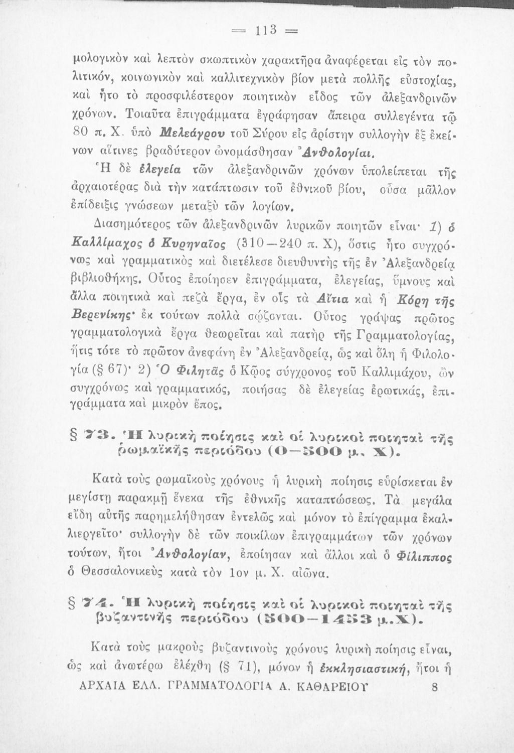 Βαθμίδα εκπαίδευσης: Δευτεροβάθμια Τάξη: Γυμνάσιο Μάθημα: Αρχαία Ελληνικά Γλώσσα: Καθαρεύουσα Παρουσίαση περιεχομένου: Σχολικό εγχειρίδιο για τους μαθητές Γυμνασίου που πραγματεύεται την εξέλιξη της ελληνικής γραμματείας από την αρχαιότητα ως τους βυζαντινούς χρόνους. |