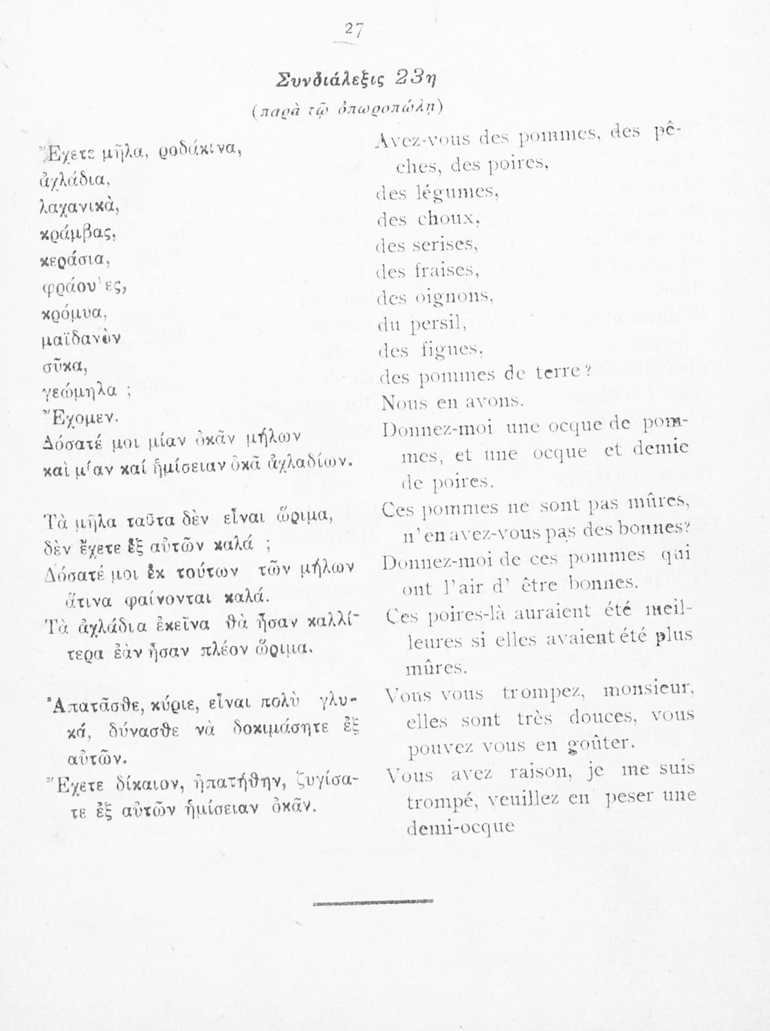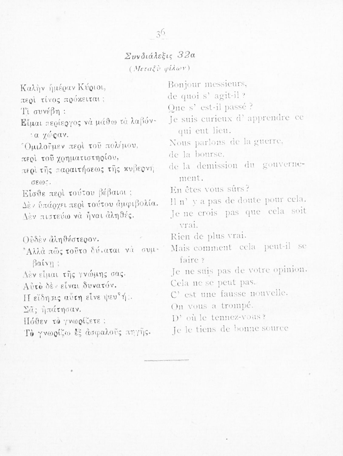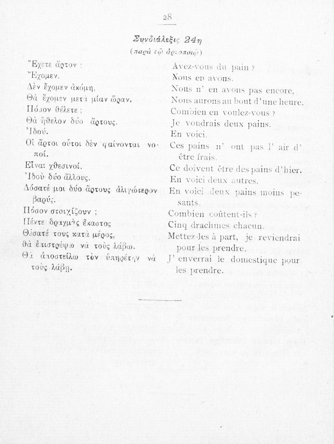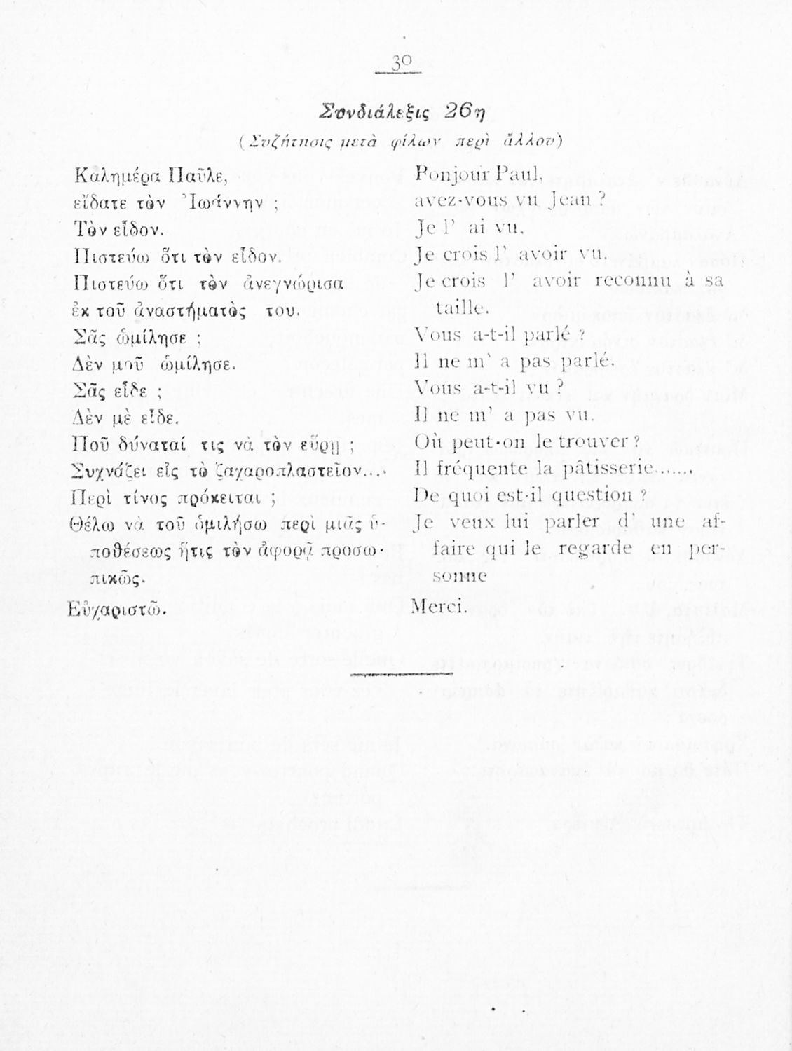 Μαθητικό βοήθημα Γαλλικών που περιλαμβάνει ελληνο-γαλλικούς διαλόγους, αποφθέγματα επιφανών Γάλλων φιλοσόφων και συγγραφέων και κατάλογο με ονόματα επιστημόνων επαγγελμάτων, στρατιωτικών όρων αλλά και διαφόρων ζώων, εποχών και επίπλων.