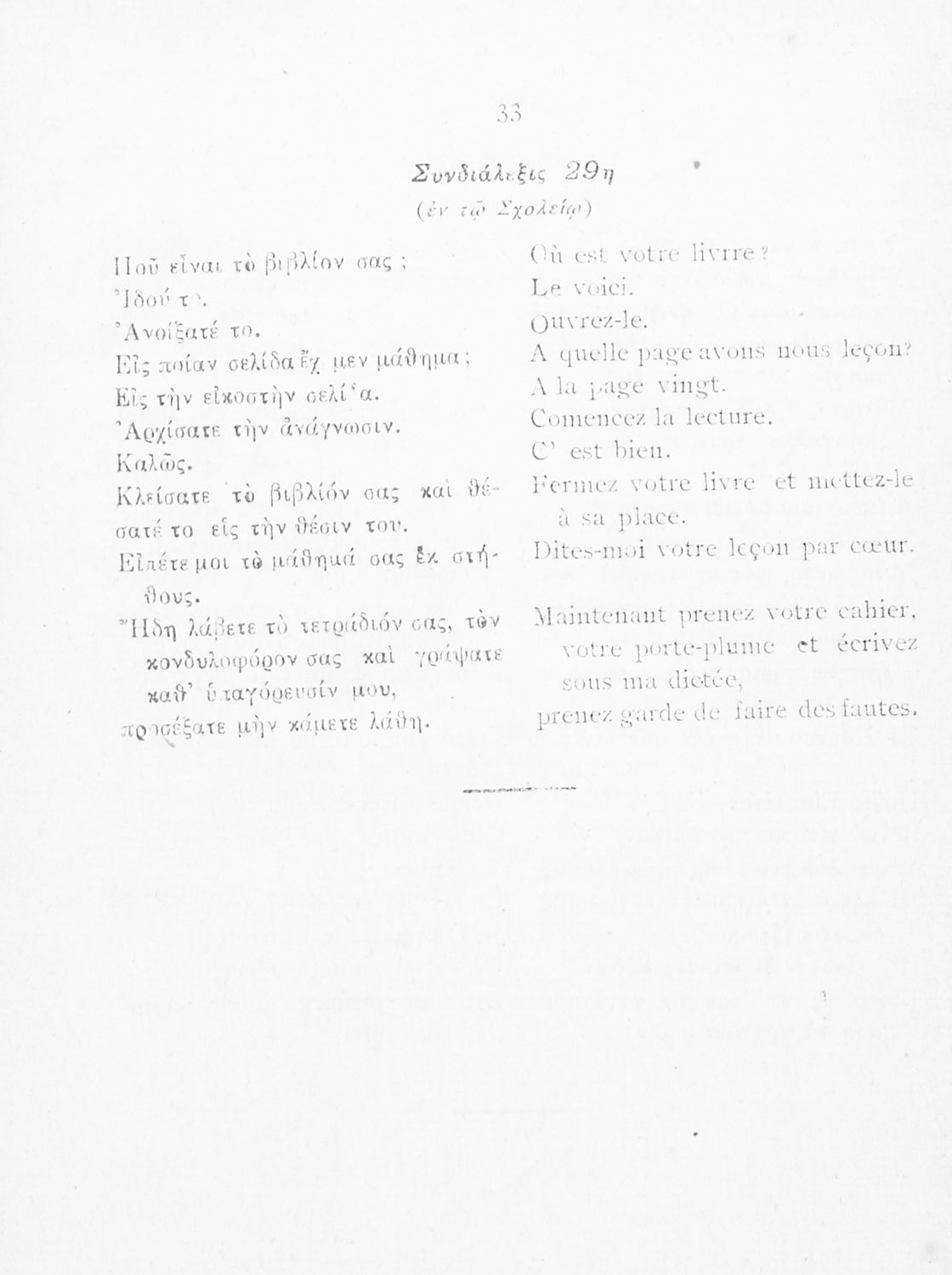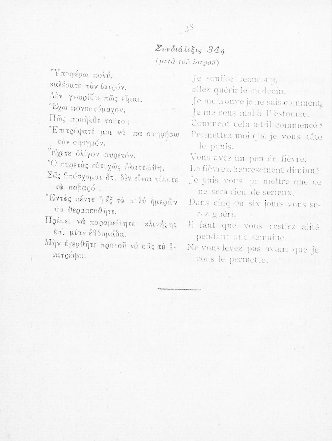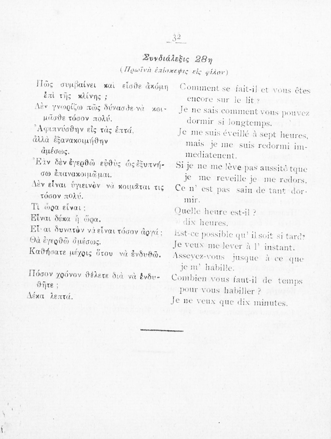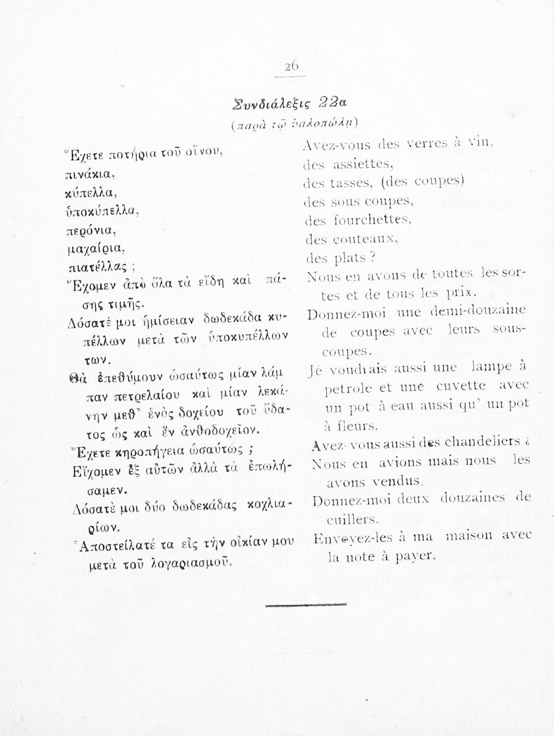 Μαθητικό βοήθημα Γαλλικών που περιλαμβάνει ελληνο-γαλλικούς διαλόγους, αποφθέγματα επιφανών Γάλλων φιλοσόφων και συγγραφέων και κατάλογο με ονόματα επιστημόνων επαγγελμάτων, στρατιωτικών όρων αλλά και διαφόρων ζώων, εποχών και επίπλων.