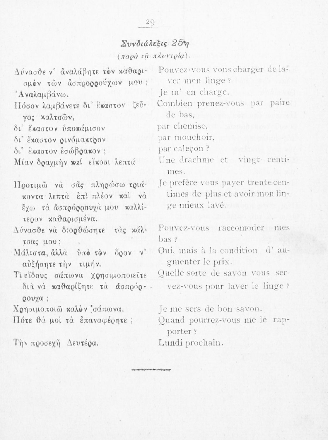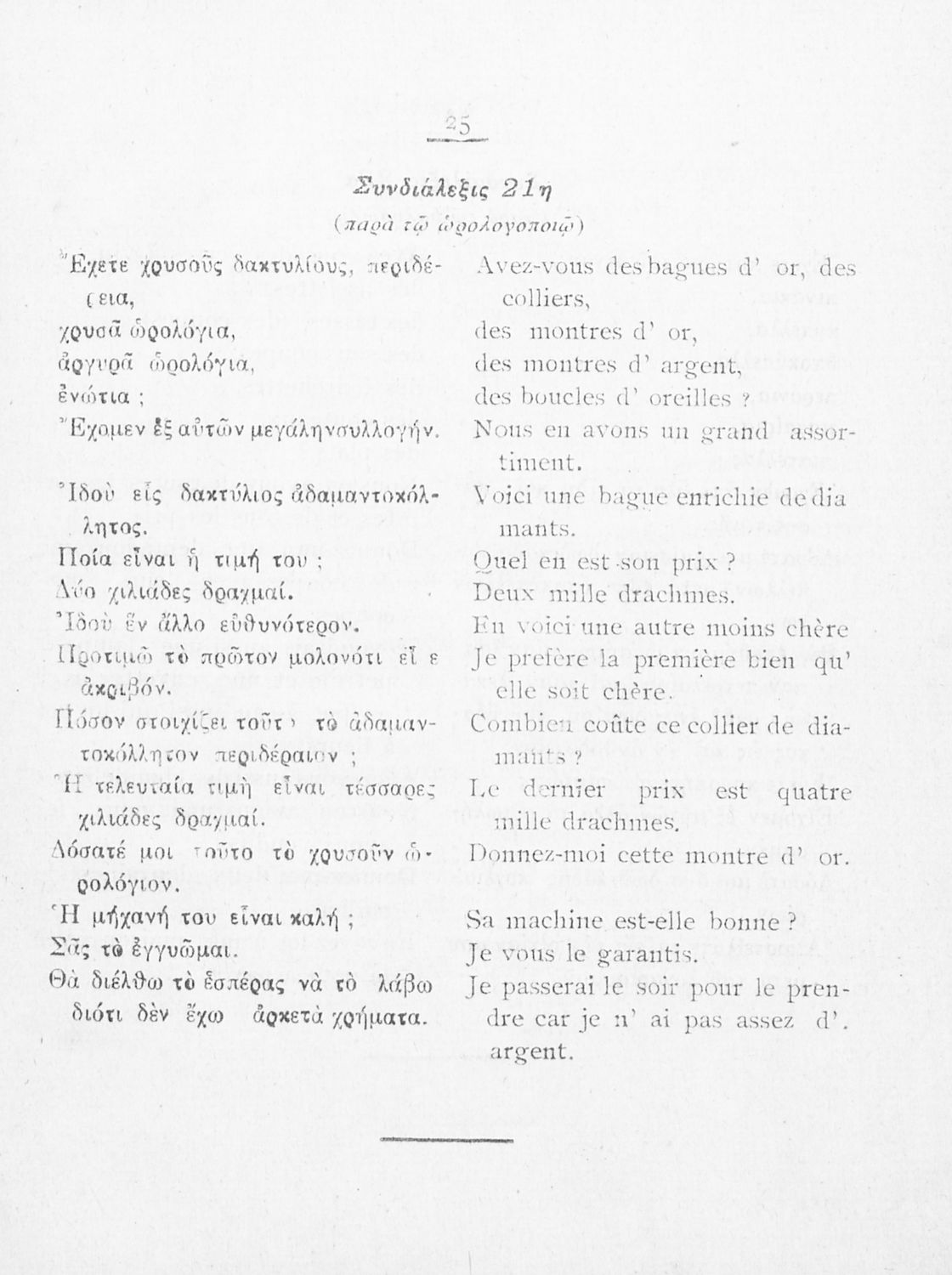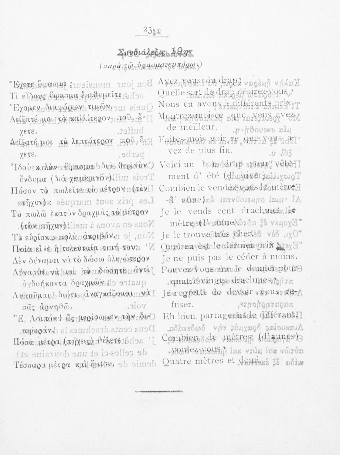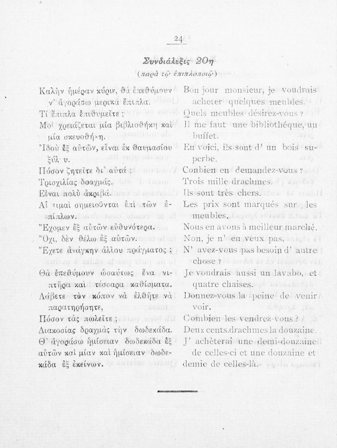 Μαθητικό βοήθημα Γαλλικών που περιλαμβάνει ελληνο-γαλλικούς διαλόγους, αποφθέγματα επιφανών Γάλλων φιλοσόφων και συγγραφέων και κατάλογο με ονόματα επιστημόνων επαγγελμάτων, στρατιωτικών όρων αλλά και διαφόρων ζώων, εποχών και επίπλων.