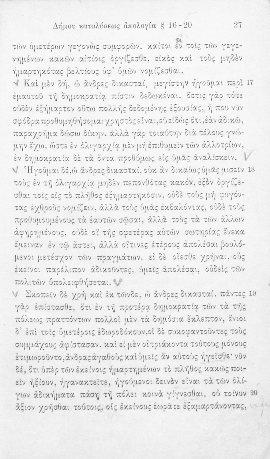 Σχολικό εγχειρίδιο Αρχαίων Ελληνικών Α΄ Γυμνασίου που περιλαμβάνει τους Λόγους Λυσία Υπέρ Μαντιθέου, Υπέρ του αδυνάτου, Δήμου καταλύσεως απολογία, Κατά Φίλωνος, Κατά των σιτοπωλών, εισαγωγή στη ρητορική, και ερμηνευτικές παρατηρήσεις.