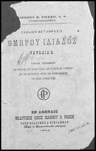Κωδικός αναγνώρισης: 02-01834 Τίτλος: Ομήρου Ιλιάδος ραψωδία Α΄ σχολική μετάφρασις προς χρήσιν των μαθητών της τρίτης τάξεως των Τετραταξίων Γυμνασίων και της αντιστοίχου τάξεως των λοιπών σχολείων της Μέσης Εκπαιδεύσεως Συγγραφέας: Ιωάννης Θ. Ρώσσης (σχόλια) Μέγεθος και υπόστρωμα: Μαθητικό βοήθημα, μαλακό εξώφυλλο, 32 σελίδες. |