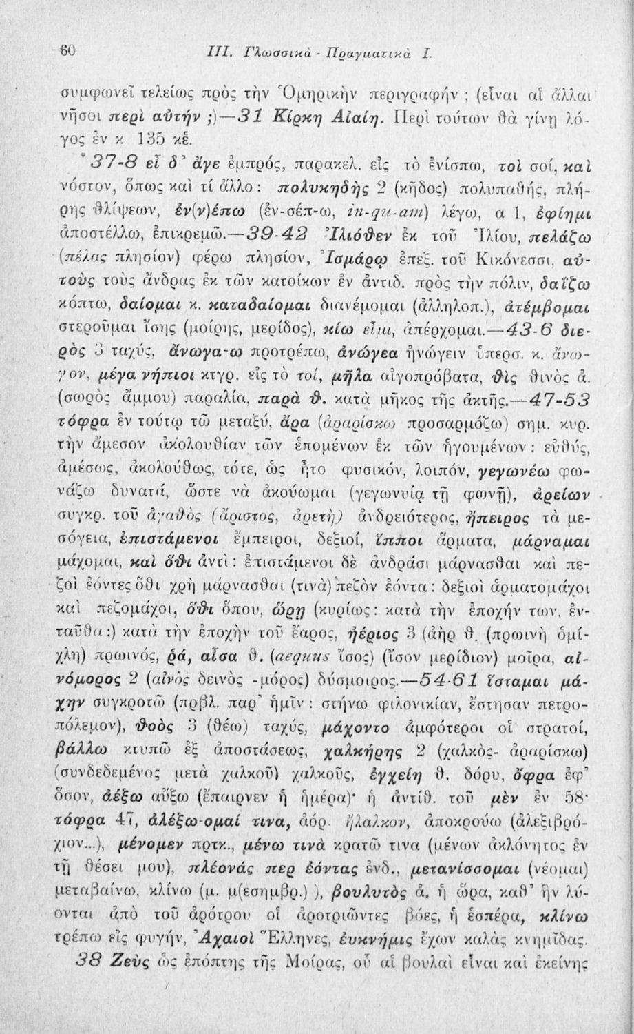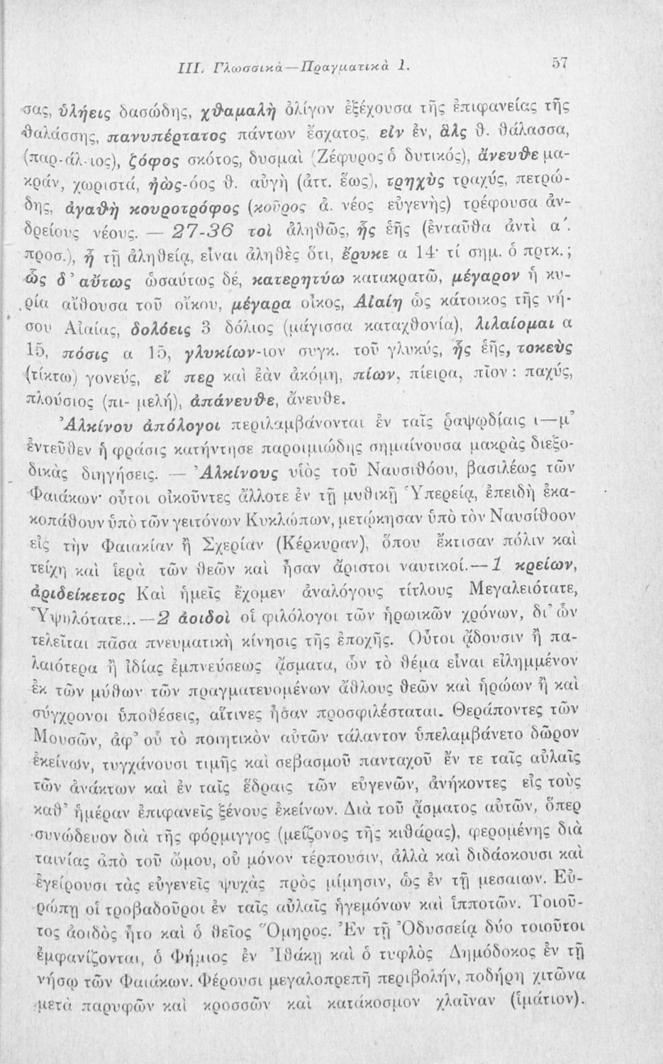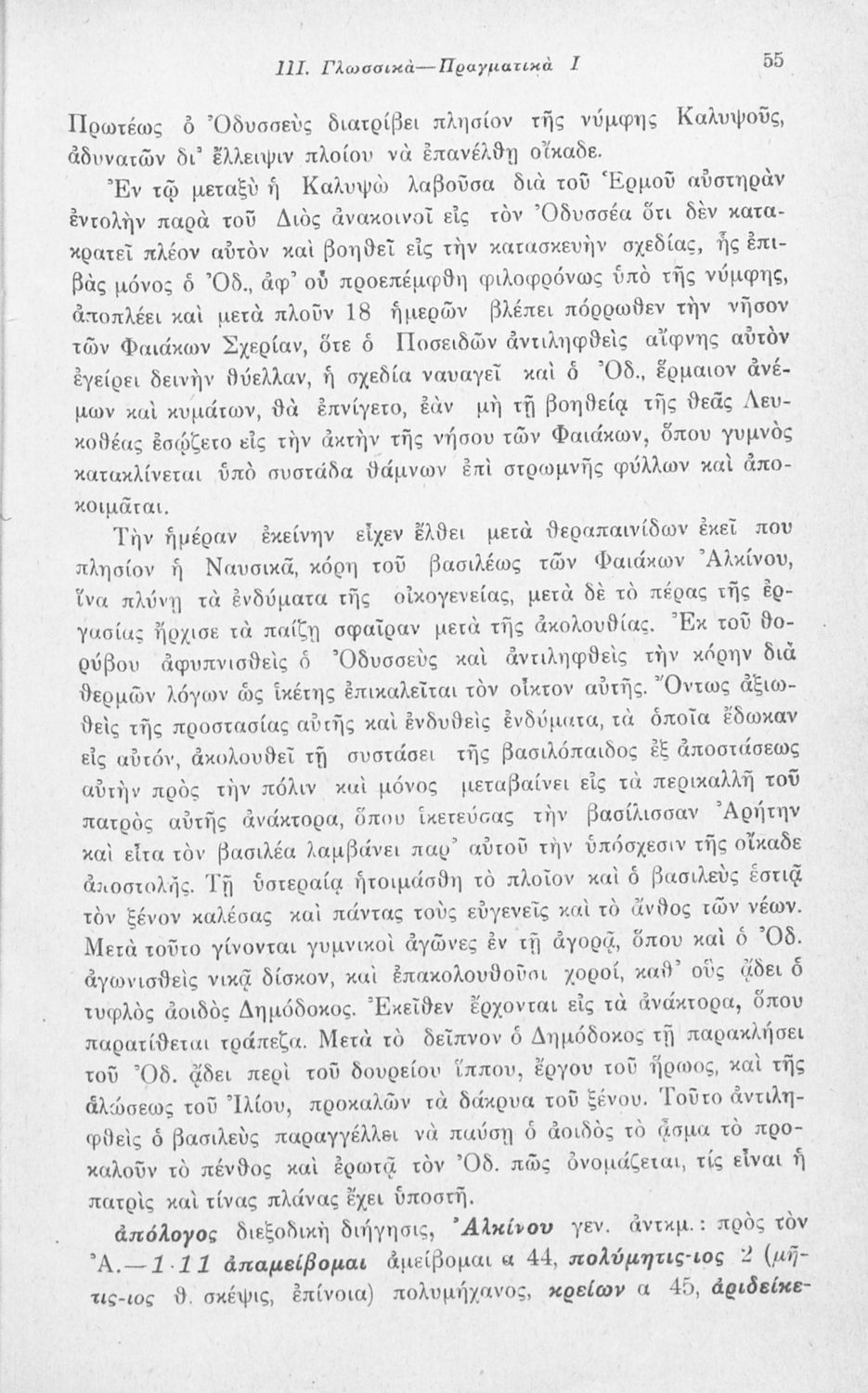 Μαθητικό βοήθημα Αρχαίων Ελληνικών που περιλαμβάνει αποσπάσματα των ραψωδιών Α, Ι, και Κ της Οδύσσειας και γλωσσικές και πραγματολογικές σημειώσεις.