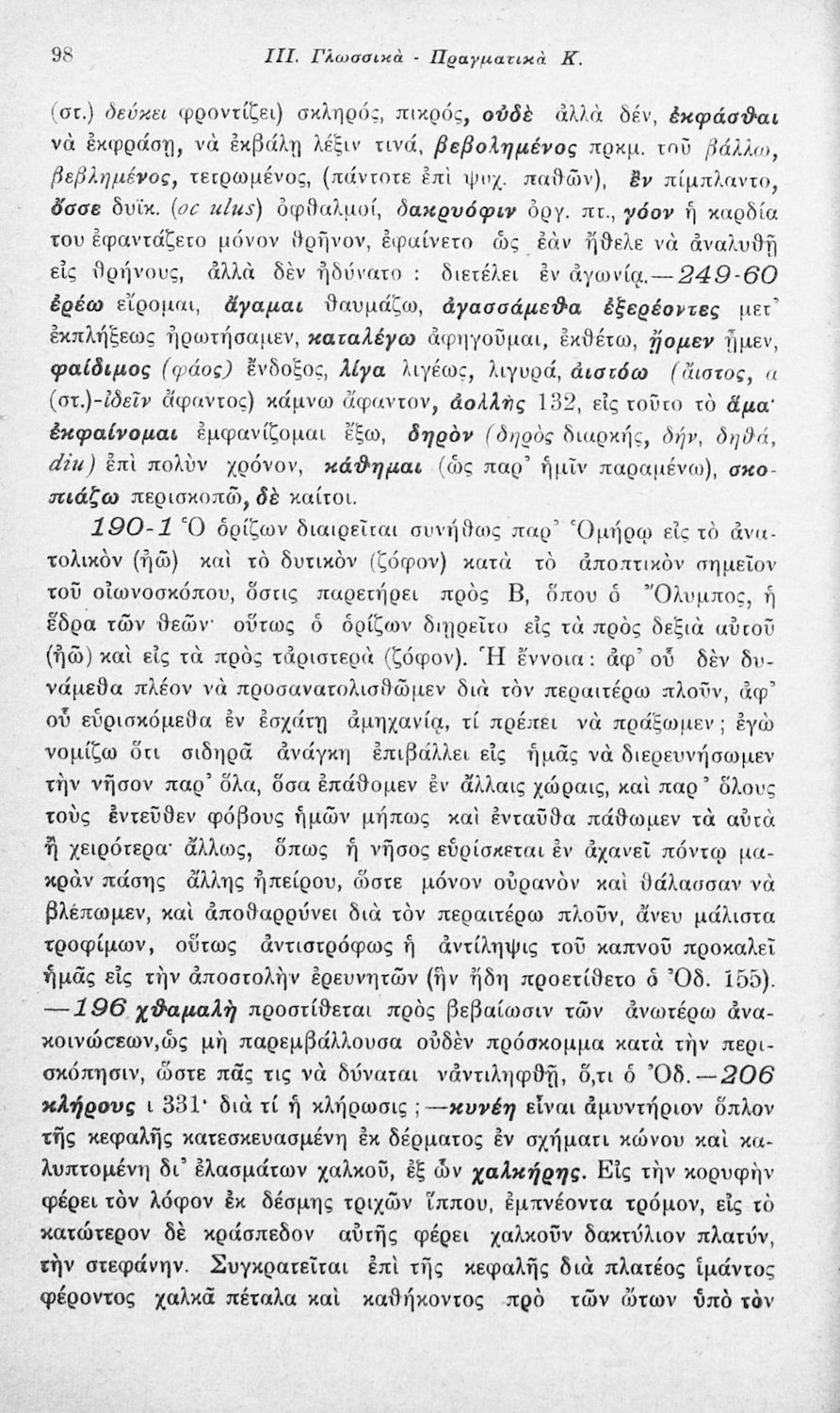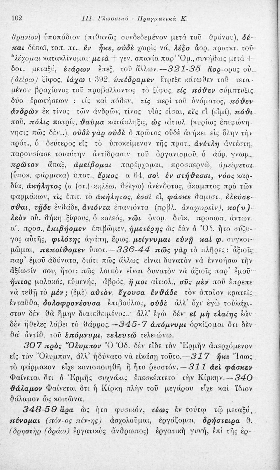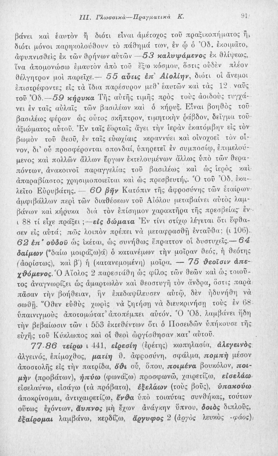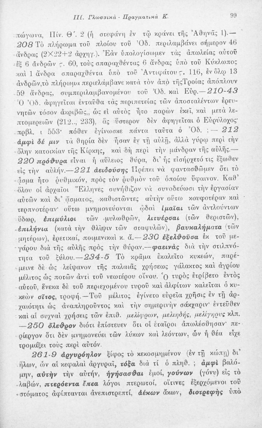 Μαθητικό βοήθημα Αρχαίων Ελληνικών που περιλαμβάνει αποσπάσματα των ραψωδιών Α, Ι, και Κ της Οδύσσειας και γλωσσικές και πραγματολογικές σημειώσεις.