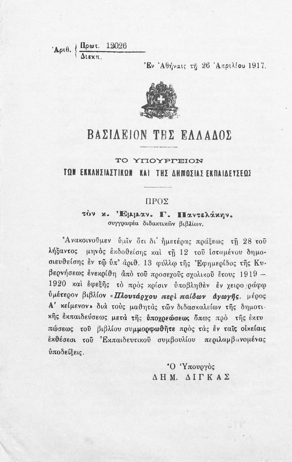 Υπουργική απόφαση / Σύμβαση: 12026/26-4-1917