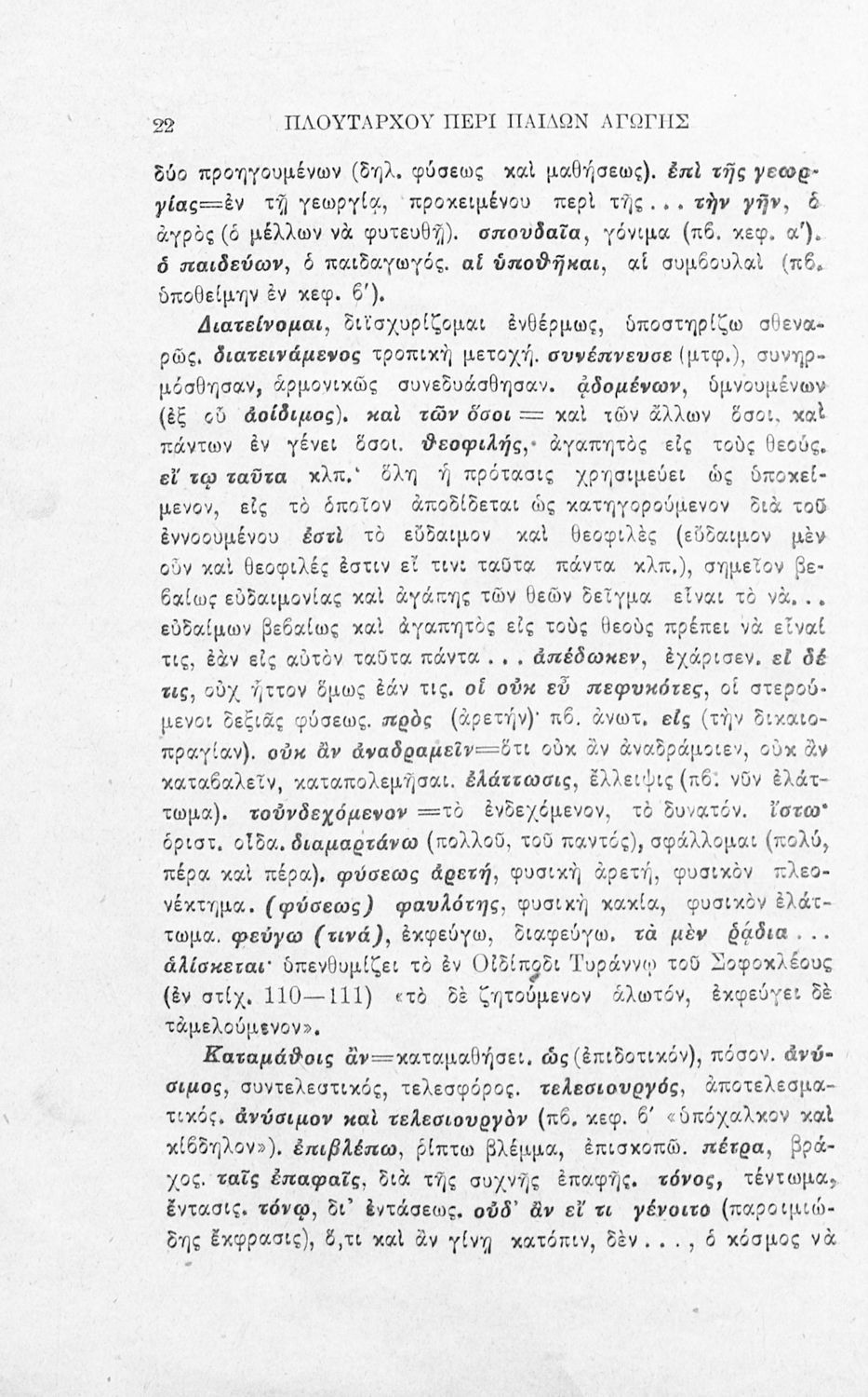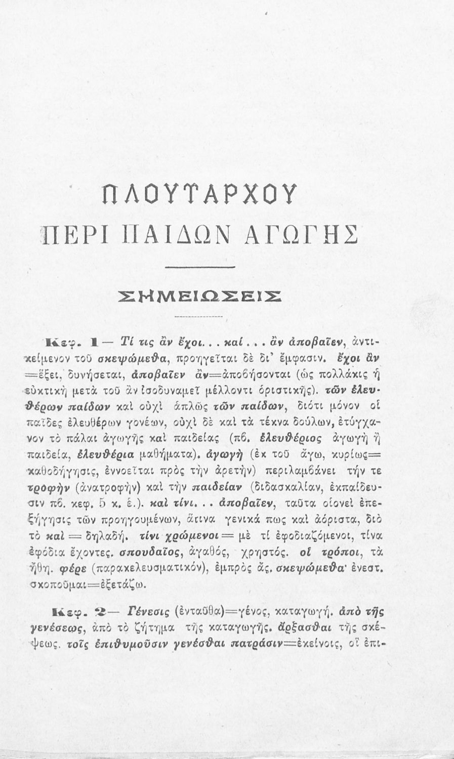 Σχολικό εγχειρίδιο Αρχαίων Ελληνικών που περιλαμβάνει το έργο του Πλούταρχου Περί παίδων αγωγής, εισαγωγή στη ζωή και το έργο του, και ερμηνευτικές σημειώσεις.