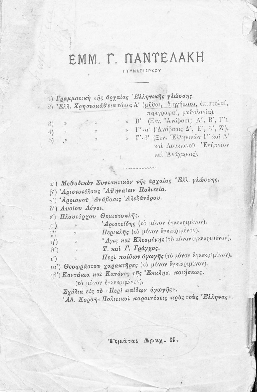 Κωδικός αναγνώρισης: 02-01838 Τίτλος: Πλουτάρχου Περί παίδων αγωγής μετά προλεγομένων και σημειώσεων προς χρήσιν των διδασκάλων και των μαθητών των Διδασκαλείων τεύχος Α΄ κείμενον Συγγραφέας: Πλούταρχος, Εμμ. Γ. Παντελάκης (σχόλια) Μέγεθος και υπόστρωμα: Σχολικό εγχειρίδιο, μαλακό εξώφυλλο, 56 σελίδες. |