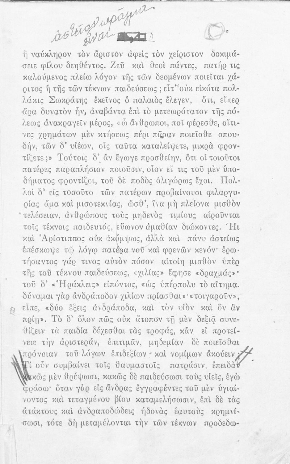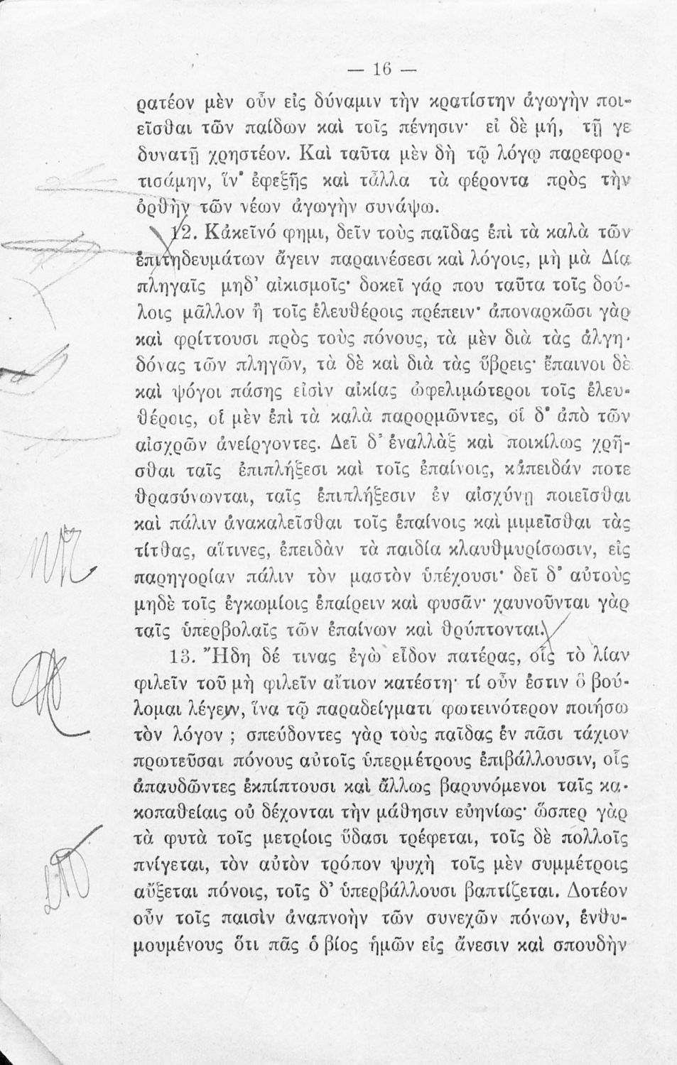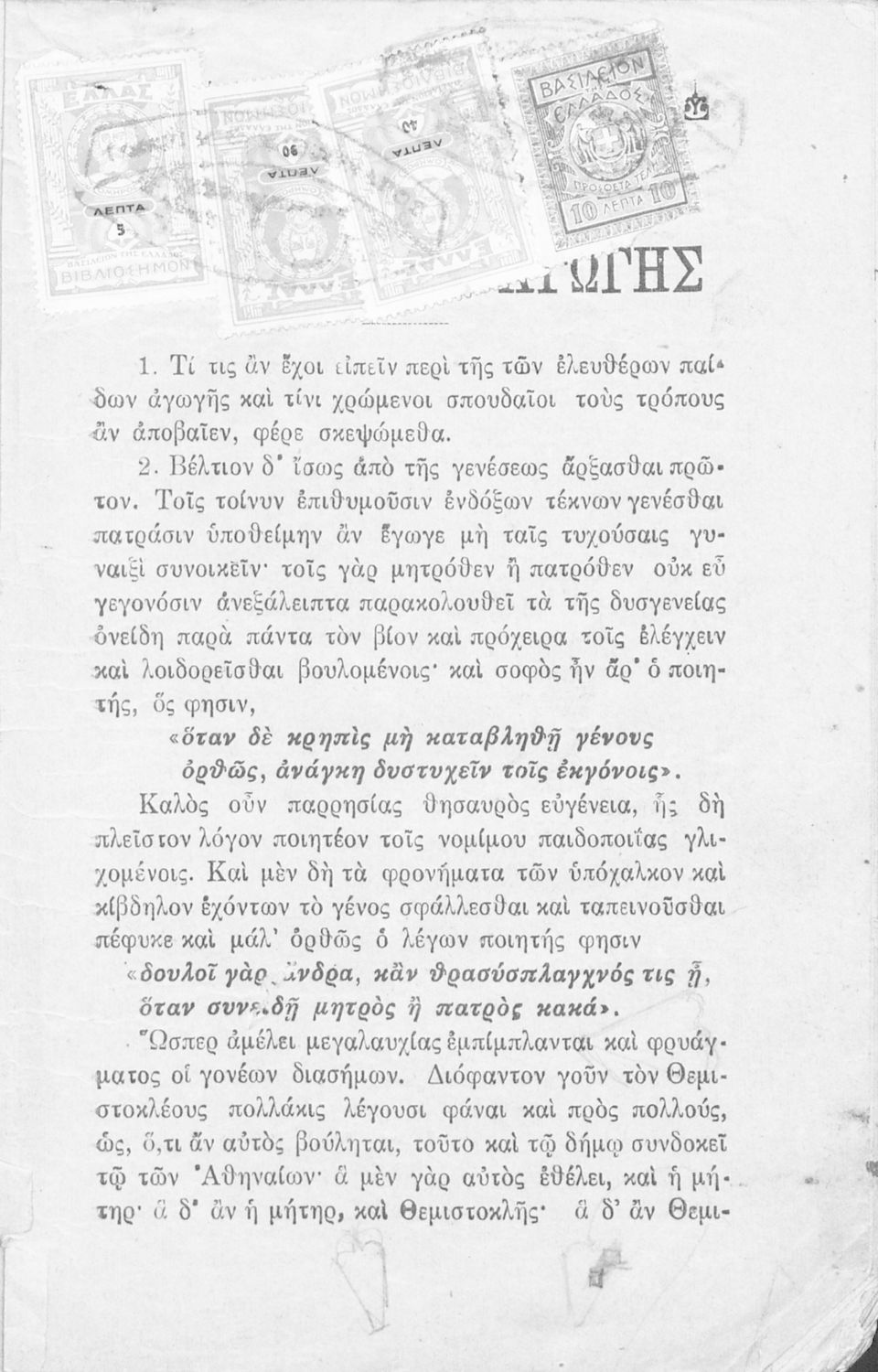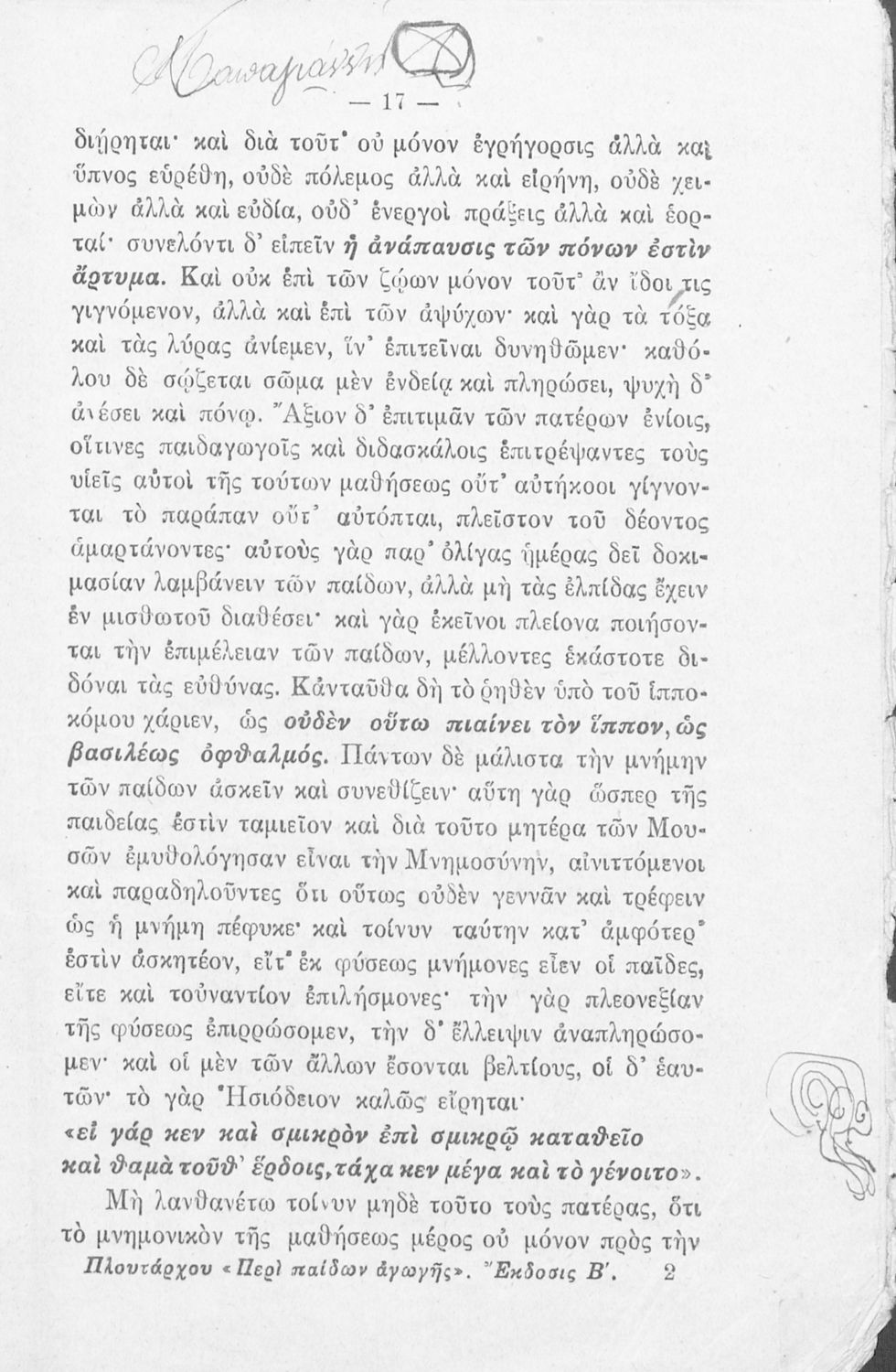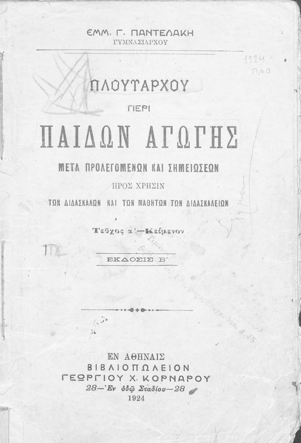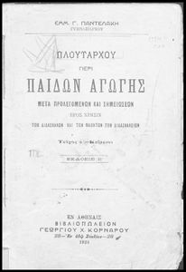 Σχολικό εγχειρίδιο Αρχαίων Ελληνικών που περιλαμβάνει το έργο του Πλούταρχου Περί παίδων αγωγής, εισαγωγή στη ζωή και το έργο του, και ερμηνευτικές σημειώσεις.