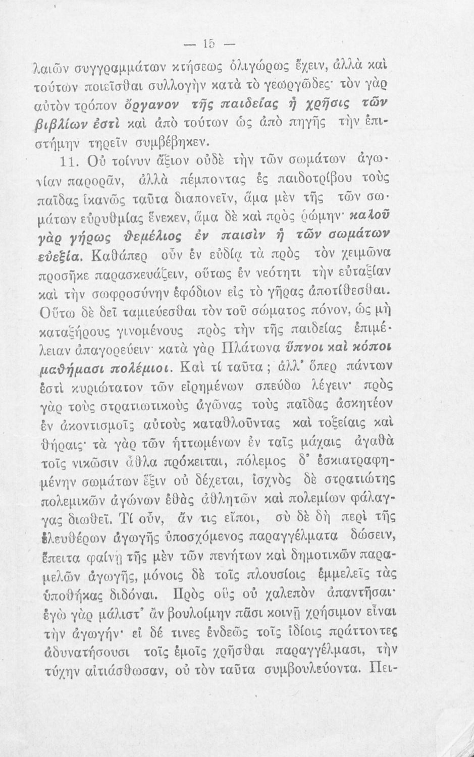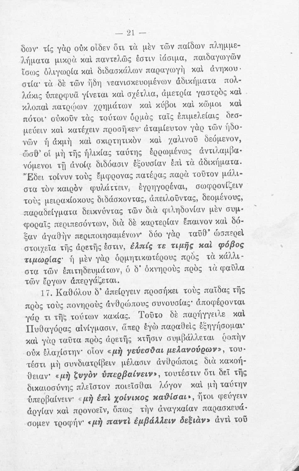 Βαθμίδα εκπαίδευσης: Δευτεροβάθμια Μάθημα: Αρχαία Ελληνικά Γλώσσα: Καθαρεύουσα Παρουσίαση περιεχομένου: Σχολικό εγχειρίδιο Αρχαίων Ελληνικών που περιλαμβάνει το έργο του Πλούταρχου Περί παίδων αγωγής, εισαγωγή στη ζωή και το έργο του, και ερμηνευτικές σημειώσεις. |