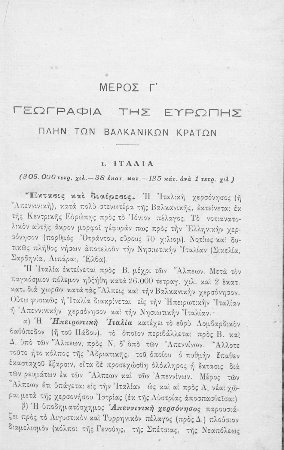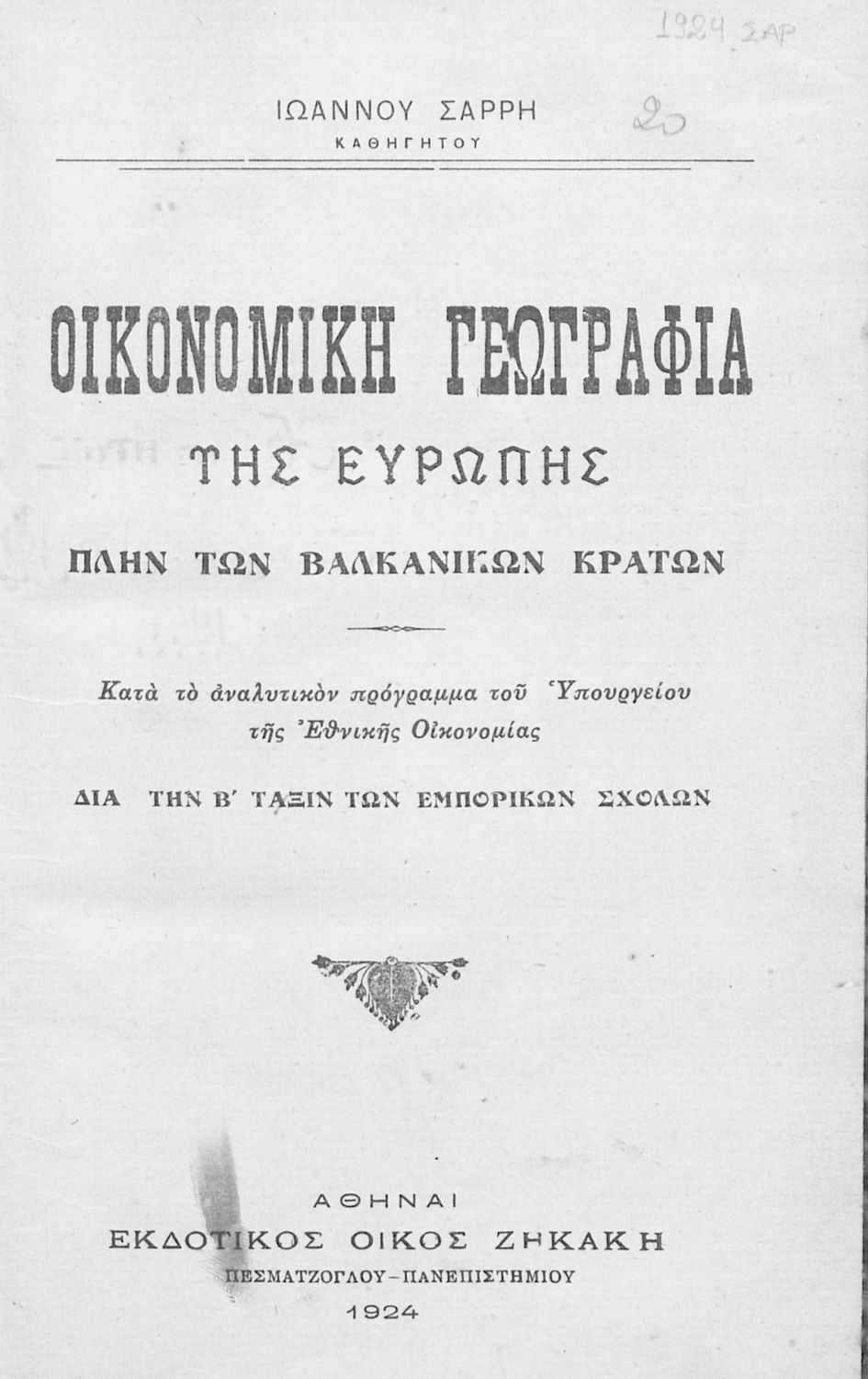 Πρόκειται για σχολικό εγχειρίδιο το οποίο προοριζόταν για τη διδασκαλία του μαθήματος της Οικονομικής Γεωγραφίας της Ευρωπαϊκής ηπείρου, εκτός των βαλκανικών κρατών. Φέρει τη σφραγίδα του εκδότη.