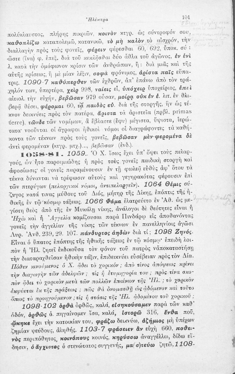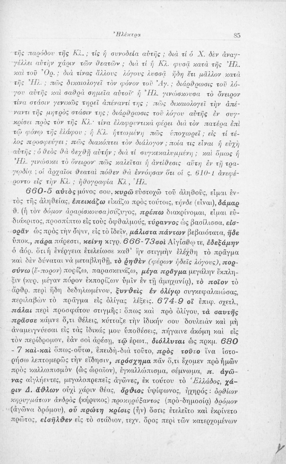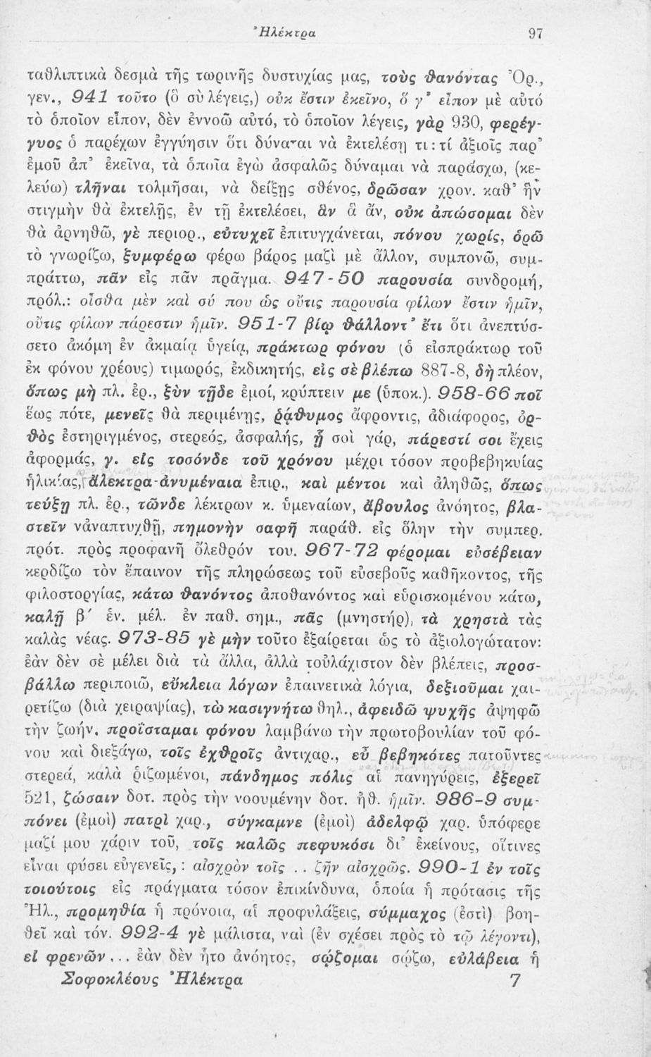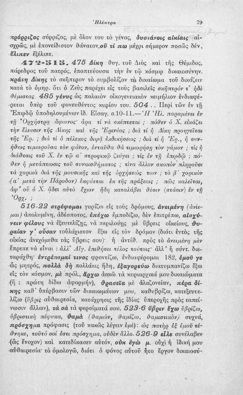 Μαθητικό βοήθημα Αρχαίων Ελληνικών που περιλαμβάνει την Ηλέκτρα του Σοφοκλή και γλωσσικές και πραγματικές σημειώσεις.