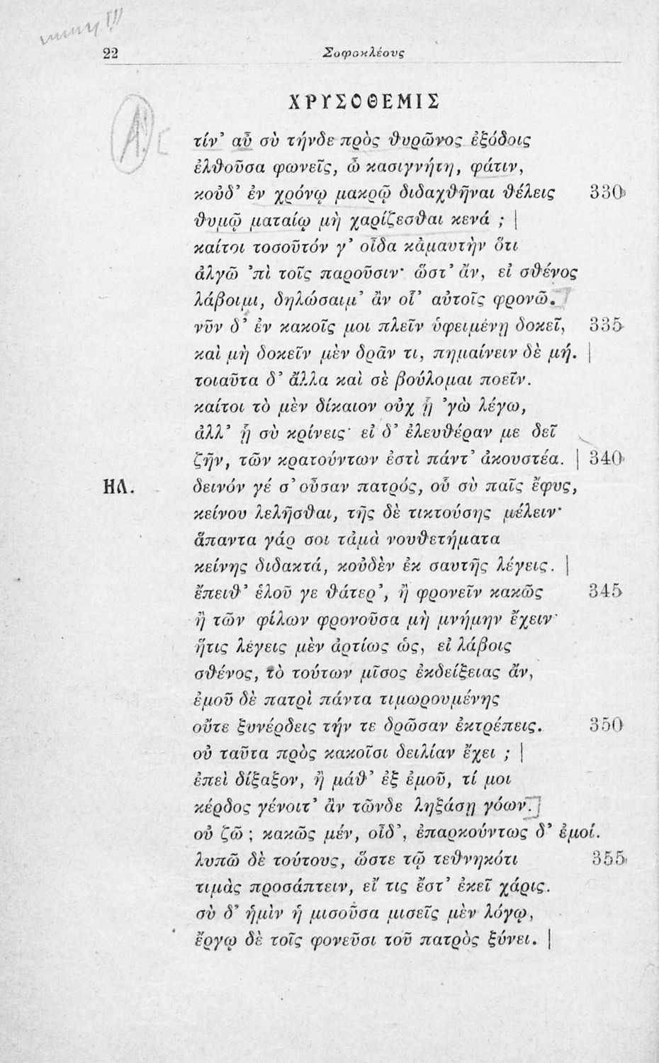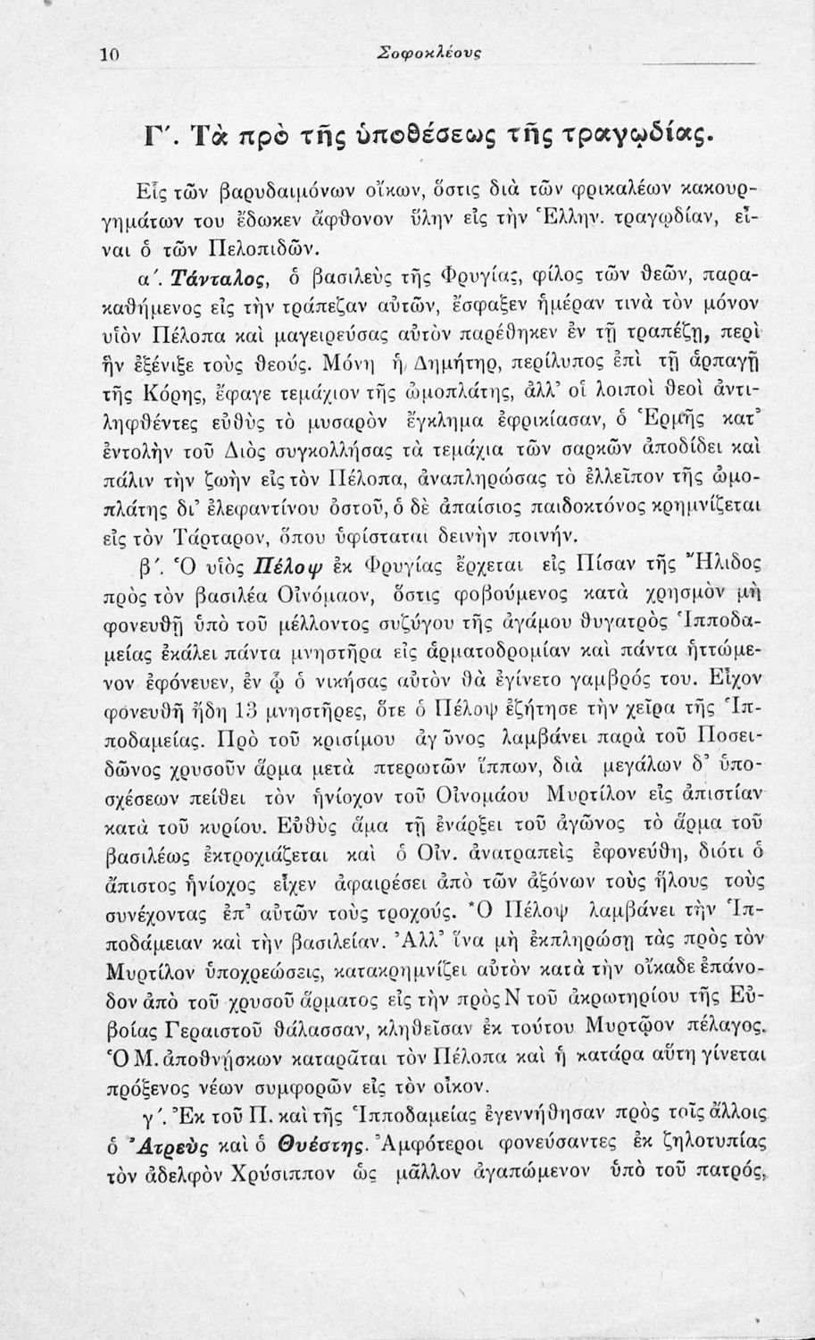 Παιδαγωγικό βοήθημα Αρχαίων Ελληνικών. Περιέχει τη τραγωδία του Σοφοκλή, την Αντιγόνη με σχόλια από τον Μιστριώτη που υπήρξε τακτικός καθηγητής των ελληνικών γραμμάτων στο εθνικό Πανεπιστήμιο.