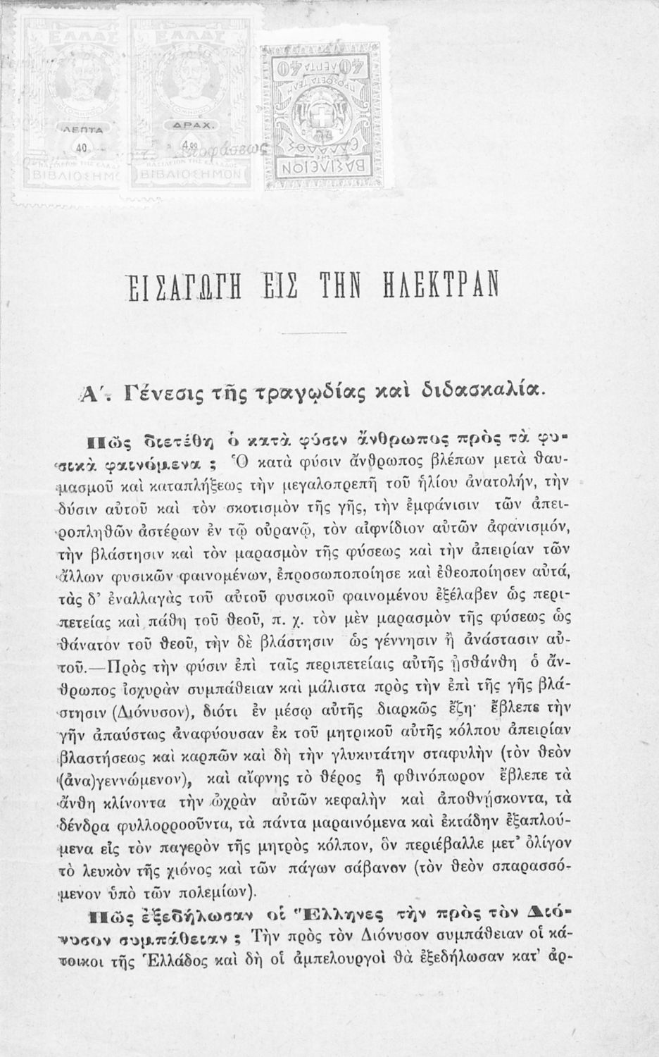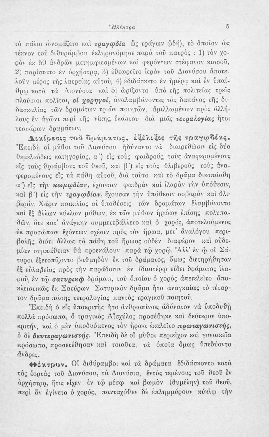 Μαθητικό βοήθημα Αρχαίων Ελληνικών το οποίο περιλαμβάνει το έργο του Σοφοκλή, 'Ηλέκτρα'. Το βιβλίο ξεκινάει με μια εισαγωγή για τη γέννηση και την εξέλιξη της τραγωδίας και στη συνέχεια παρουσιάζει το έργο του
