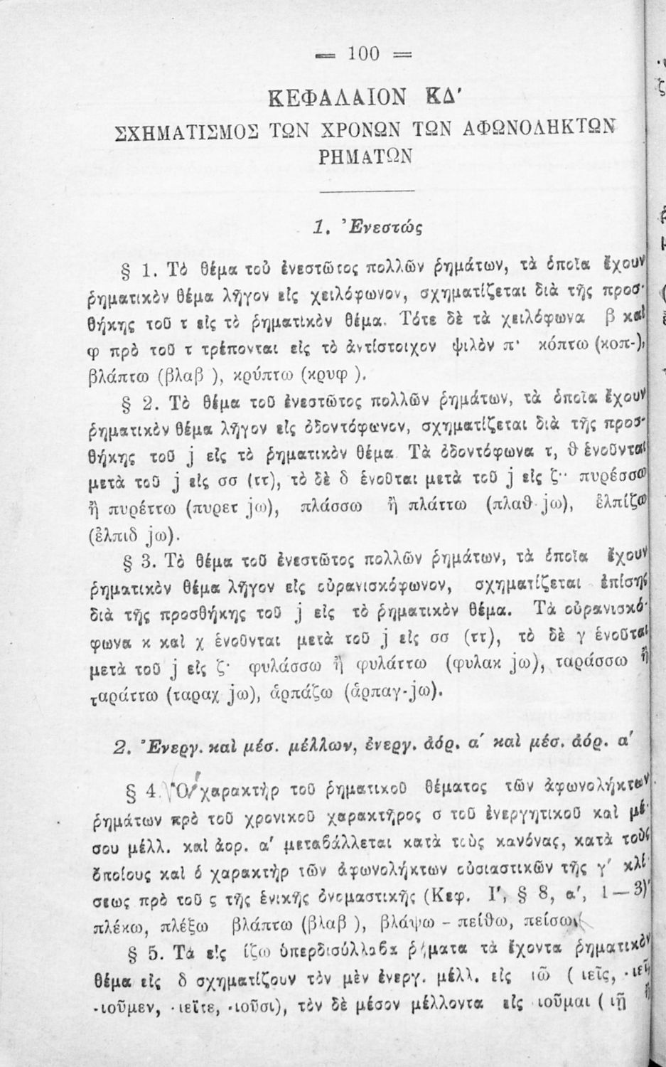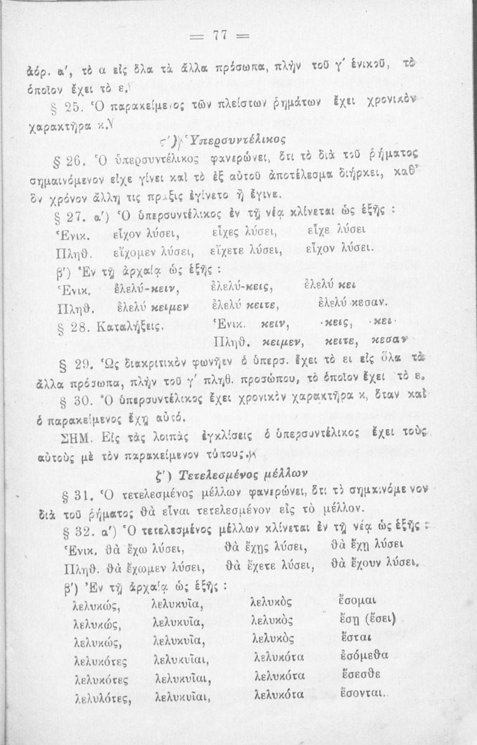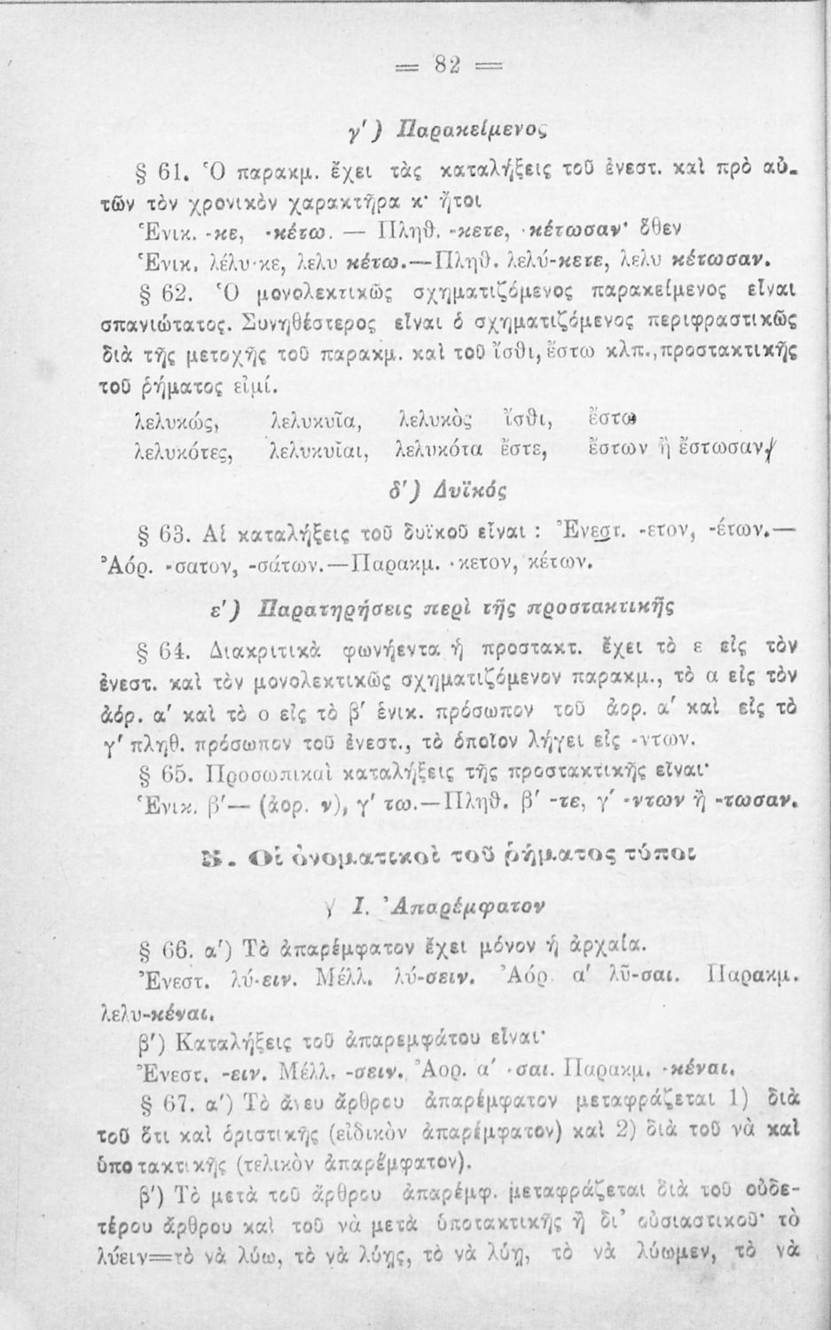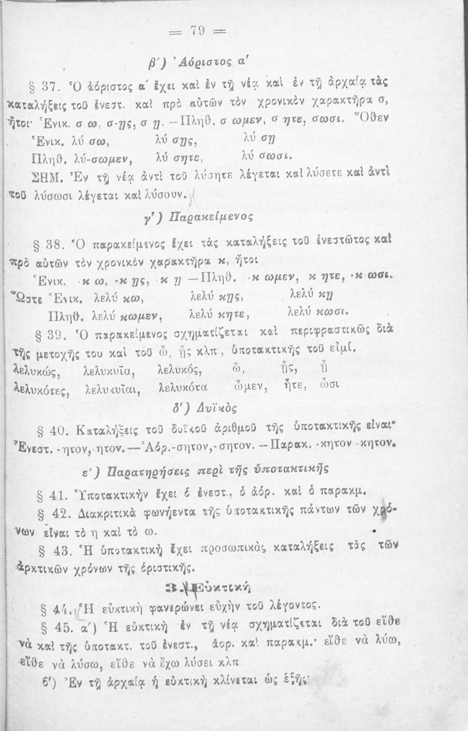 Σχολικό εγχειρίδιο Αρχαίων Ελληνικών για τα Ελληνικά Σχολεία και Παρθεναγωγεία που περιέχει τους κανόνες γραμματικής και είναι χωρισμένο σε φθογγολογικό, τυπολογικό και ετυμολογικό μέρος.