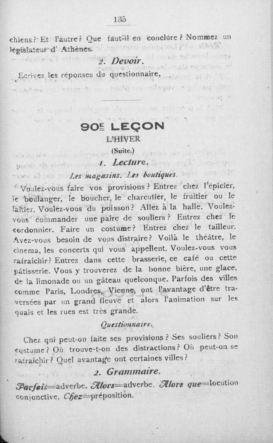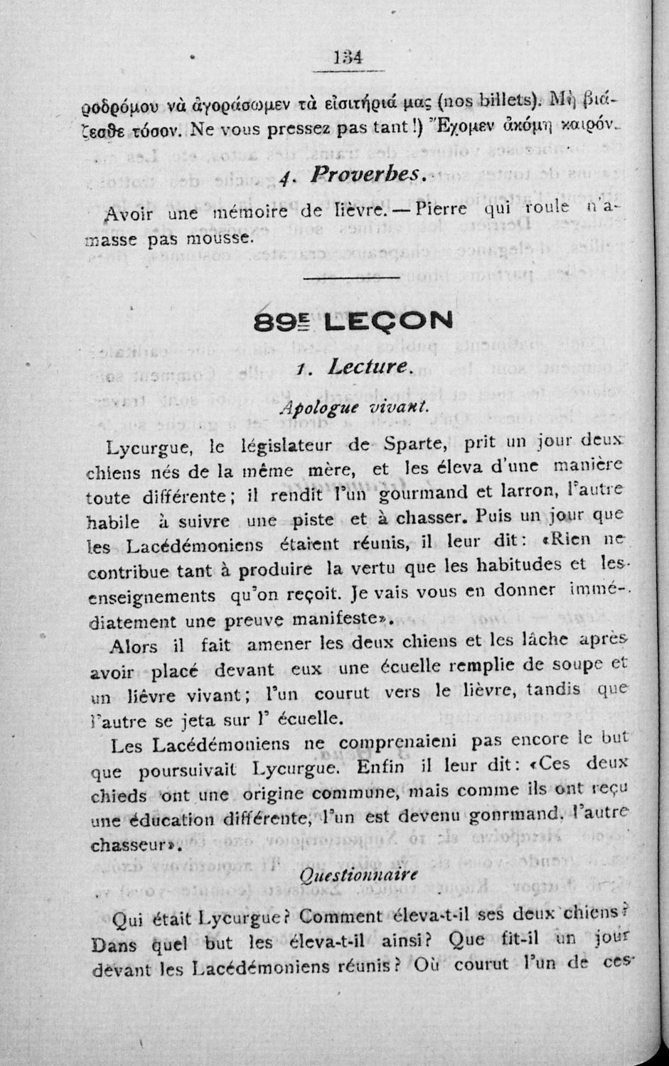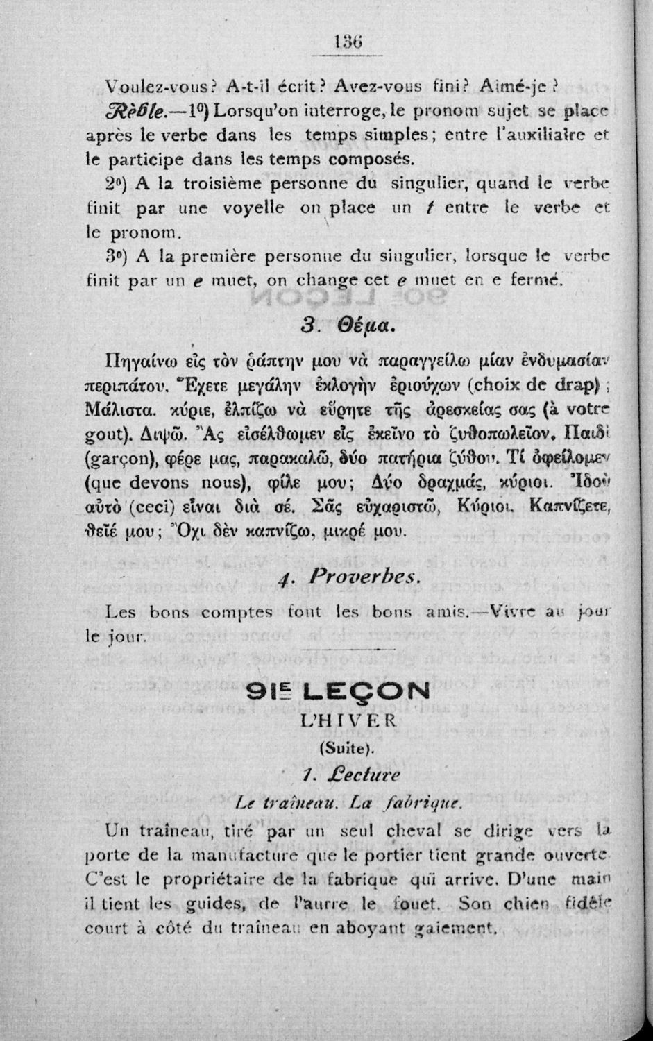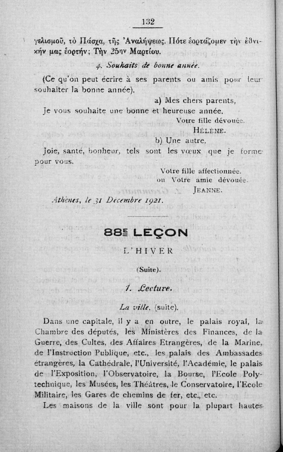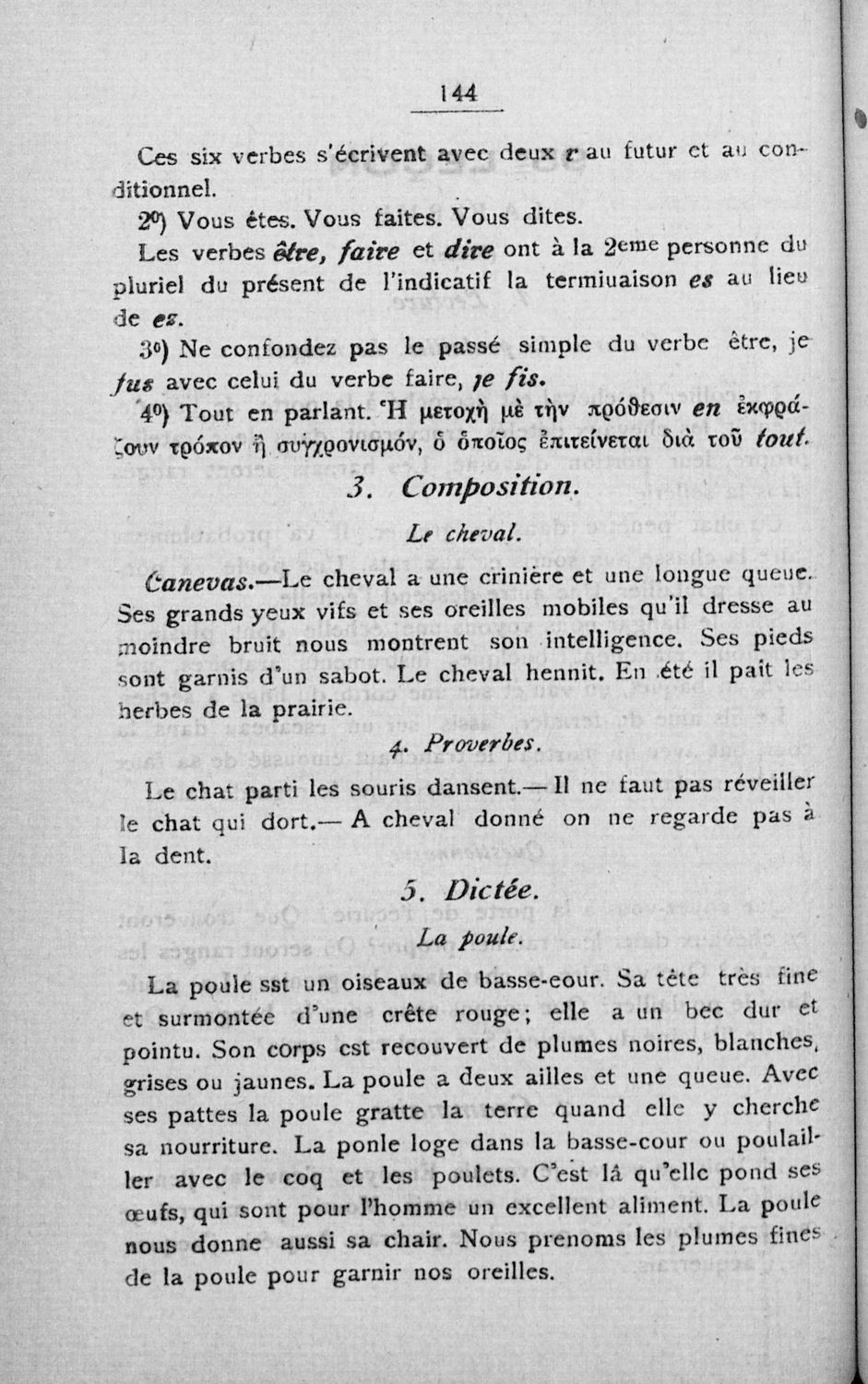 Σχολικό εγχειρίδιο Γαλλικών των Γυμνασίων, Αστικών Σχολείων θηλέων και Διδασκαλείων Δημοτικής Εκπαίδευσης. Κείμενα, ποιήματα, από εποχές και τον κοινωνικό και οικογενειακό βίο, τα οποία συνοδεύονται ασκήσεις γραμματικής συντακτικού.
