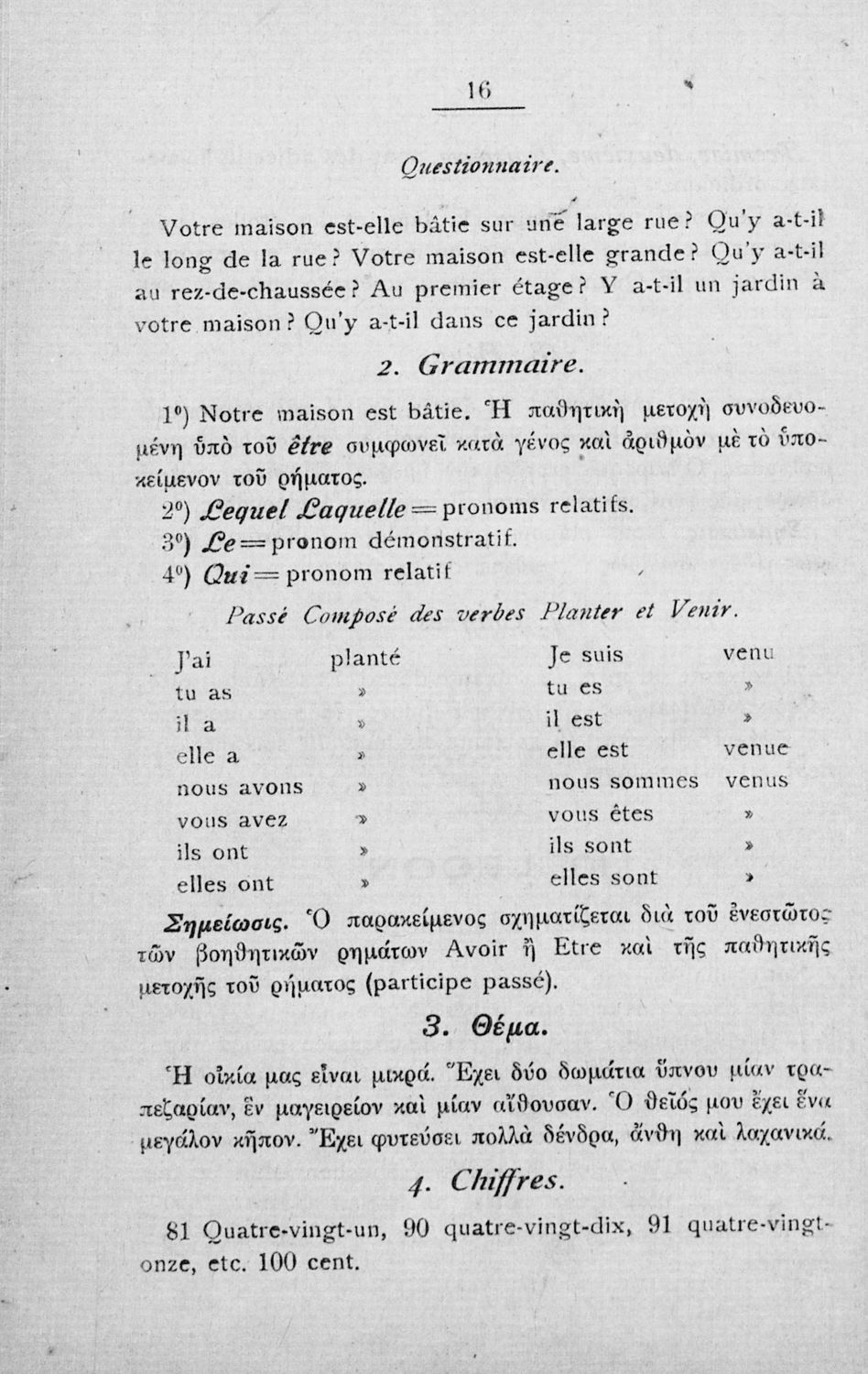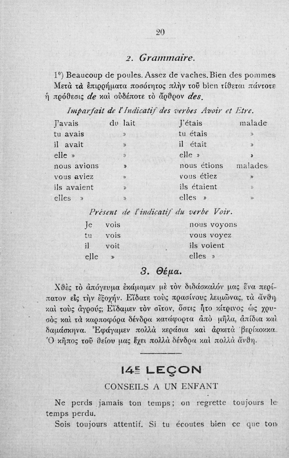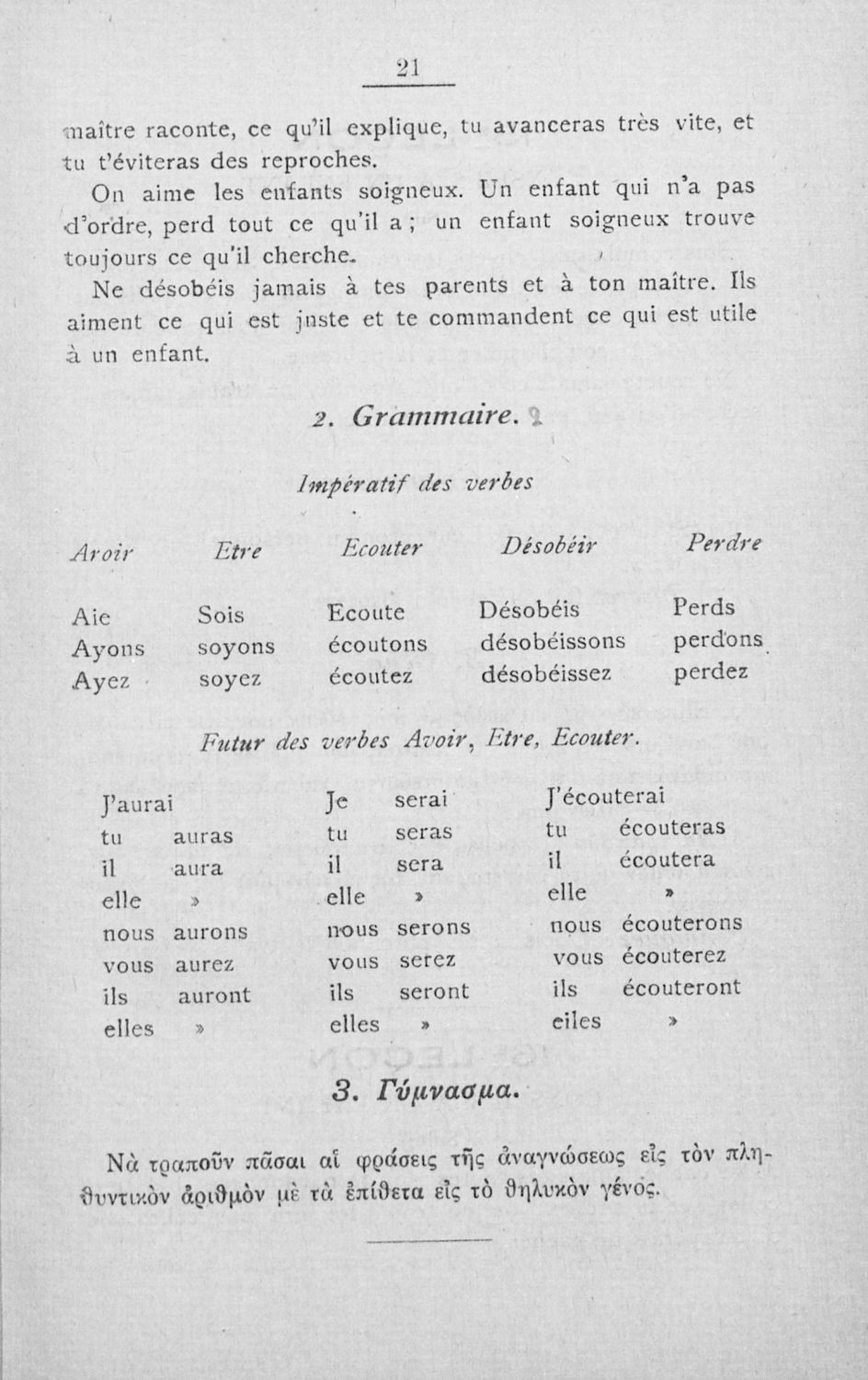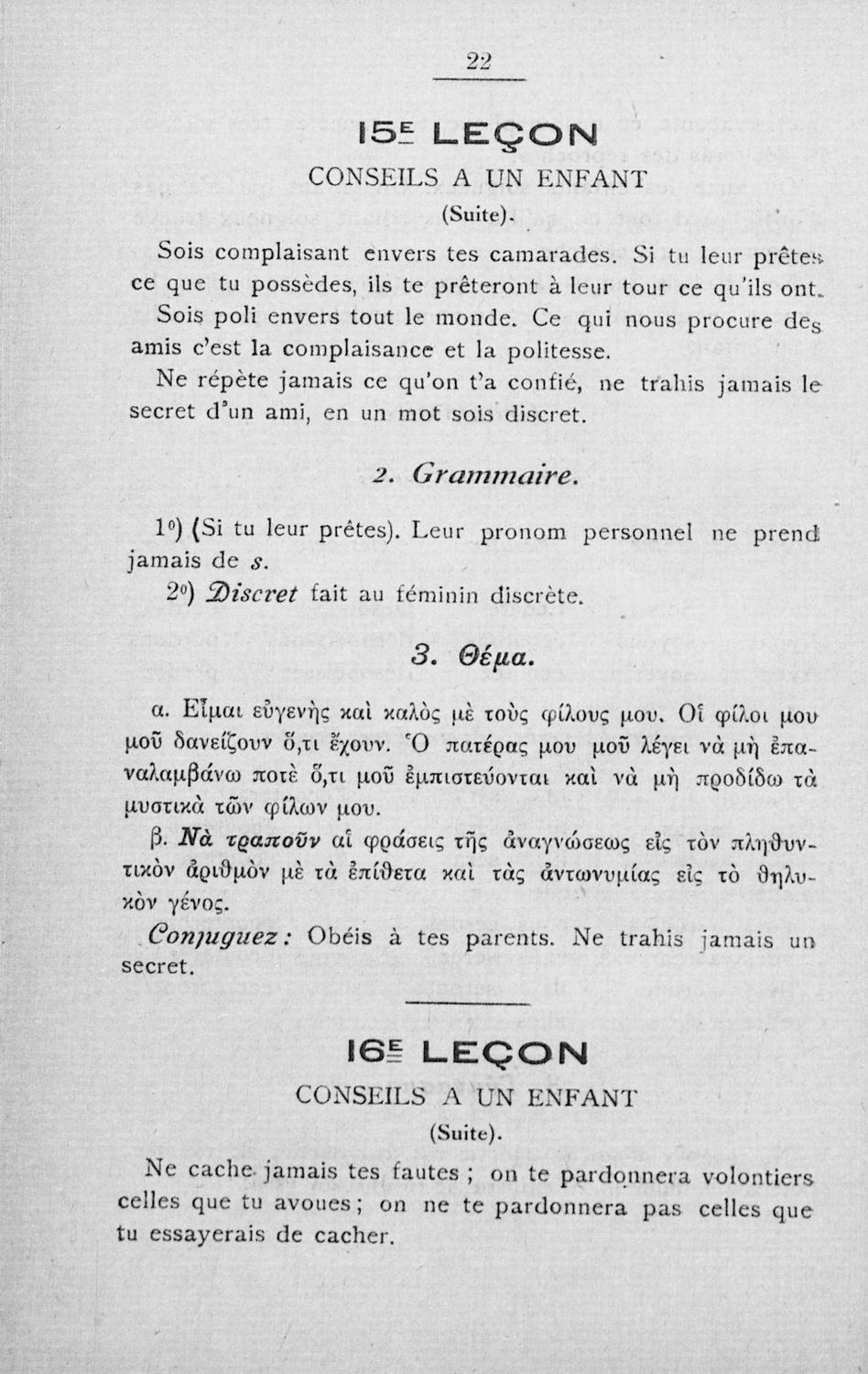 Γραμματική της Γαλλικής γλώσσας για τα Τετρατάξια Γυμνάσια, τη Γ΄ τάξη των Αστικών Σχολείων των Θηλέων και τα Διδασκαλεία της Δημοτικής Εκπαίδευσης που περιλαμβάνει θεωρία, ασκήσεις και λεξιλόγιο.