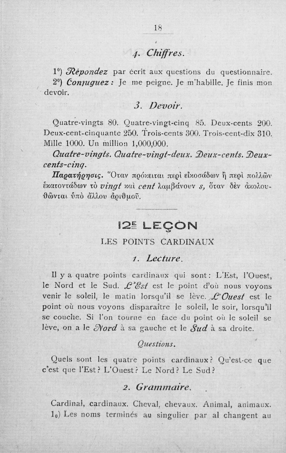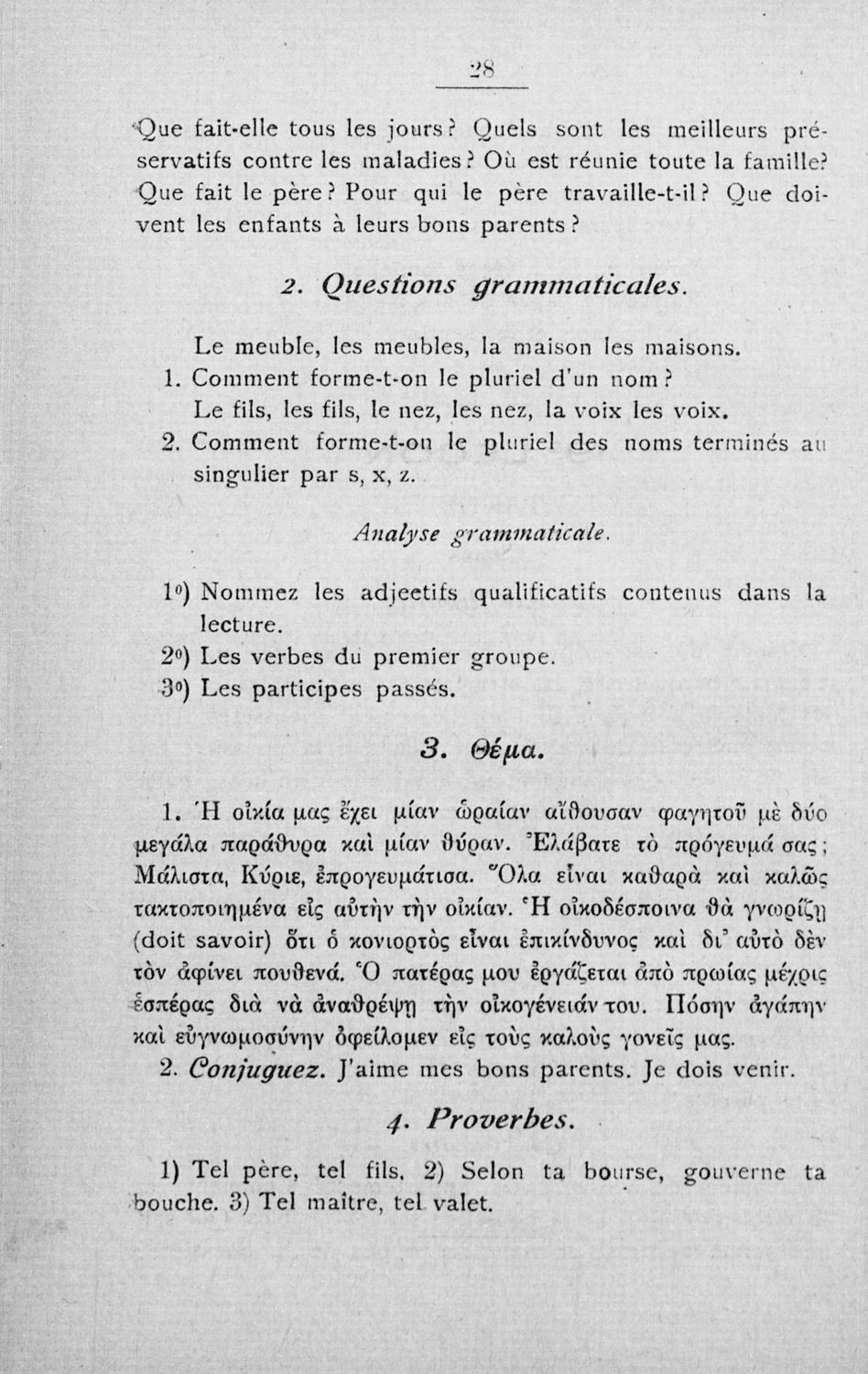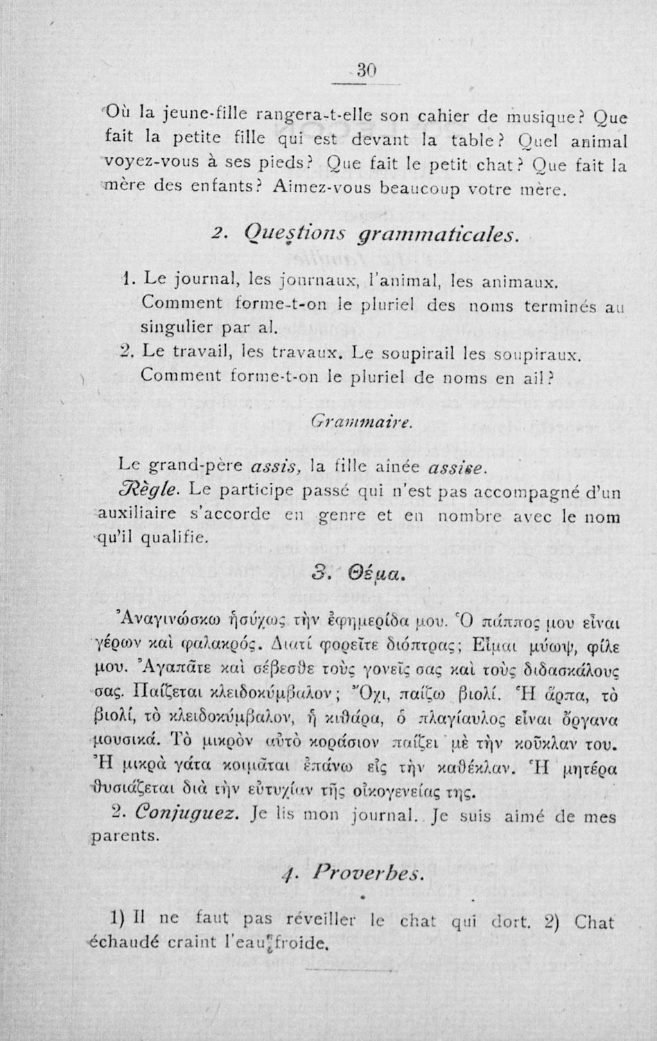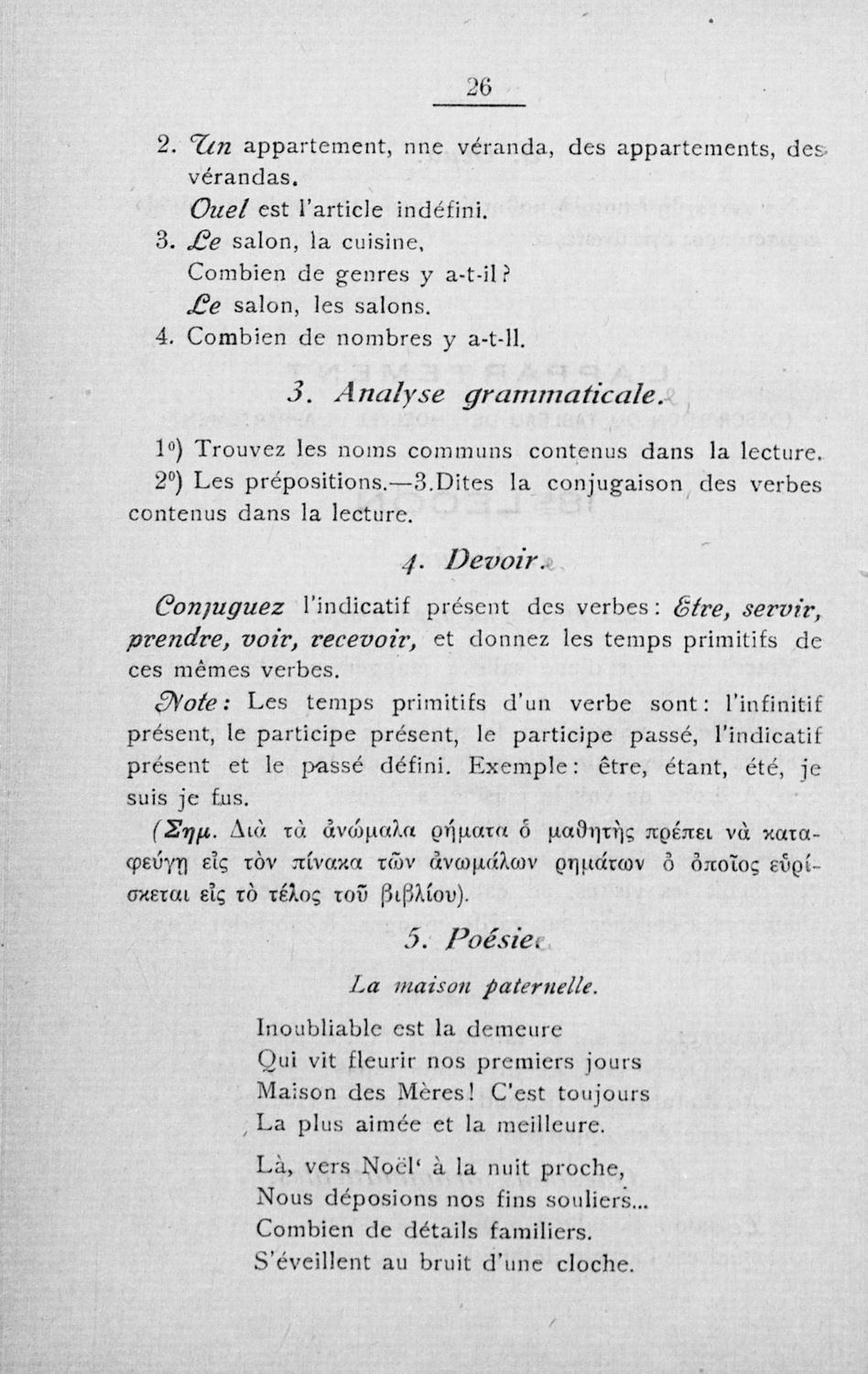 Σχολικό εγχειρίδιο Γαλλικών των Γυμνασίων, Αστικών Σχολείων θηλέων και Διδασκαλείων Δημοτικής Εκπαίδευσης. Κείμενα, ποιήματα, από εποχές και τον κοινωνικό και οικογενειακό βίο, τα οποία συνοδεύονται ασκήσεις γραμματικής συντακτικού.