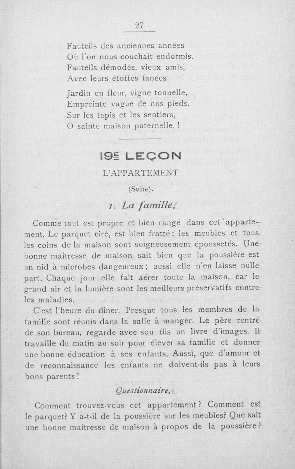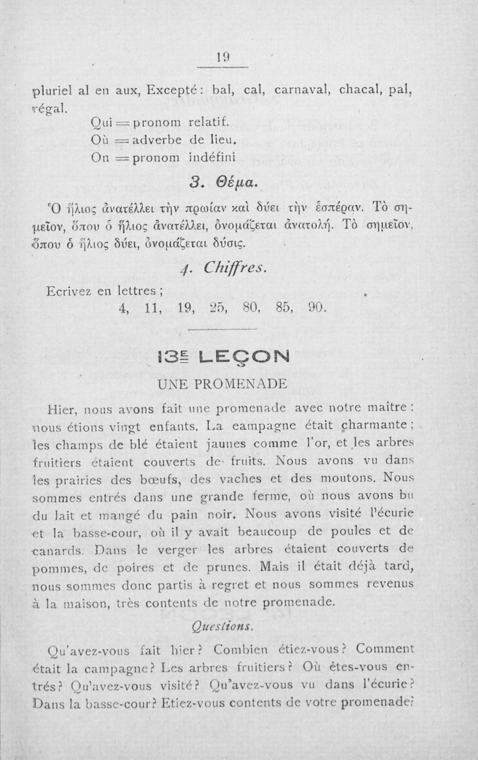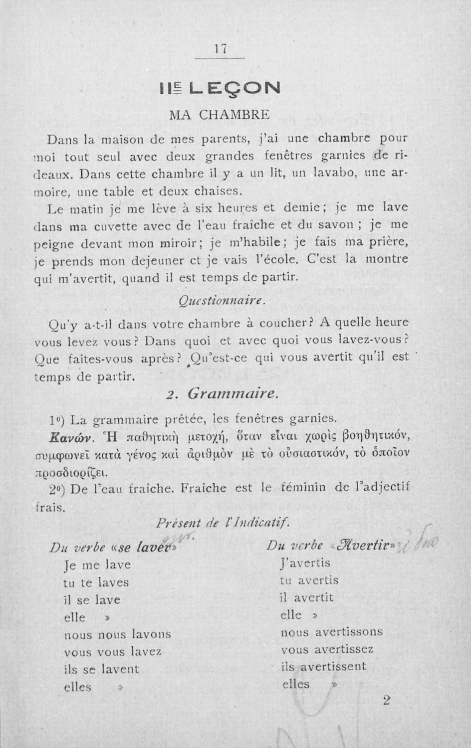 Παρουσίαση περιεχομένου: Σχολικό εγχειρίδιο Γαλλικών των Γυμνασίων, Αστικών Σχολείων θηλέων και Διδασκαλείων Δημοτικής Εκπαίδευσης. Κείμενα, ποιήματα, από εποχές και τον κοινωνικό και οικογενειακό βίο, τα οποία συνοδεύονται ασκήσεις γραμματικής συντακτικού.
