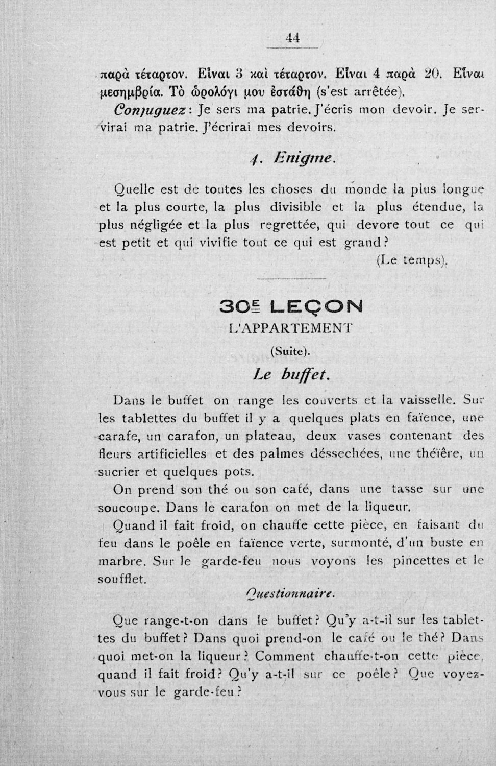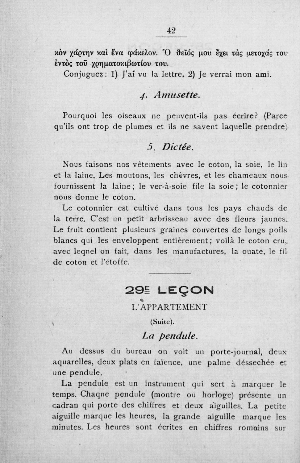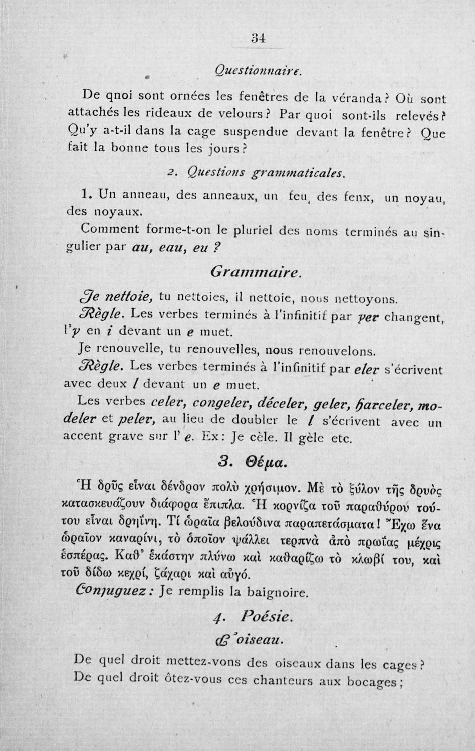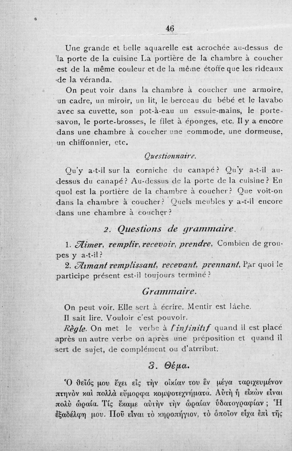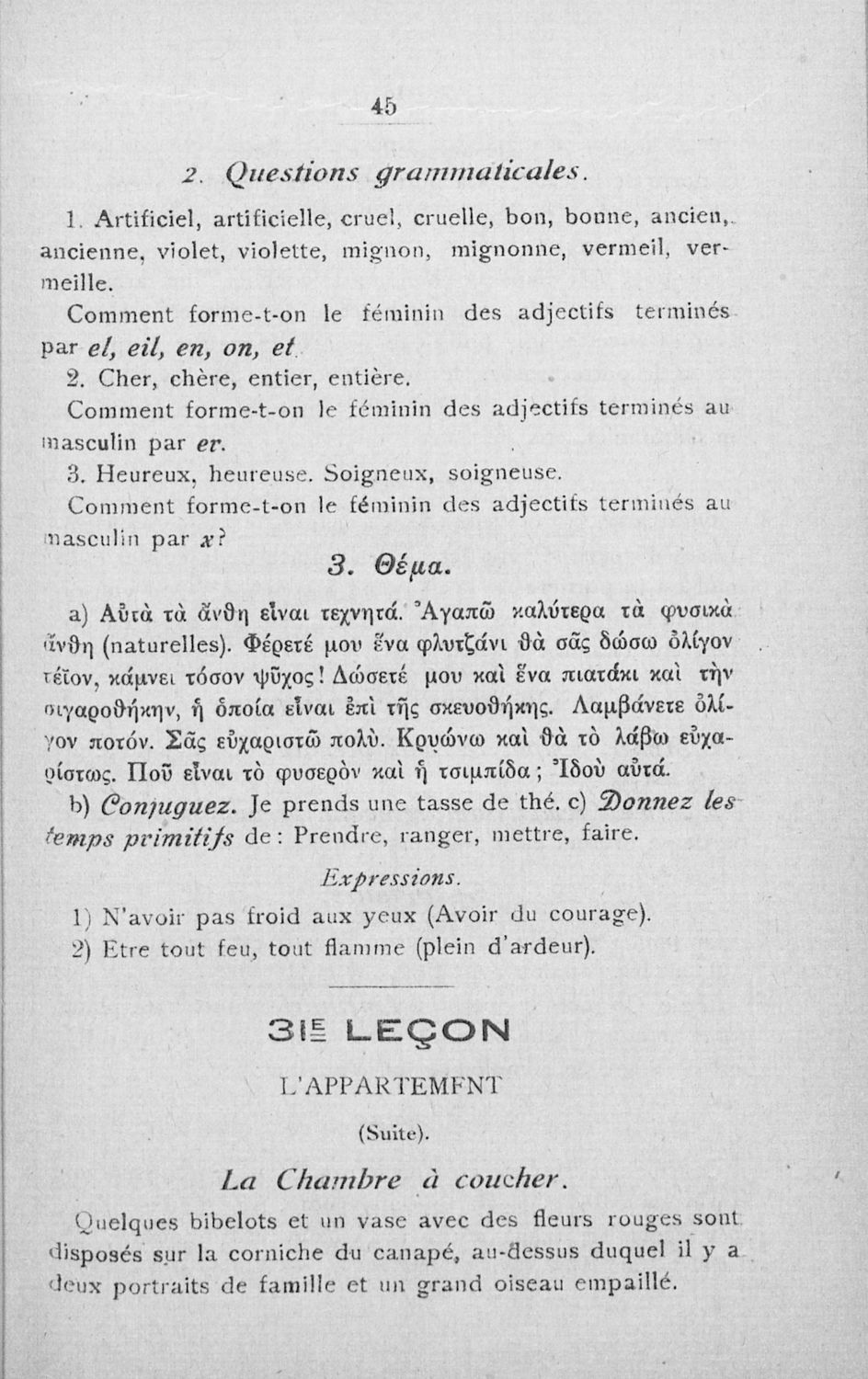 Σχολικό εγχειρίδιο Γαλλικών των Γυμνασίων, Αστικών Σχολείων θηλέων και Διδασκαλείων Δημοτικής Εκπαίδευσης. Κείμενα, ποιήματα, από εποχές και τον κοινωνικό και οικογενειακό βίο, τα οποία συνοδεύονται ασκήσεις γραμματικής συντακτικού.