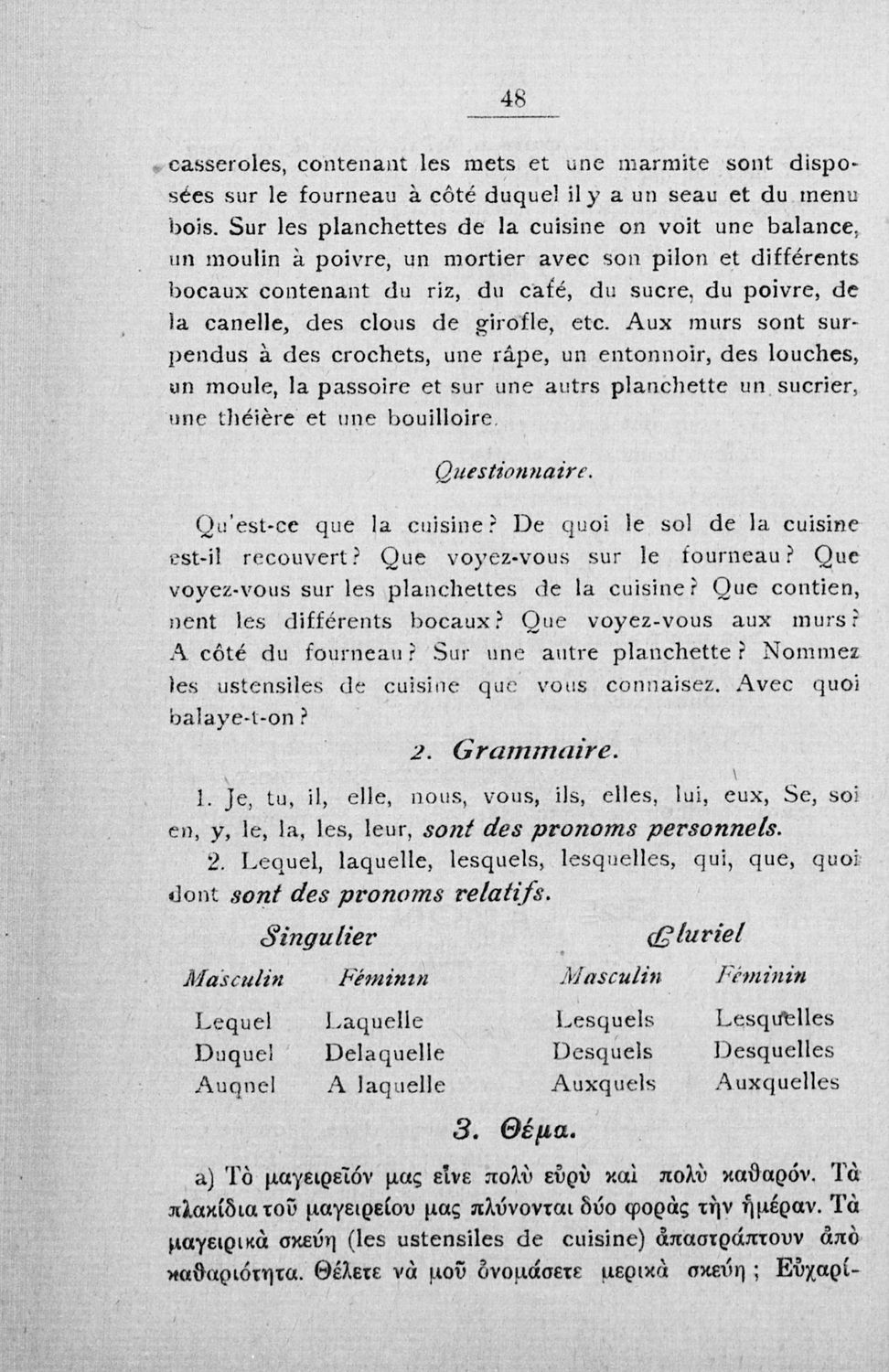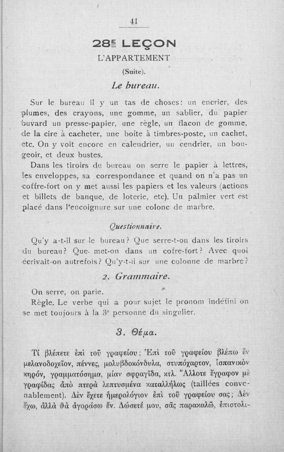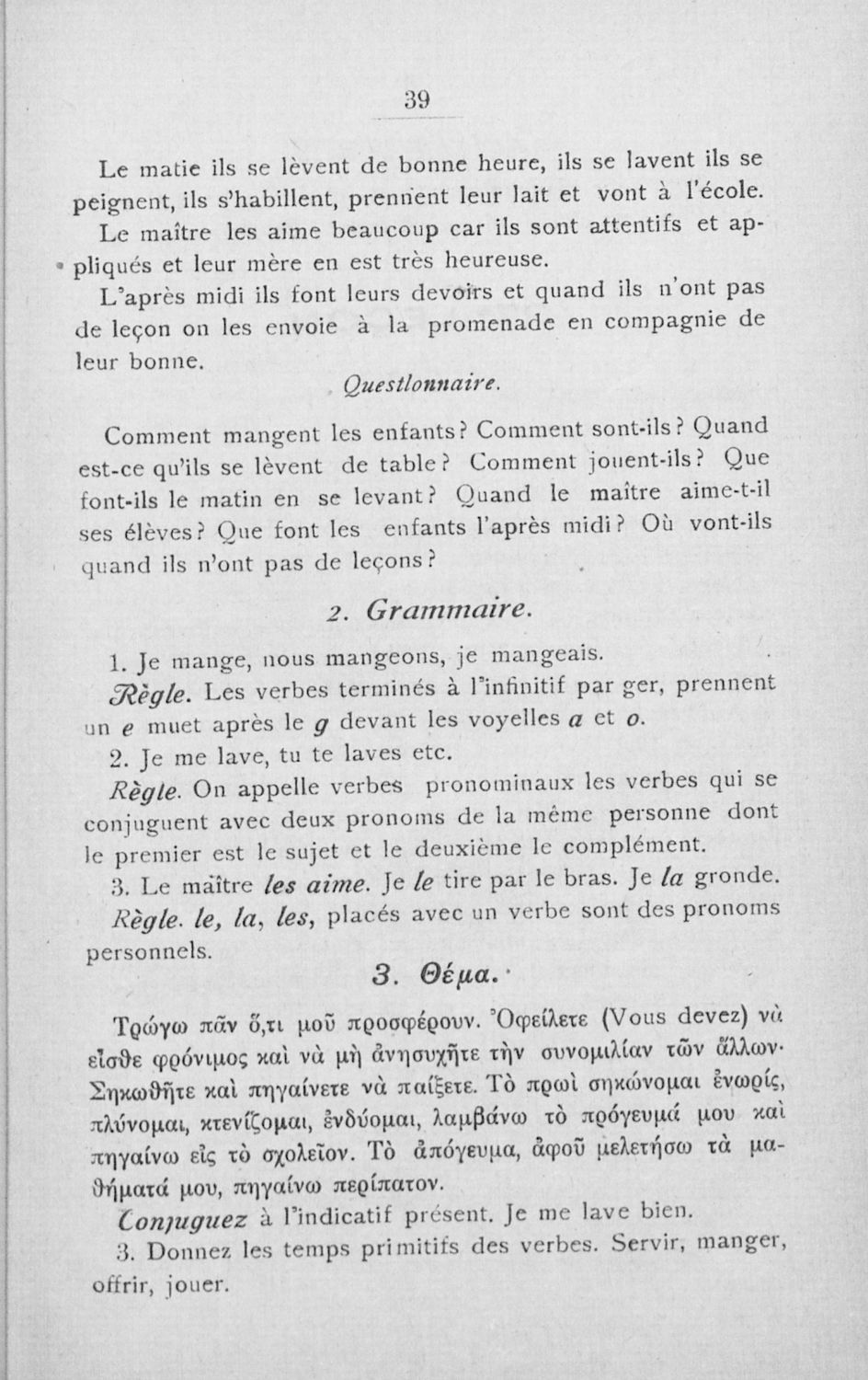 Γραμματική της Γαλλικής γλώσσας για τα Τετρατάξια Γυμνάσια, τη Γ΄ τάξη των Αστικών Σχολείων των Θηλέων και τα Διδασκαλεία της Δημοτικής Εκπαίδευσης που περιλαμβάνει θεωρία, ασκήσεις και λεξιλόγιο.