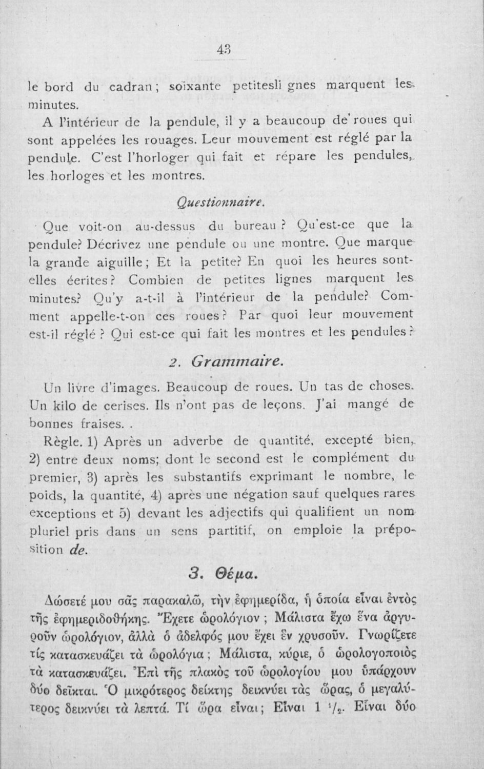 Σχολικό εγχειρίδιο Γαλλικών για τα Γυμνάσια, Αστικά Σχολεία και Διδασκαλεία που περιλαμβάνει τη γραμματική και το συντακτικό της γαλλικής γλώσσας, παραδείγματα και ασκήσεις.