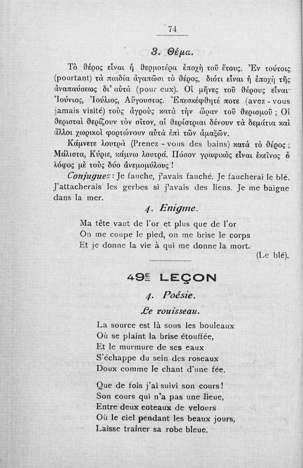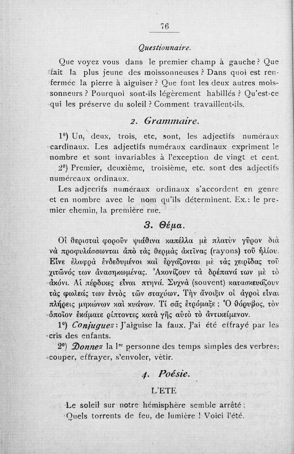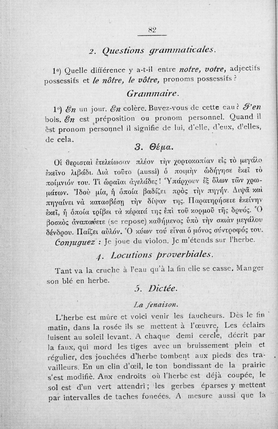 Σχολικό εγχειρίδιο Γαλλικών των Γυμνασίων, Αστικών Σχολείων θηλέων και Διδασκαλείων Δημοτικής Εκπαίδευσης. Κείμενα, ποιήματα, από εποχές και τον κοινωνικό και οικογενειακό βίο, τα οποία συνοδεύονται ασκήσεις γραμματικής συντακτικού.