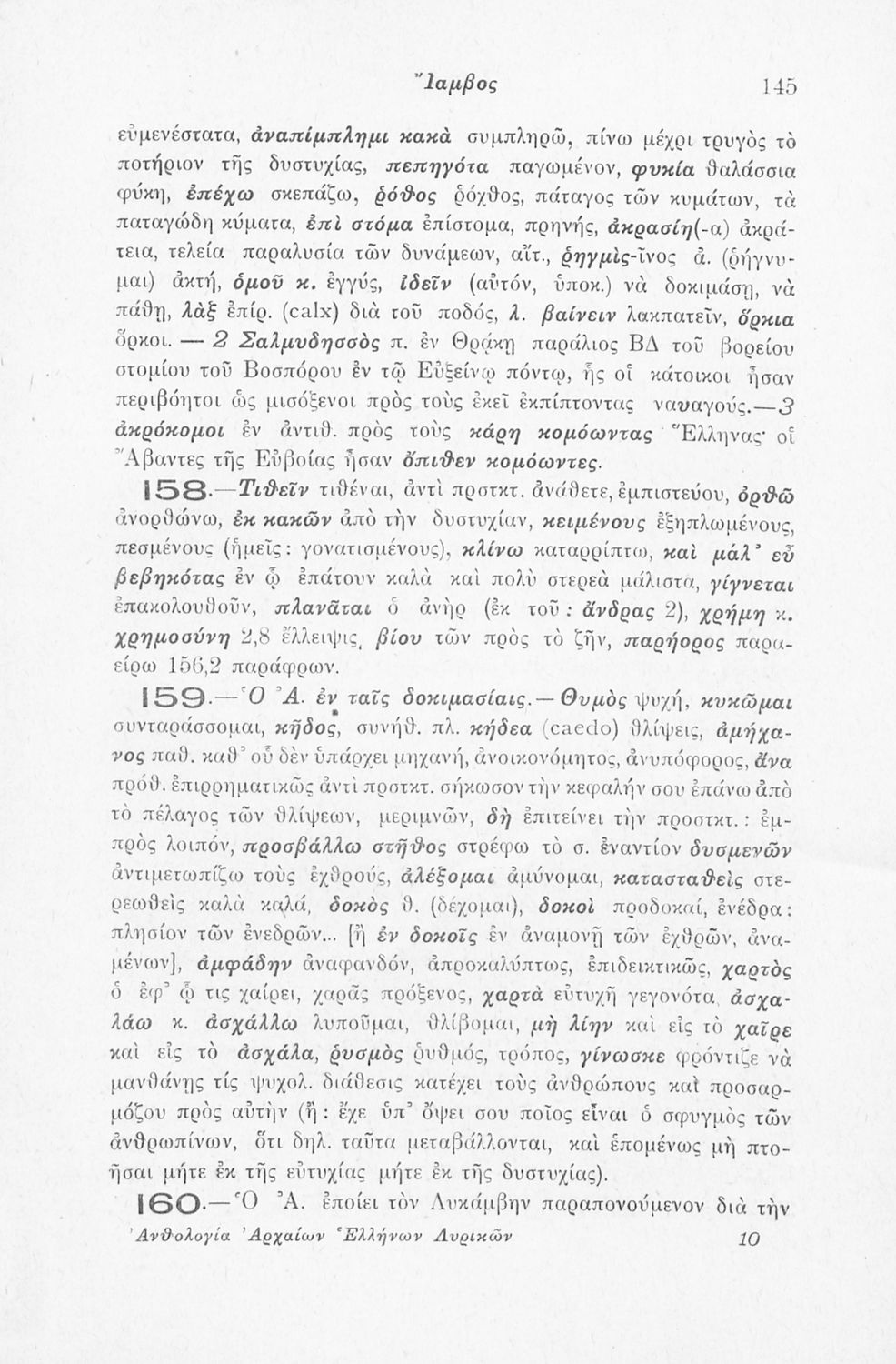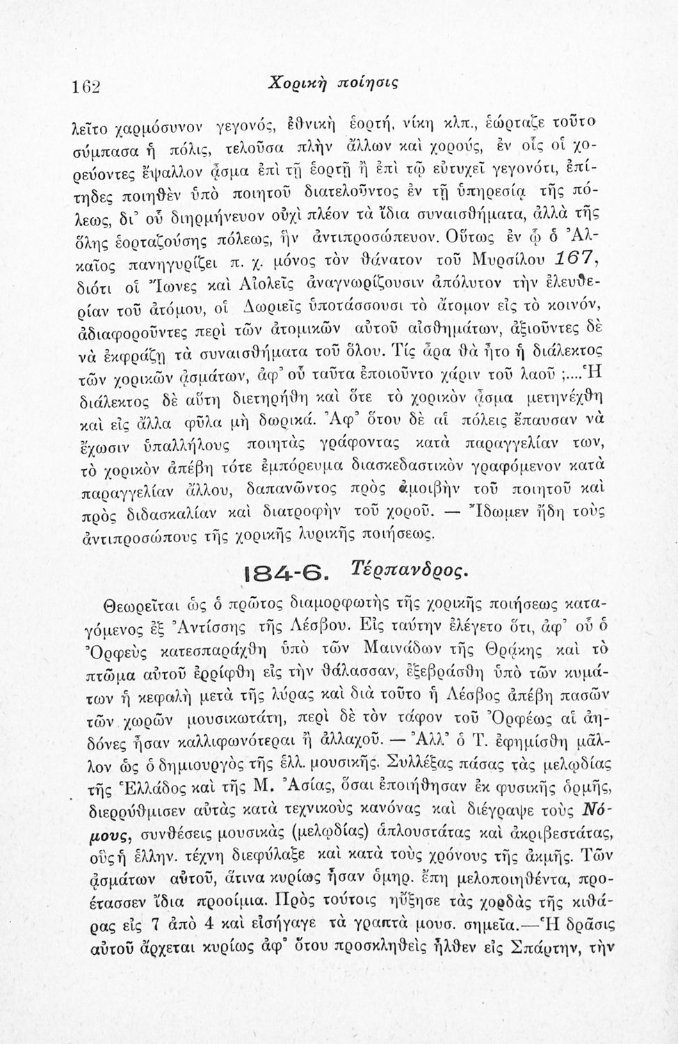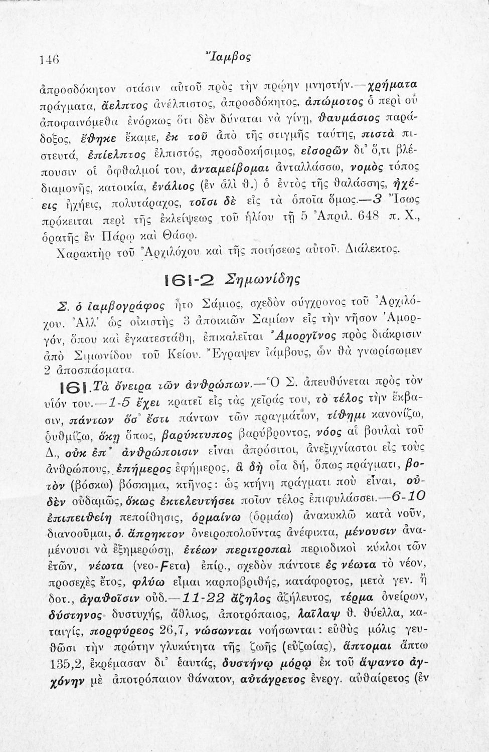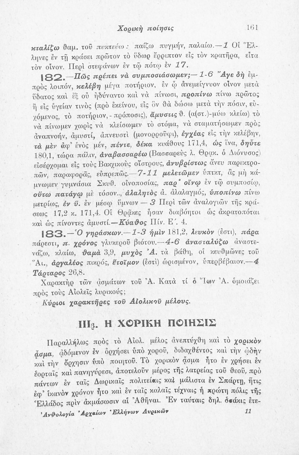 Μαθητικό βοήθημα Αρχαίων Ελληνικών που περιλαμβάνει αποσπάσματα έργων αρχαίων Ελλήνων λυρικών, πολιτικές και γνωμικές ελεγείες, ιάμβους και επιγράμματα. Περιέχει και υπόμνημα με ερμηνευτικά, πραγματολογικά, γλωσσικά και γραμματικά σχόλια.