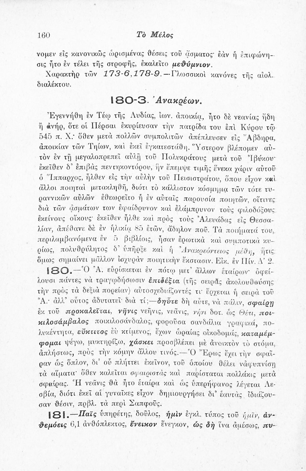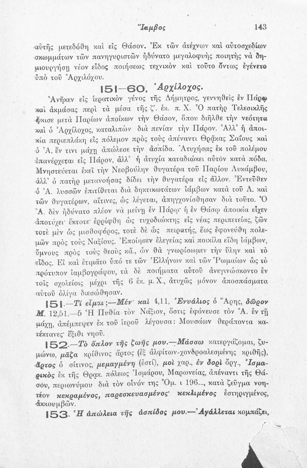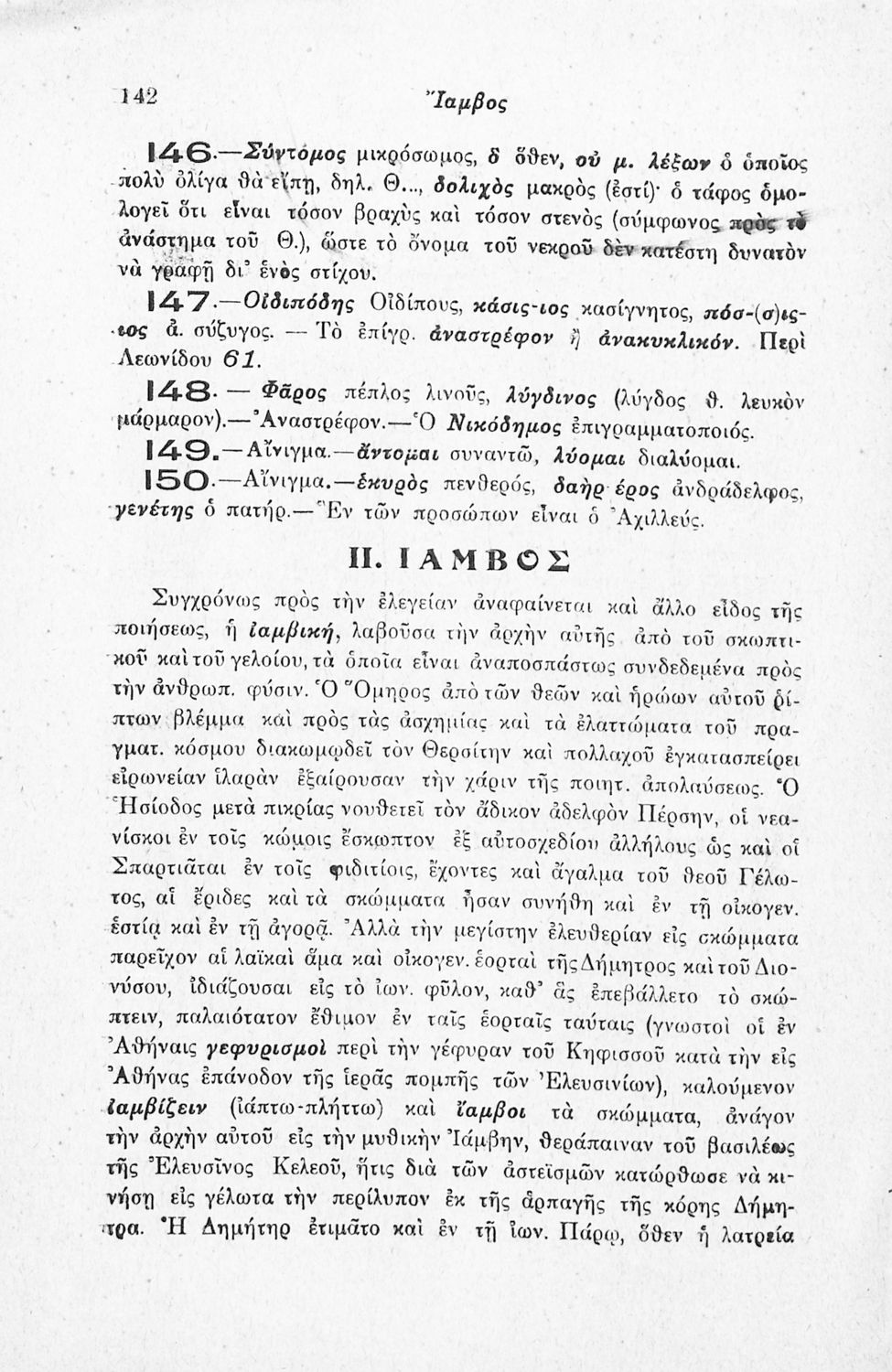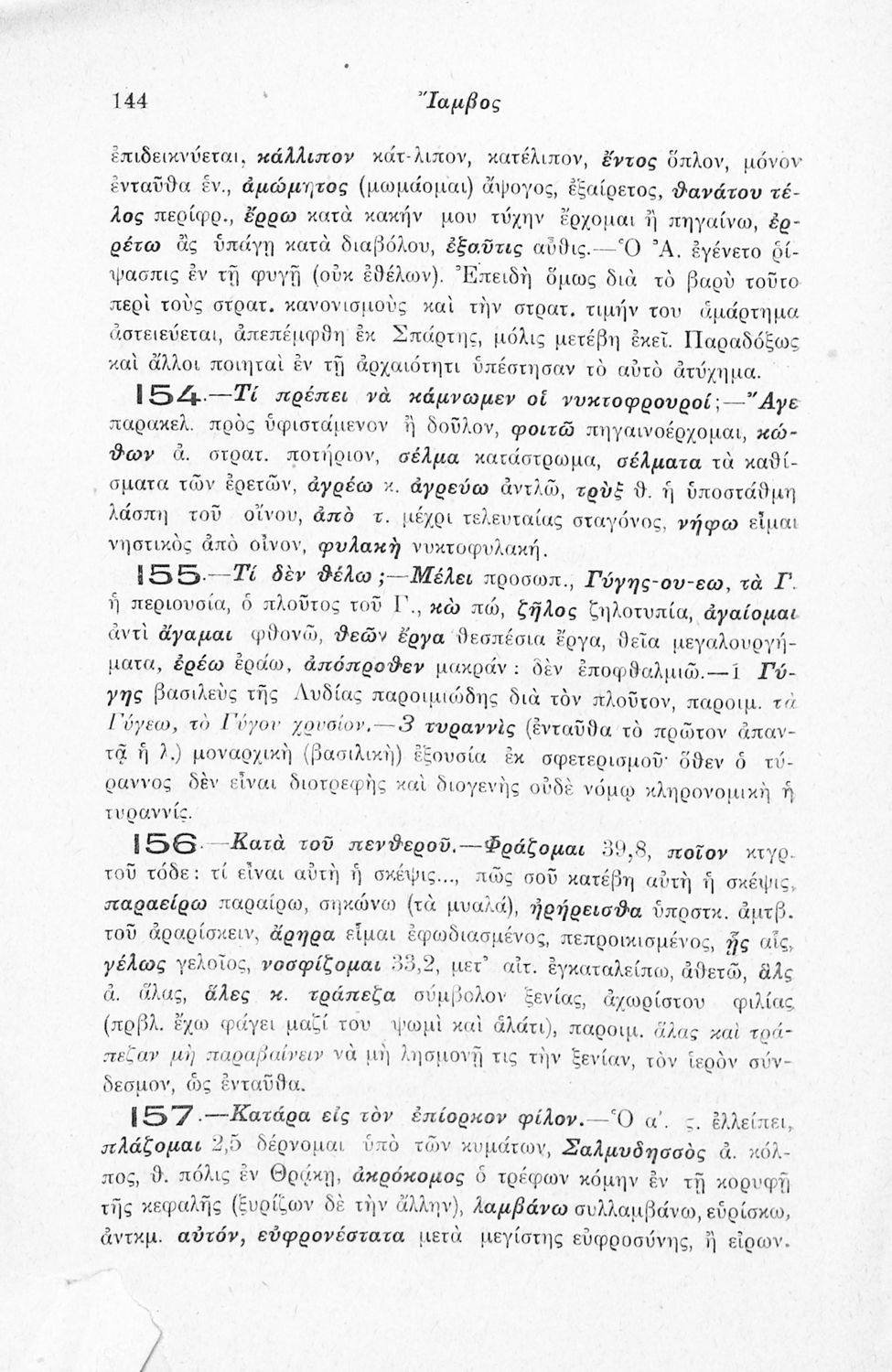 Μαθητικό βοήθημα Αρχαίων Ελληνικών που περιλαμβάνει αποσπάσματα έργων αρχαίων Ελλήνων λυρικών, πολιτικές και γνωμικές ελεγείες, ιάμβους και επιγράμματα. Περιέχει και υπόμνημα με ερμηνευτικά, πραγματολογικά, γλωσσικά και γραμματικά σχόλια.
