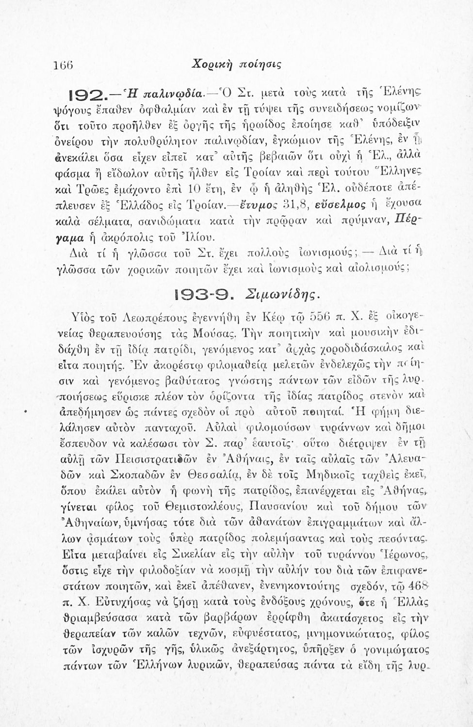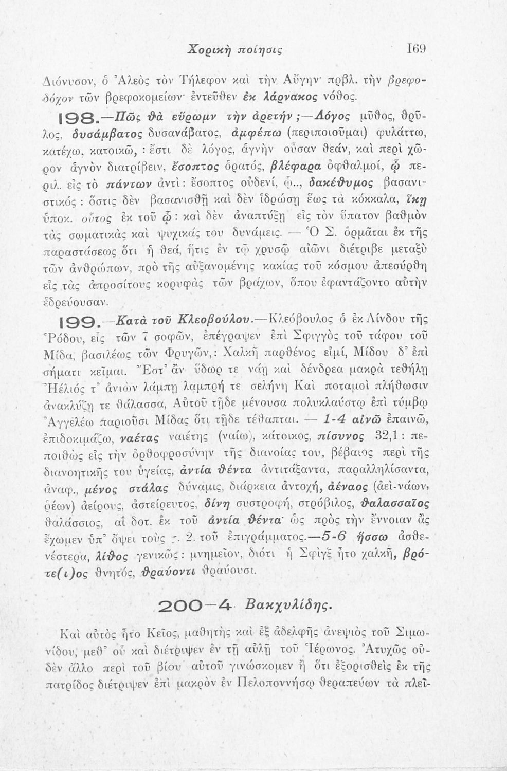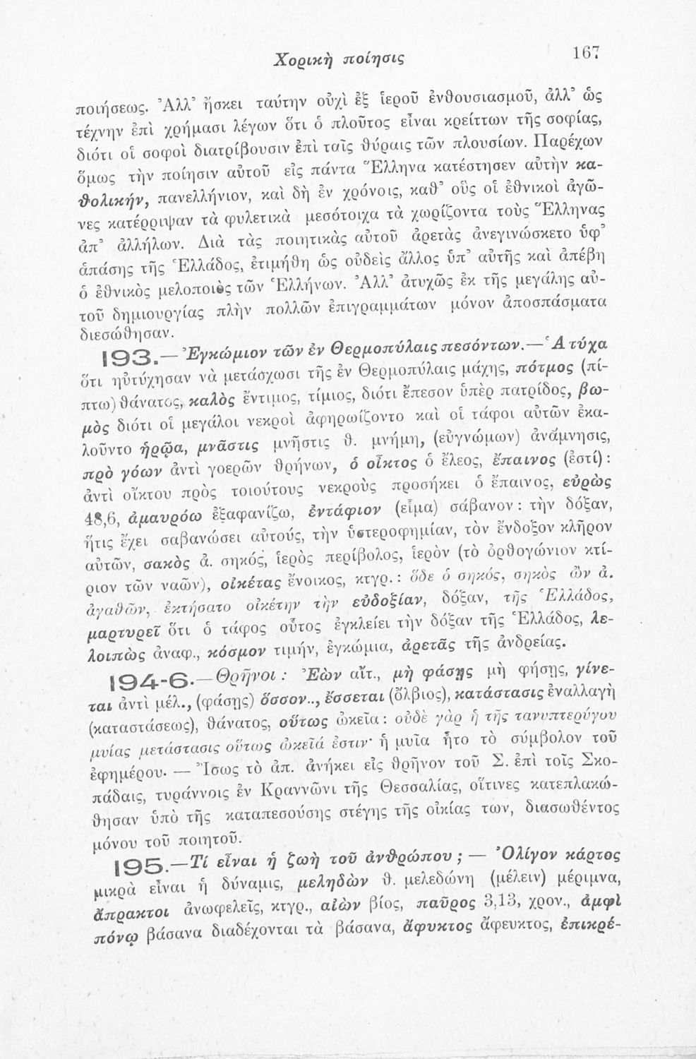 Μαθητικό βοήθημα Αρχαίων Ελληνικών που περιλαμβάνει αποσπάσματα έργων αρχαίων Ελλήνων λυρικών, πολιτικές και γνωμικές ελεγείες, ιάμβους και επιγράμματα. Περιέχει και υπόμνημα με ερμηνευτικά, πραγματολογικά, γλωσσικά και γραμματικά σχόλια.