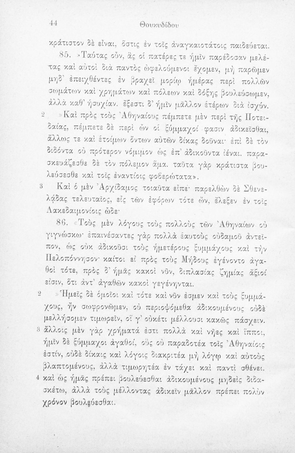 Σχολικό εγχειρίδιο Αρχαίων Ελληνικών για τις Β΄ και Γ΄ Γυμνασίου που περιλαμβάνει σύντομο βιογραφικό σημείωμα του Θουκυδίδη, εισαγωγικά σχόλια στο έργο, κείμενο και ετυμολογικό λεξιλόγιο.