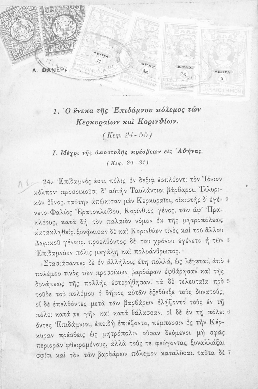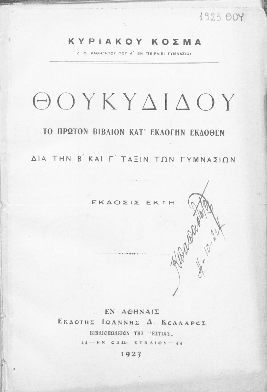 Τίτλος: Θουκυδίδου Το πρώτον βιβλίον κατ' εκλογήν εκδοθέν δια την Β΄ και Γ΄ τάξιν των Γυμνασίων