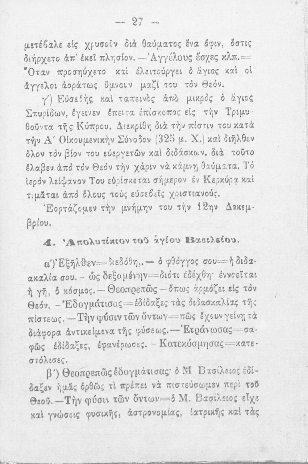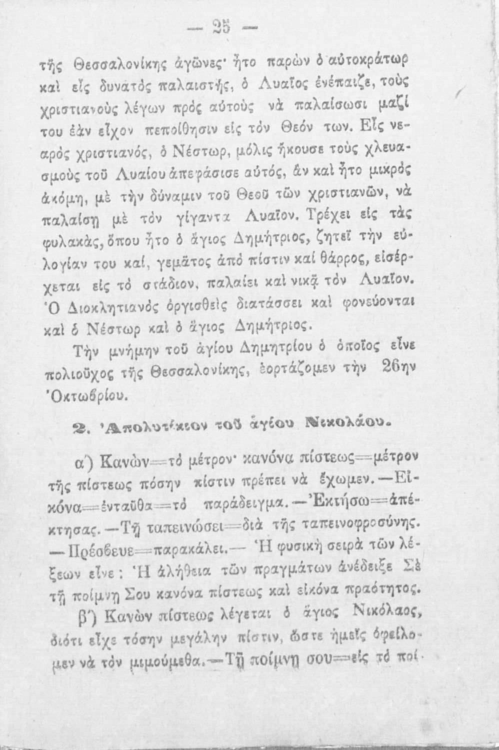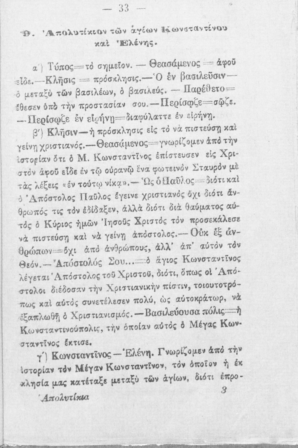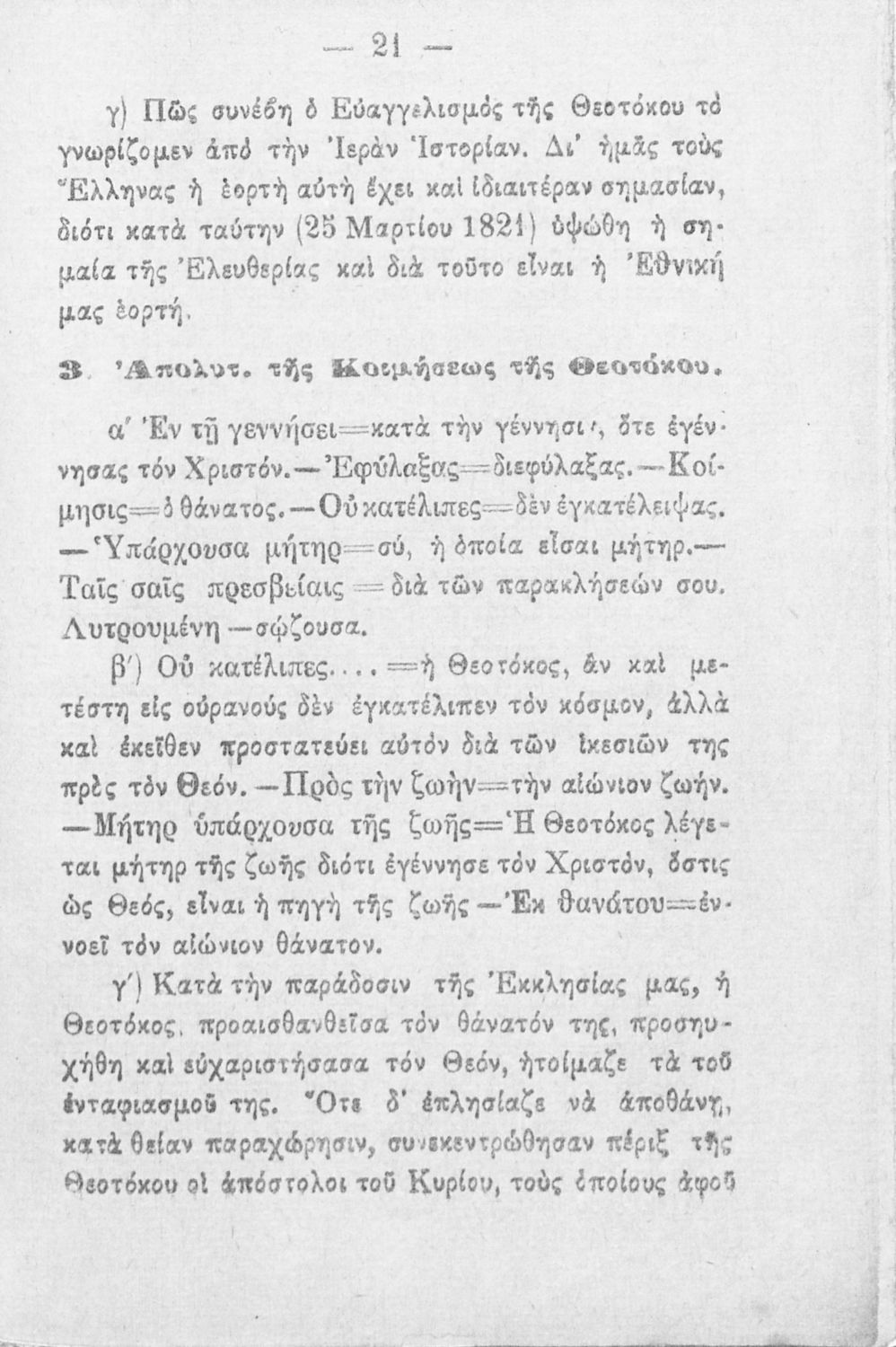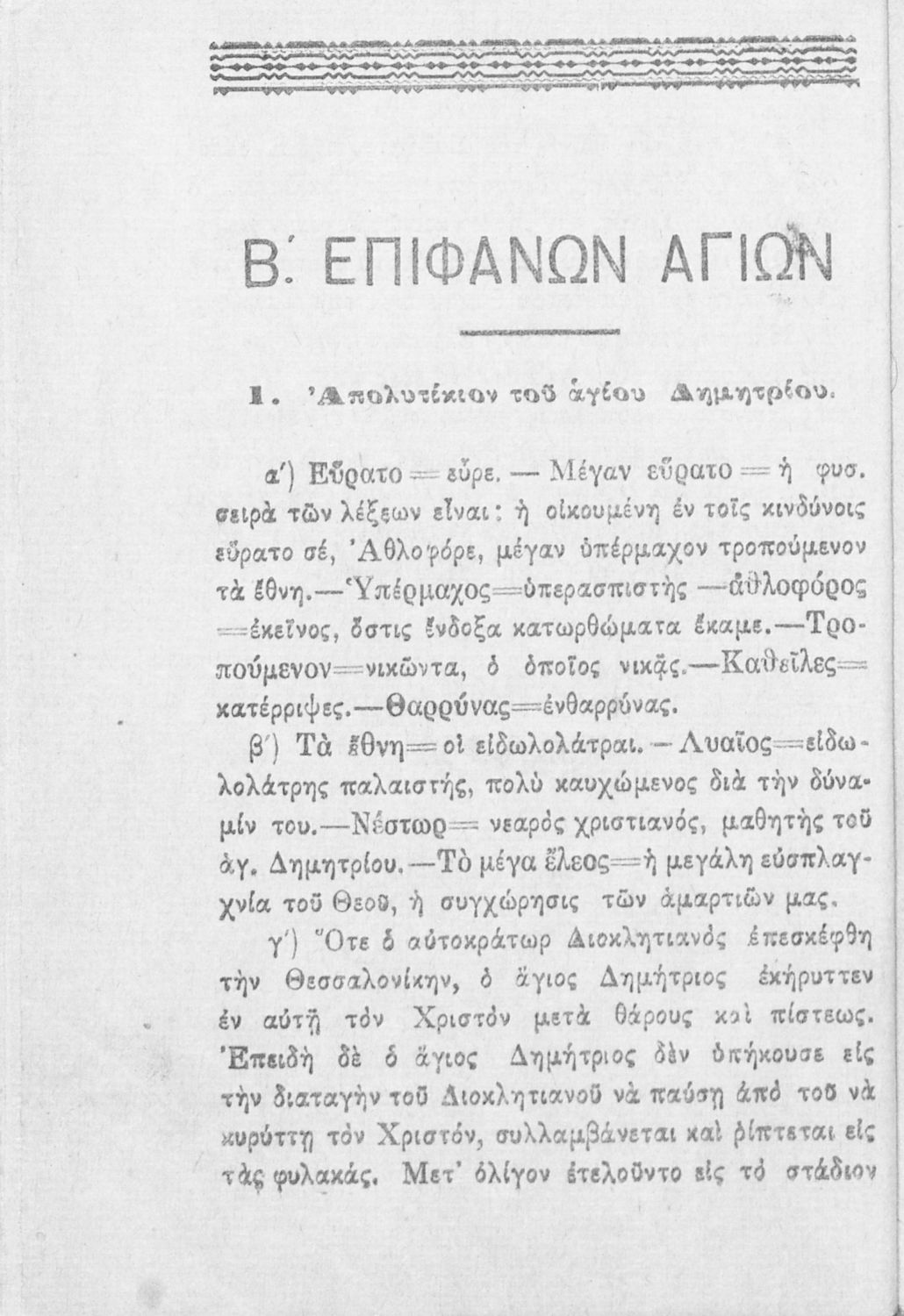 Σχολικό εγχειρίδιο Θρησκευτικών για την Α' Ελληνικού Σχολείου και Παρθεναγωγείου που περιέχει τα απολυτίκια των Θεομητορικών εορτών, των επιφανών Αγίων, αναφορές στις εορτές της Εκκλησίας και ερμηνευτικές σημειώσεις.