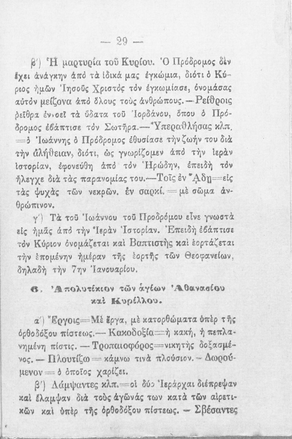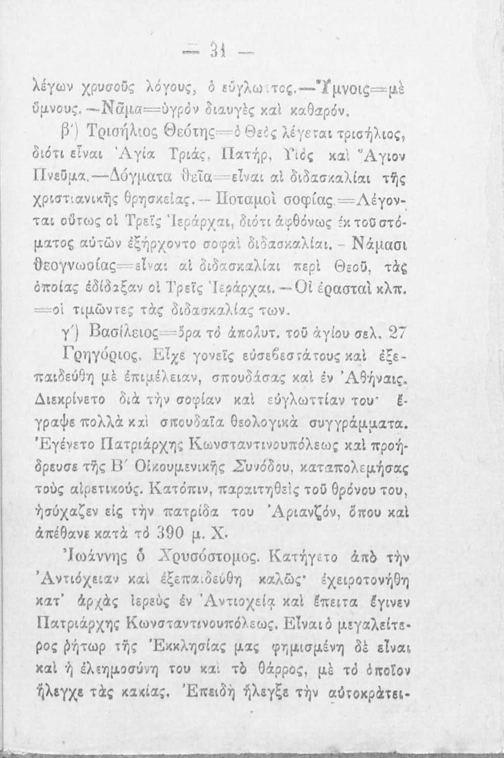 Βαθμίδα εκπαίδευσης: Δευτεροβάθμια Τάξη: Α' Ελληνικού Σχολείου / Παρθεναγωγείο Μάθημα: Θρησκευτικά Γλώσσα: Καθαρεύουσα Παρουσίαση περιεχομένου: Σχολικό εγχειρίδιο Θρησκευτικών για την Α' Ελληνικού Σχολείου και Παρθεναγωγείου που περιέχει τα απολυτίκια των Θεομητορικών εορτών, των επιφανών Αγίων, αναφορές στις εορτές της Εκκλησίας και ερμηνευτικές σημειώσεις. |