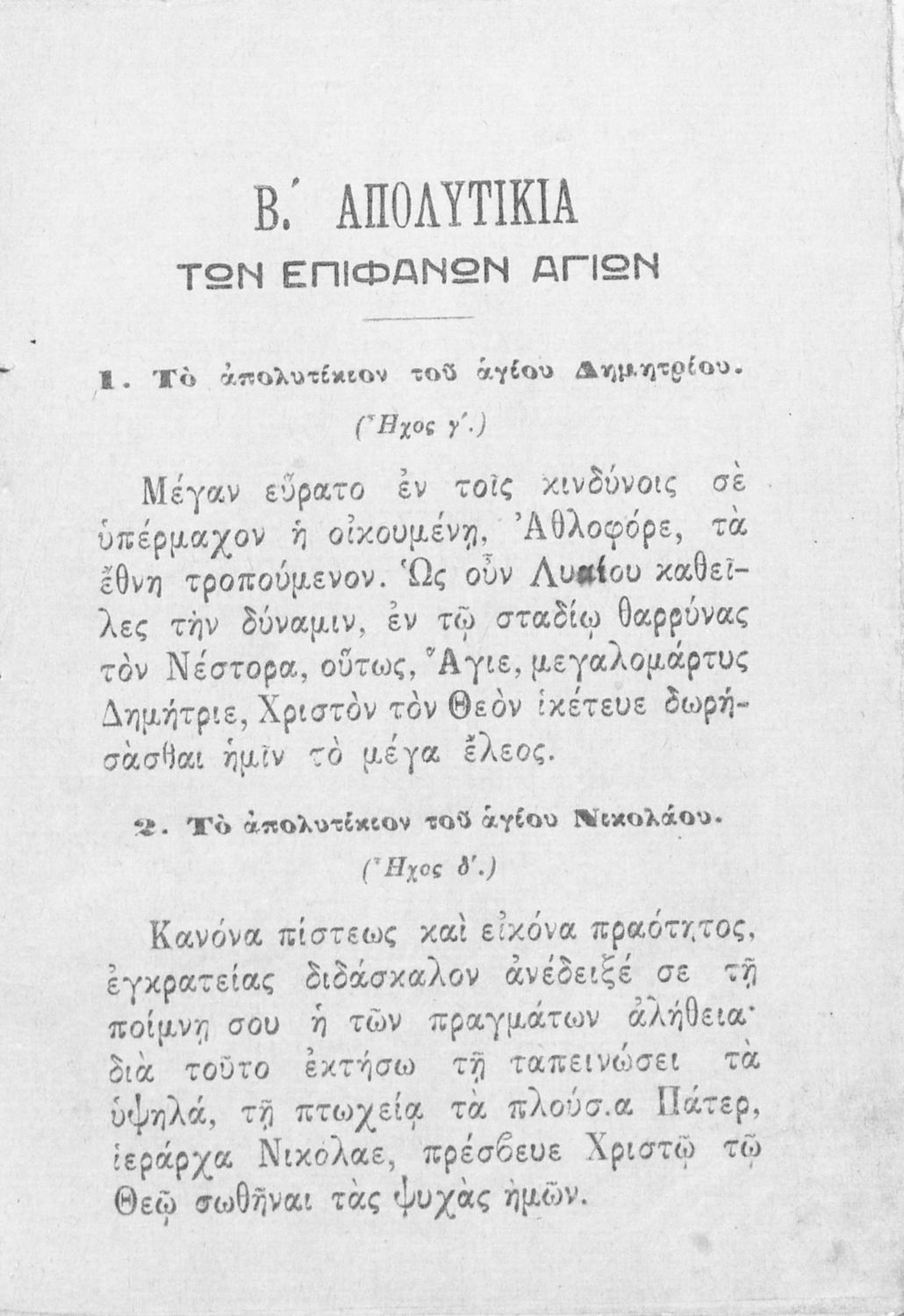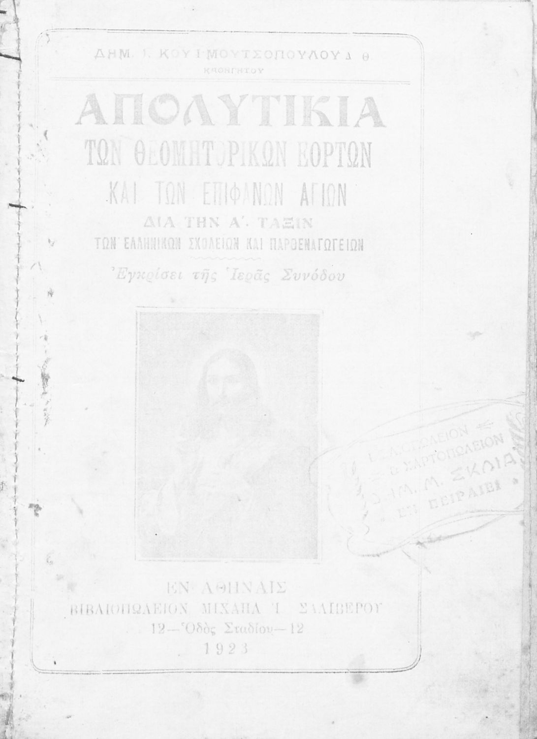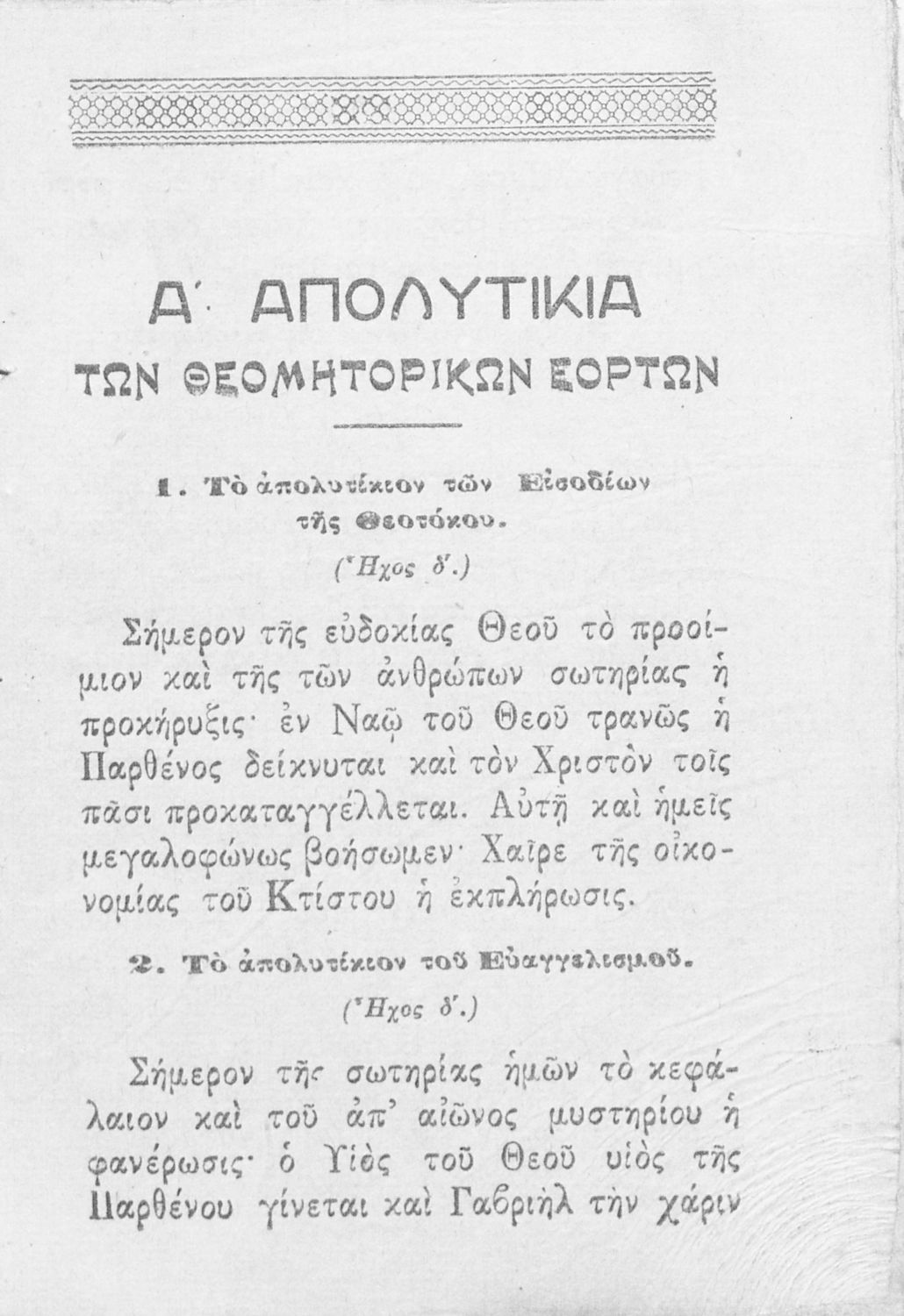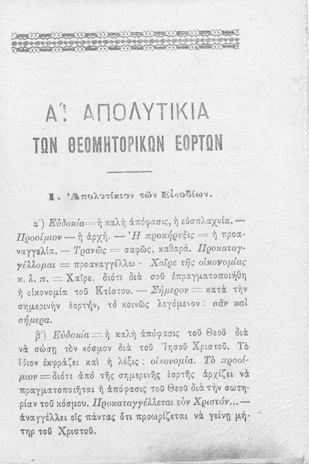 Σχολικό εγχειρίδιο Θρησκευτικών για την Α' Ελληνικού Σχολείου και Παρθεναγωγείου που περιέχει τα απολυτίκια των Θεομητορικών εορτών, των επιφανών Αγίων, αναφορές στις εορτές της Εκκλησίας και ερμηνευτικές σημειώσεις.