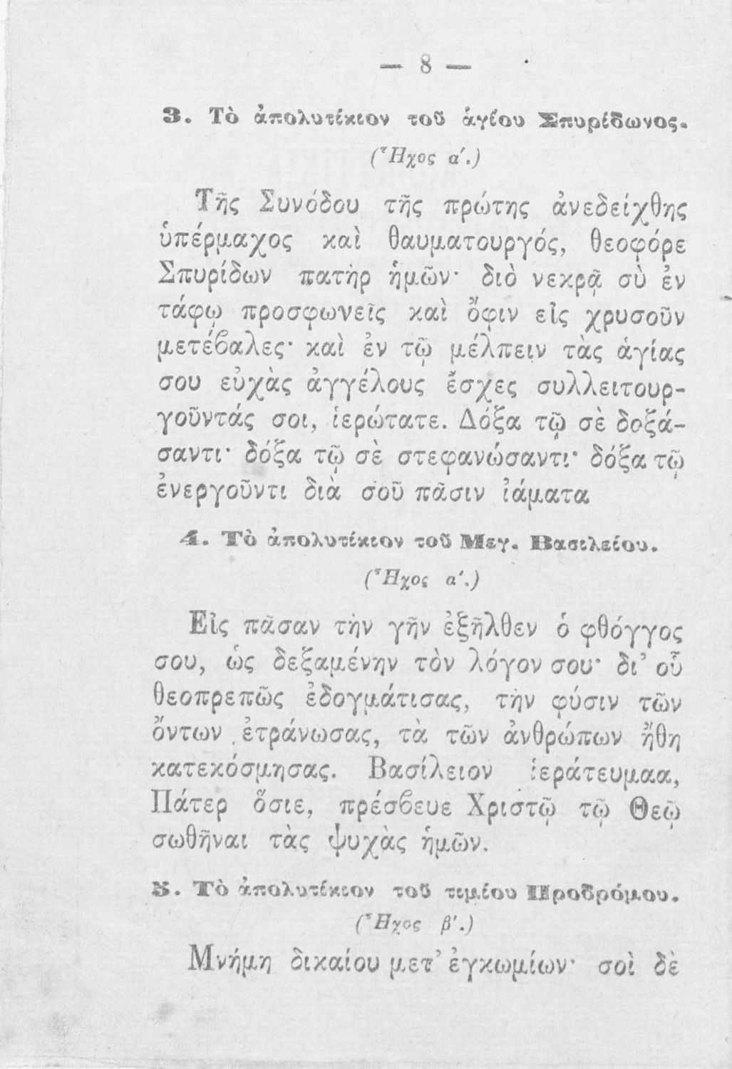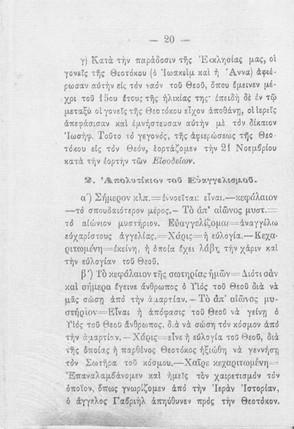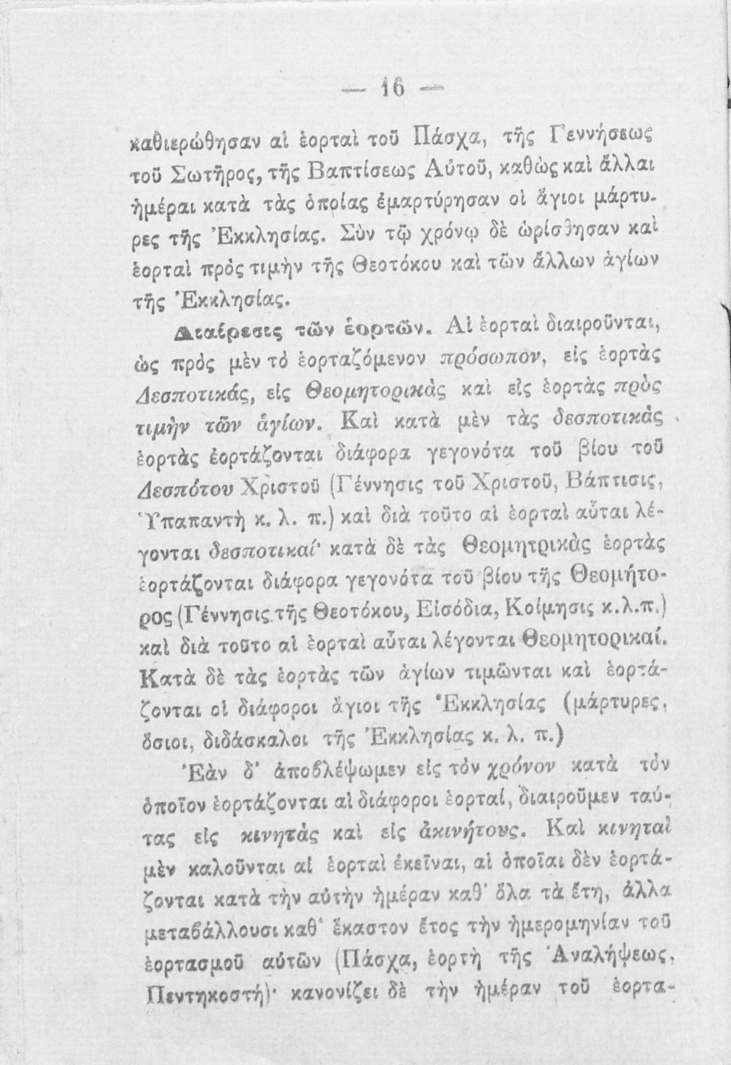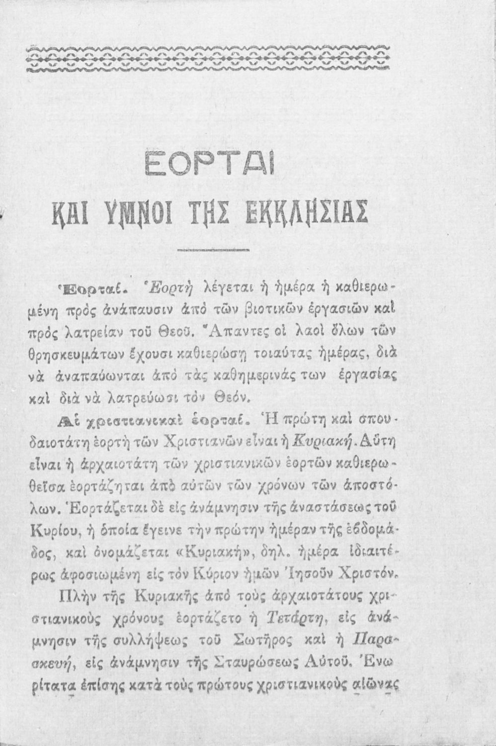 Σχολικό εγχειρίδιο Θρησκευτικών για την Α' Ελληνικού Σχολείου και Παρθεναγωγείου που περιέχει τα απολυτίκια των Θεομητορικών εορτών, των επιφανών Αγίων, αναφορές στις εορτές της Εκκλησίας και ερμηνευτικές σημειώσεις.